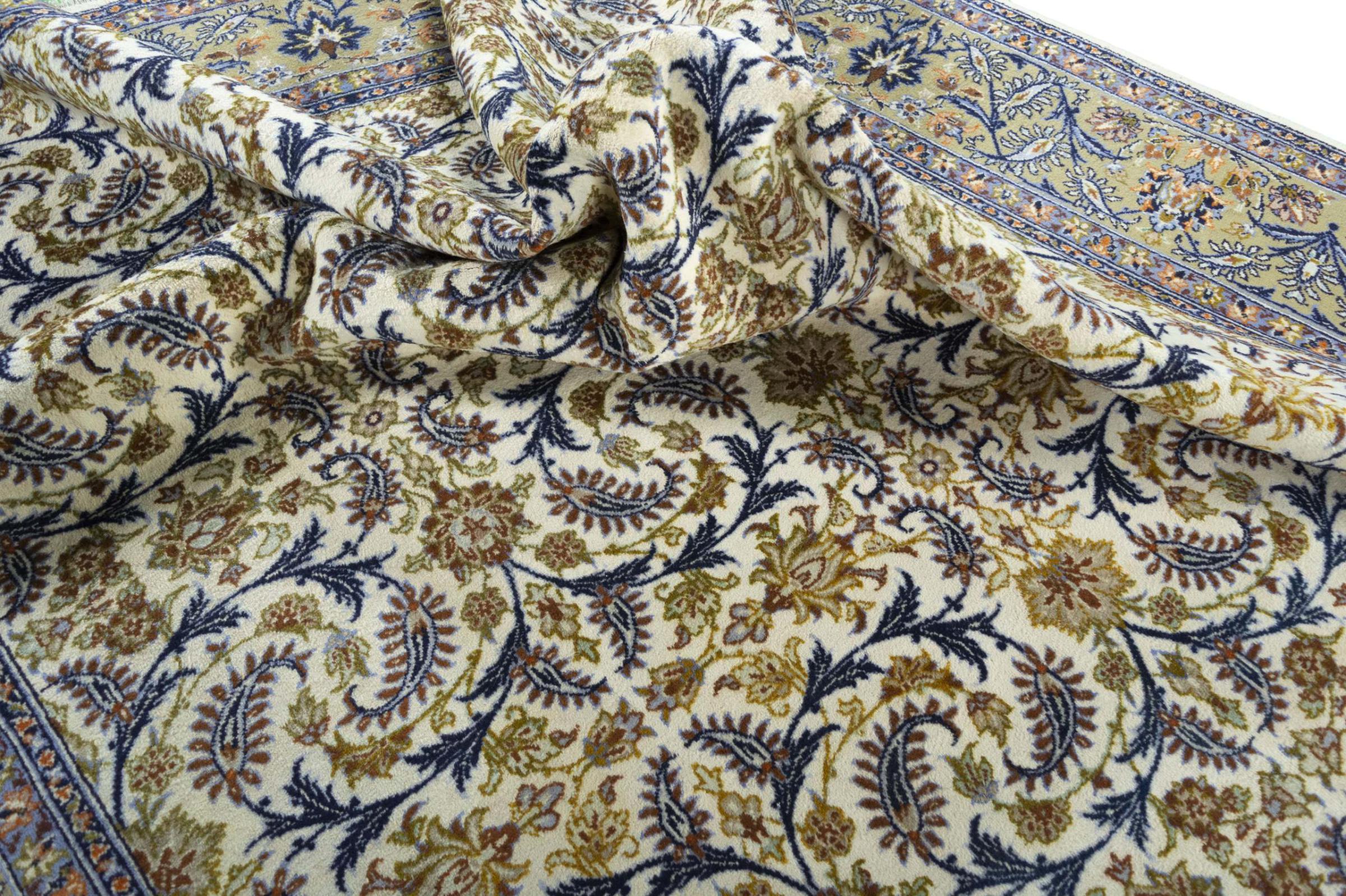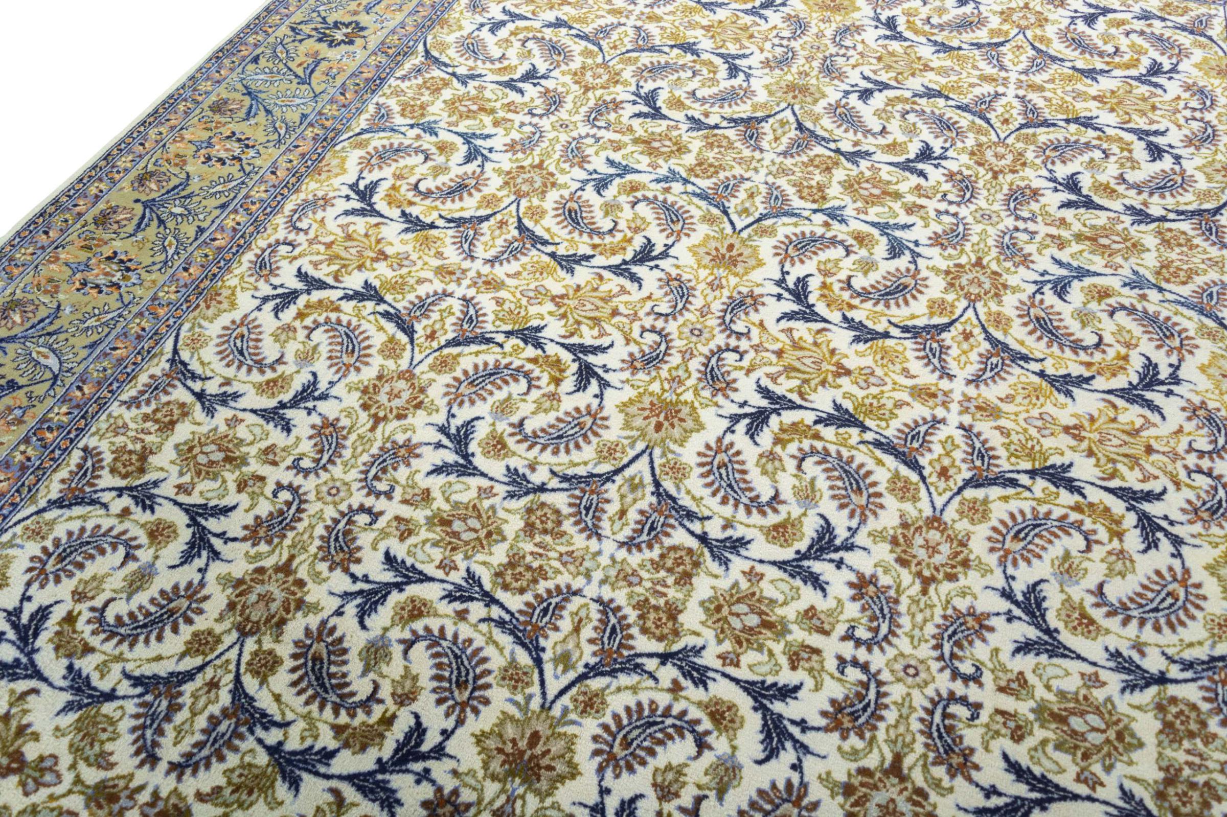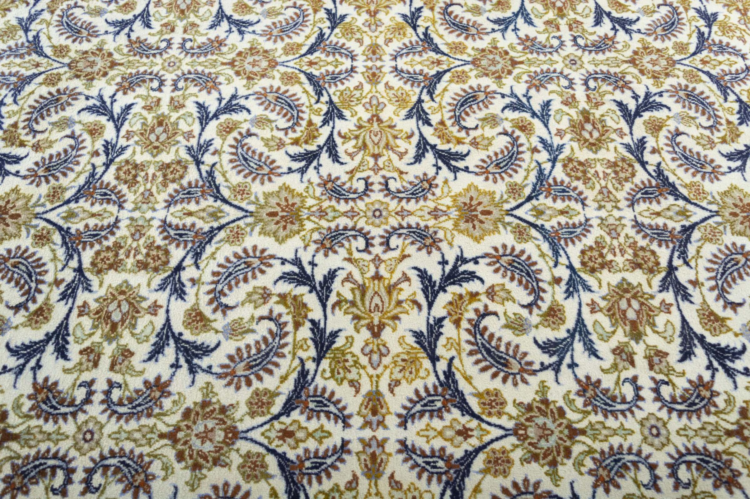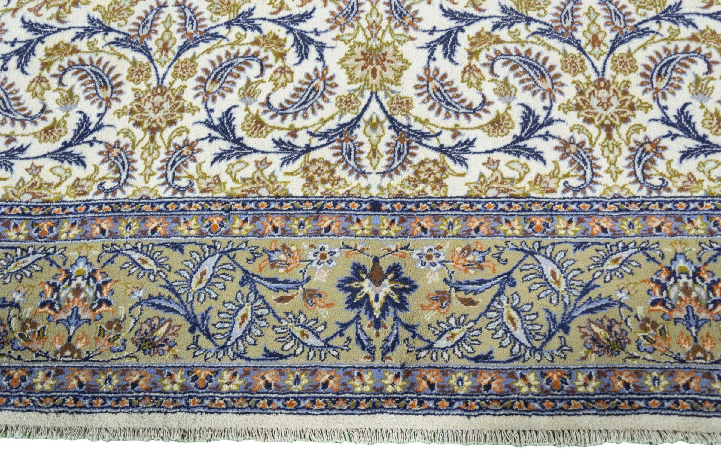 This carpet from Kashan (Keshan) is held in its very traditional and typical Persian design with beautiful ornaments. Kashan rugs are highly popular due to their exceptionally elegant design. These carpets originate from Kashan, a city on the ancient Silk Road. This carpet has been knotted by hand from high grade sheep wool and is going to be an one-of-a-kind highlight in your home.