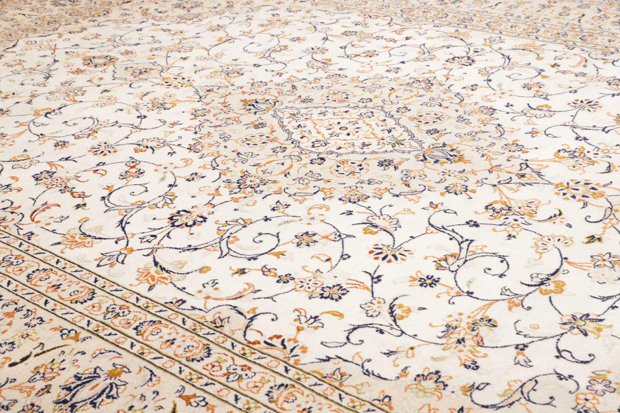 This carpet from Kashan (Keshan) is held in its very traditional and typical Persian design with beautiful ornaments. Kashan rugs are highly popular due to their exceptionally elegant design. These carpets originate from Kashan, a city on the ancient Silk Road. This carpet has been knotted by hand from high grade sheep wool and is going to be an one-of-a-kind highlight in your home.