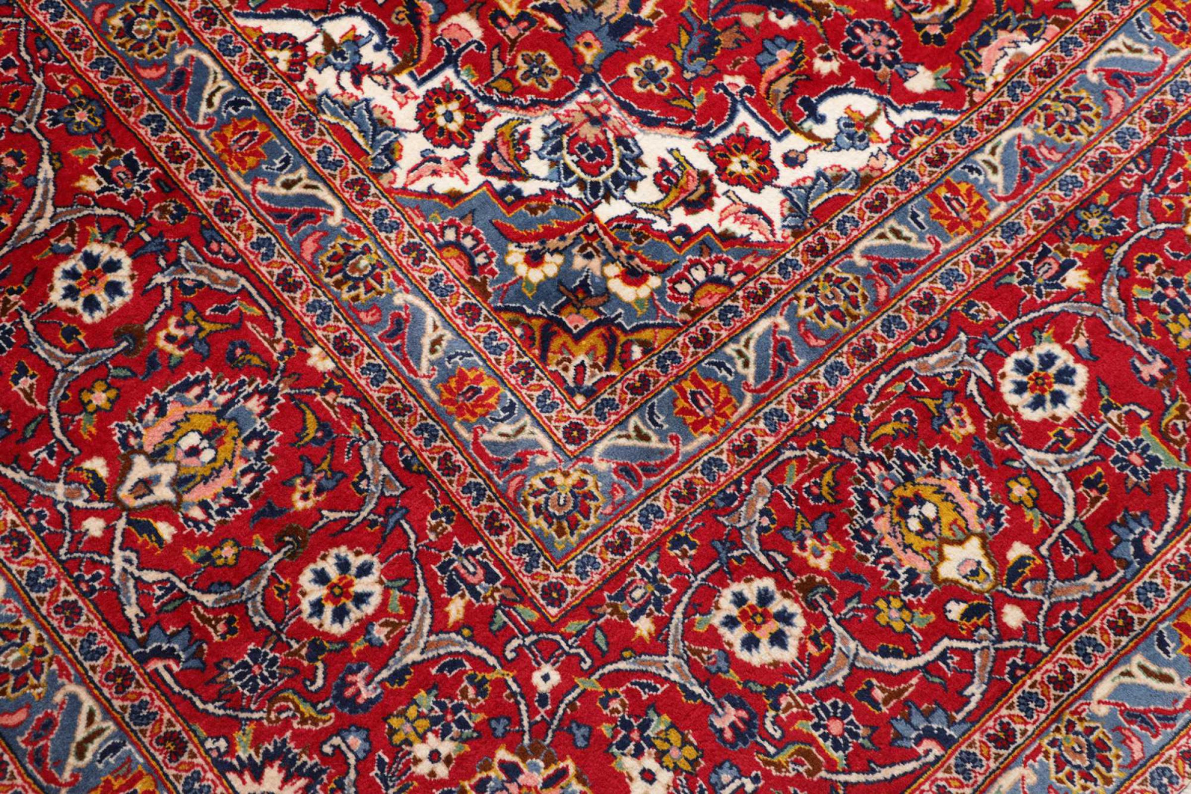 This carpet from Kashan (Keshan) is held in its very traditional and typical Persian design with beautiful ornaments. Kashan rugs are highly popular due to their exceptionally elegant design. These carpets originate from Kashan, a city on the ancient Silk Road. This carpet has been knotted by hand from high grade sheep wool and is going to be an one-of-a-kind highlight in your home.