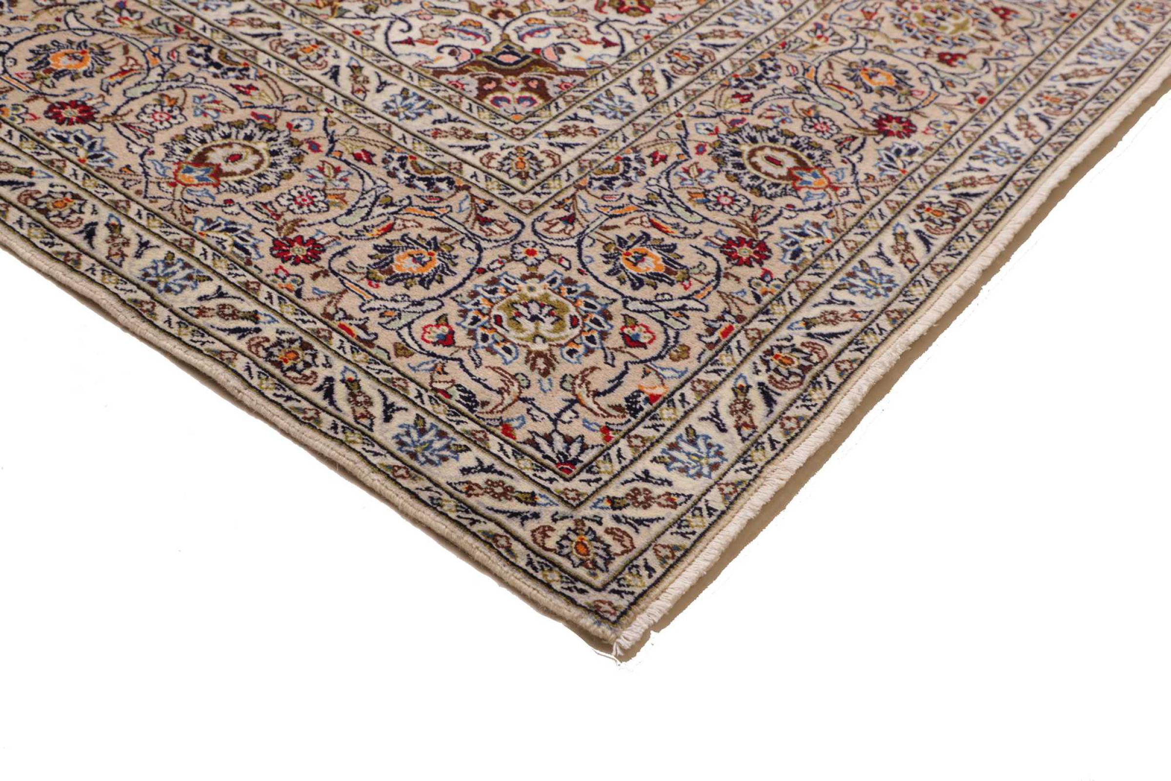 This carpet from Kashan (Keshan) is held in its very traditional and typical Persian design with beautiful ornaments. Kashan rugs are highly popular due to their exceptionally elegant design. These carpets originate from Kashan, a city on the ancient Silk Road. This carpet has been knotted by hand from high grade sheep wool and is going to be an one-of-a-kind highlight in your home.
