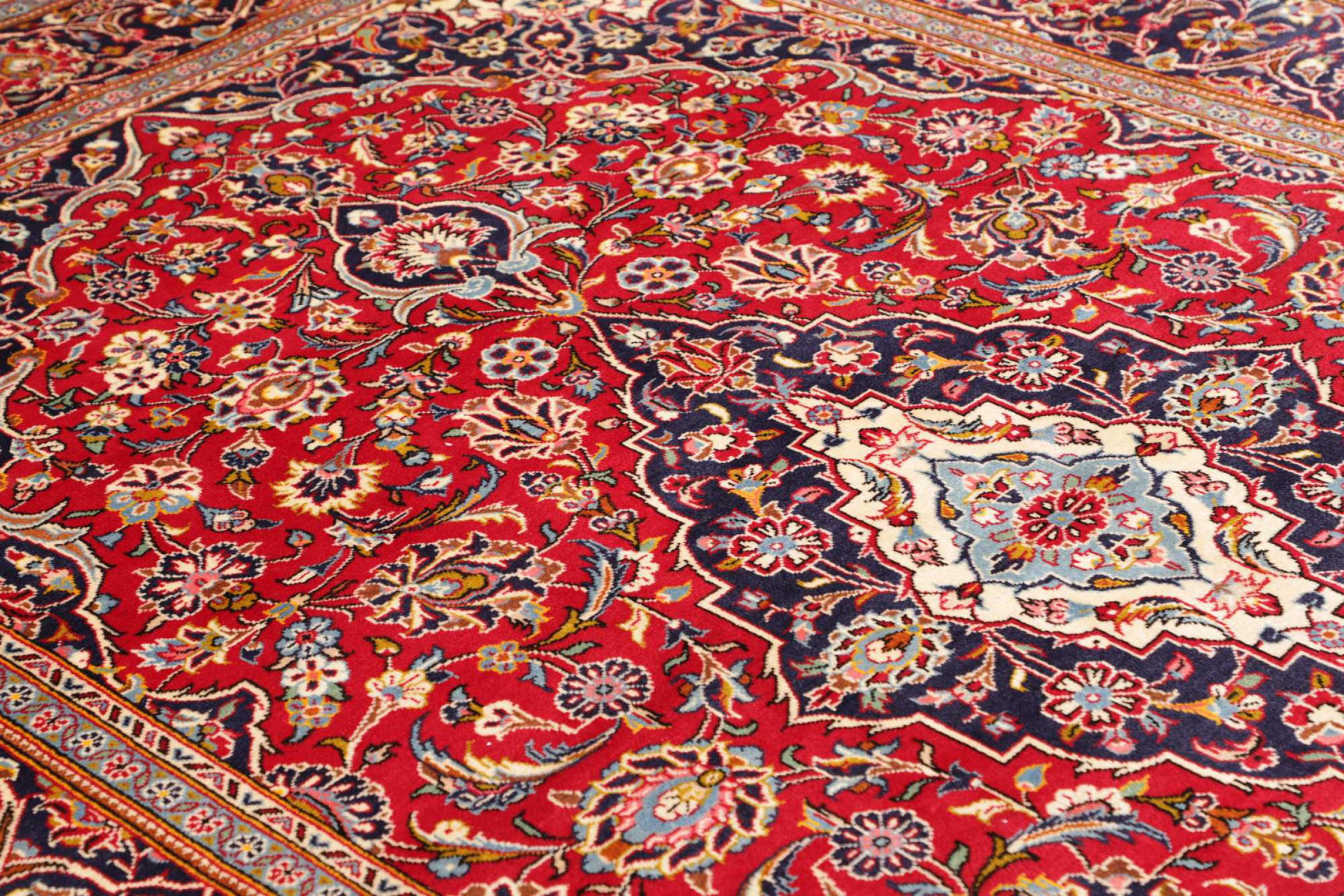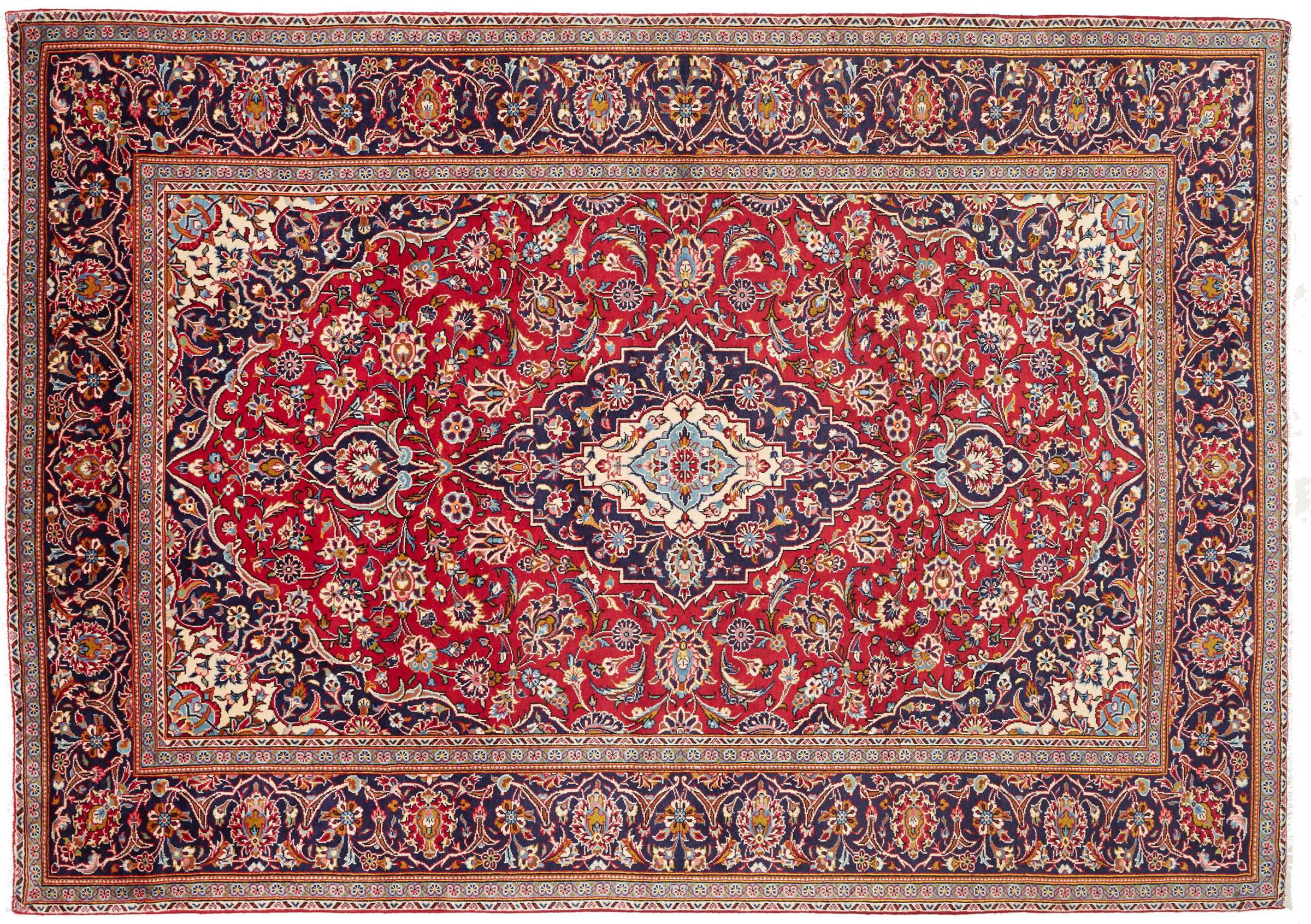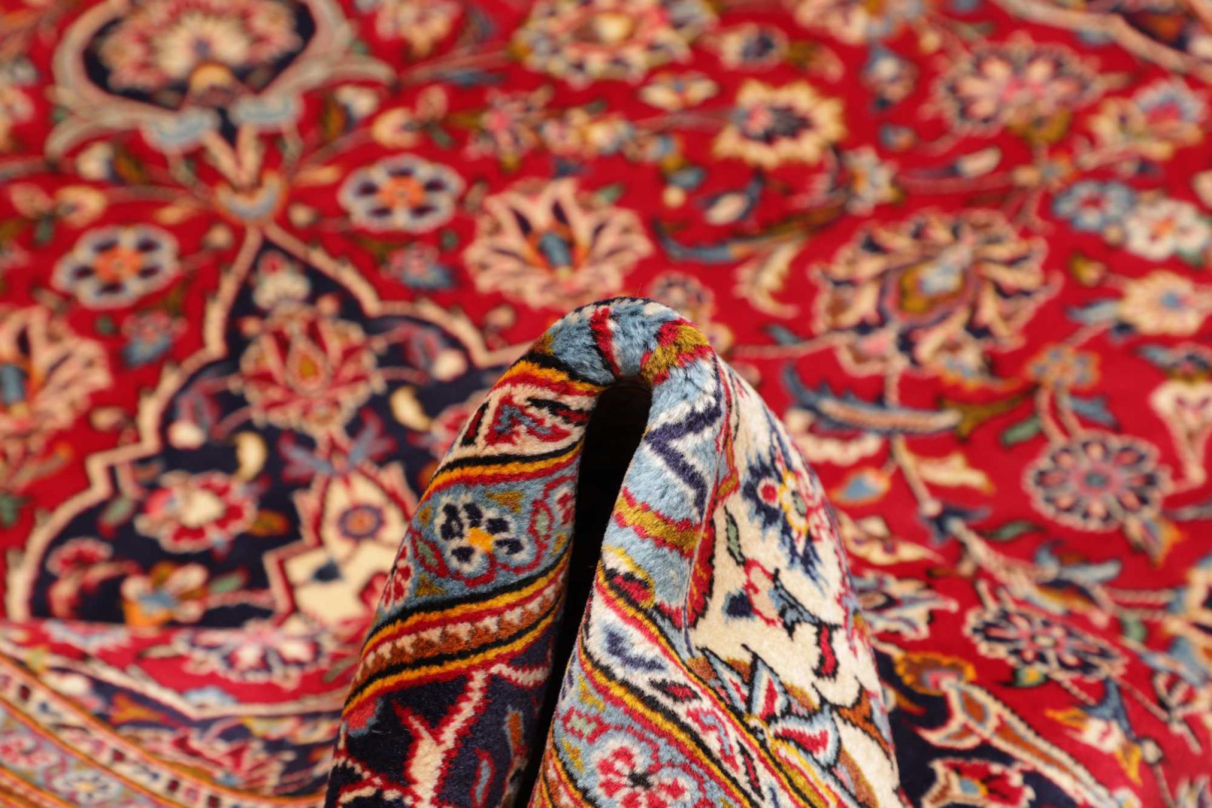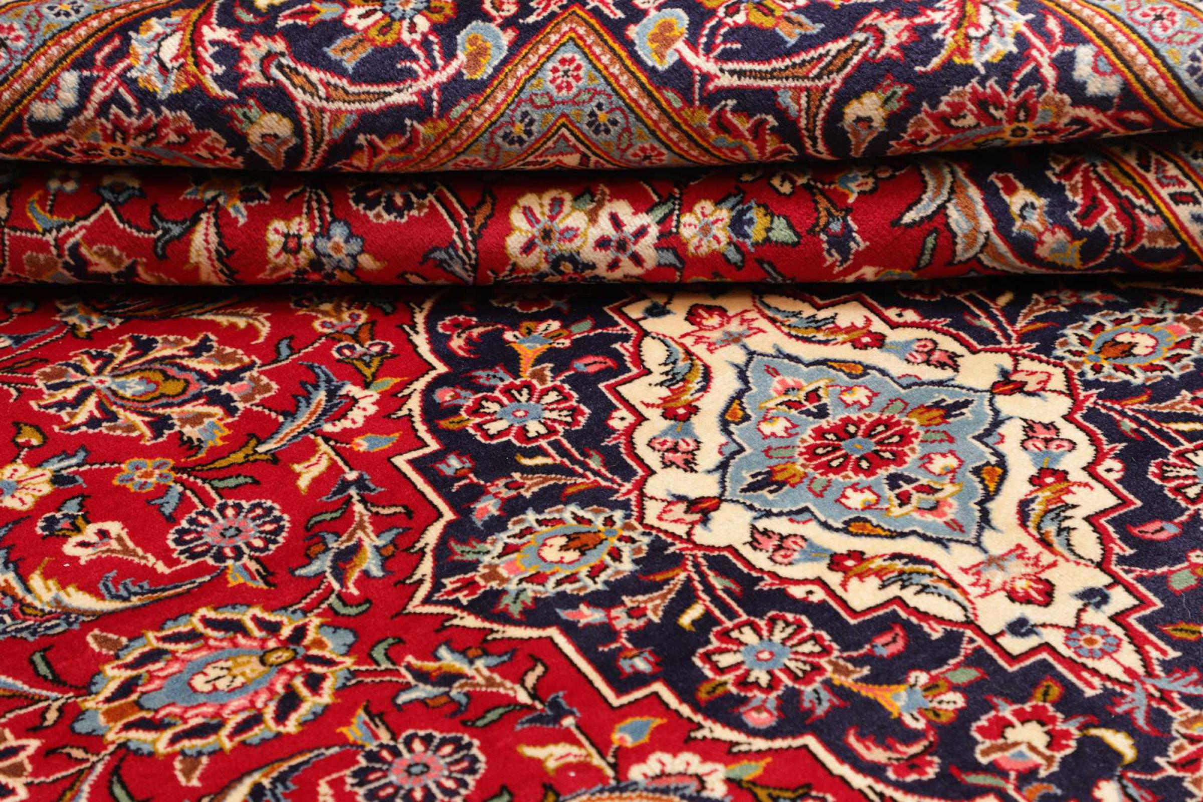 Hand knotted rugs from the city of Kashan (Keshan) are known worldwide. Not only do these Persian rugs have a very popular design, but their quality is undisputedly one of the best. In the Persian Empire the city was considered one of the most important trading places along the famous Silk Road. Kashan rugs usually have a central medallion, floral ornaments and a red background. They are made of high-quality sheep's wool and vegetable dyes.