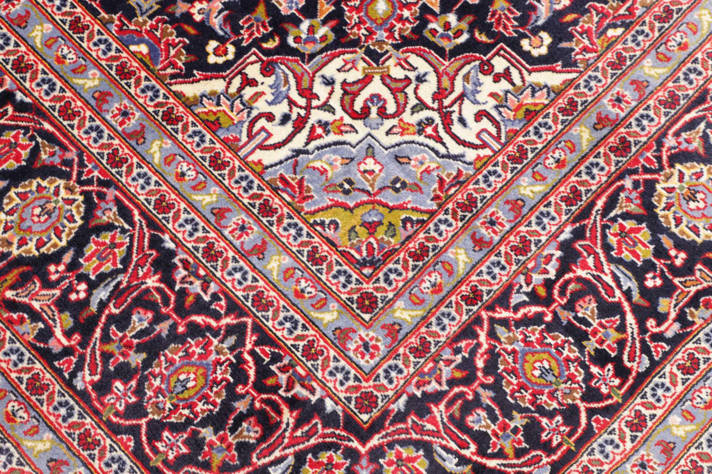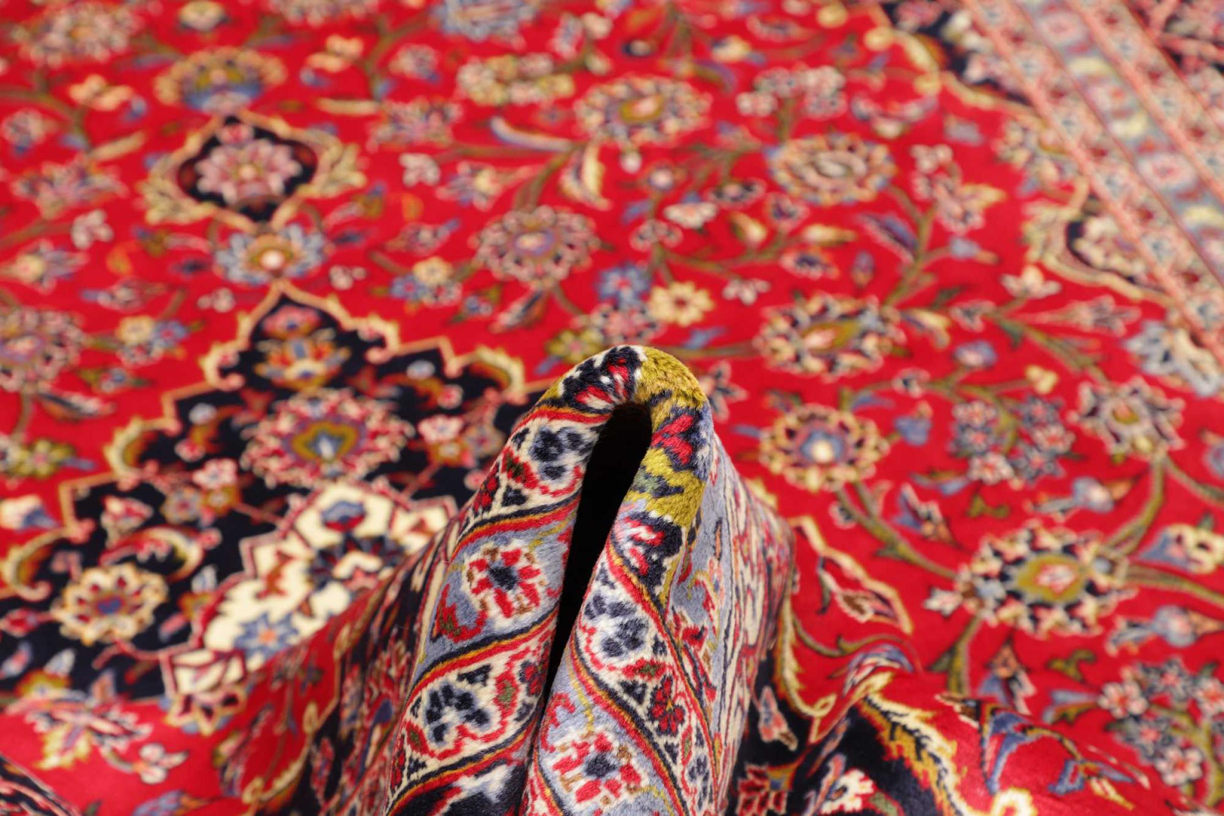 This carpet from Kashan (Keshan) is held in its very traditional and typical Persian design with beautiful ornaments. Kashan rugs are highly popular due to their exceptionally elegant design. These carpets originate from Kashan, a city on the ancient Silk Road. This carpet has been knotted by hand from high grade sheep wool and is going to be an one-of-a-kind highlight in your home.