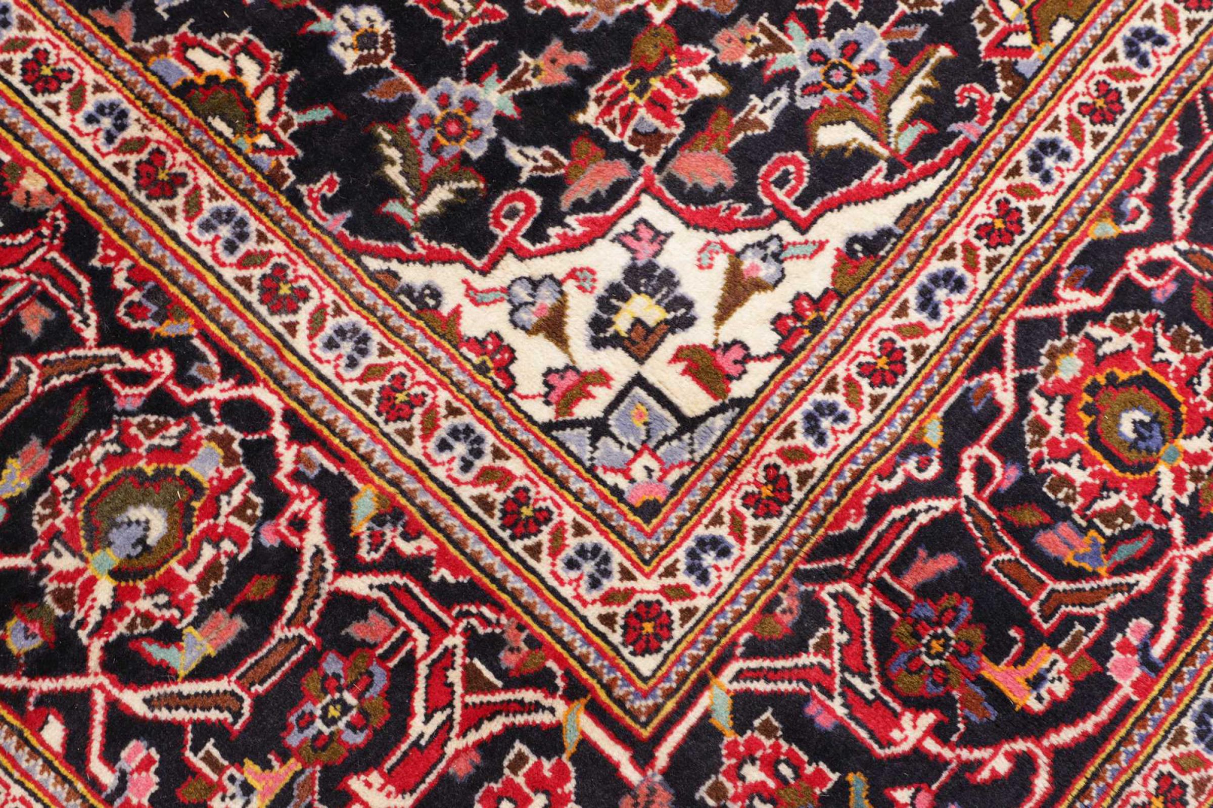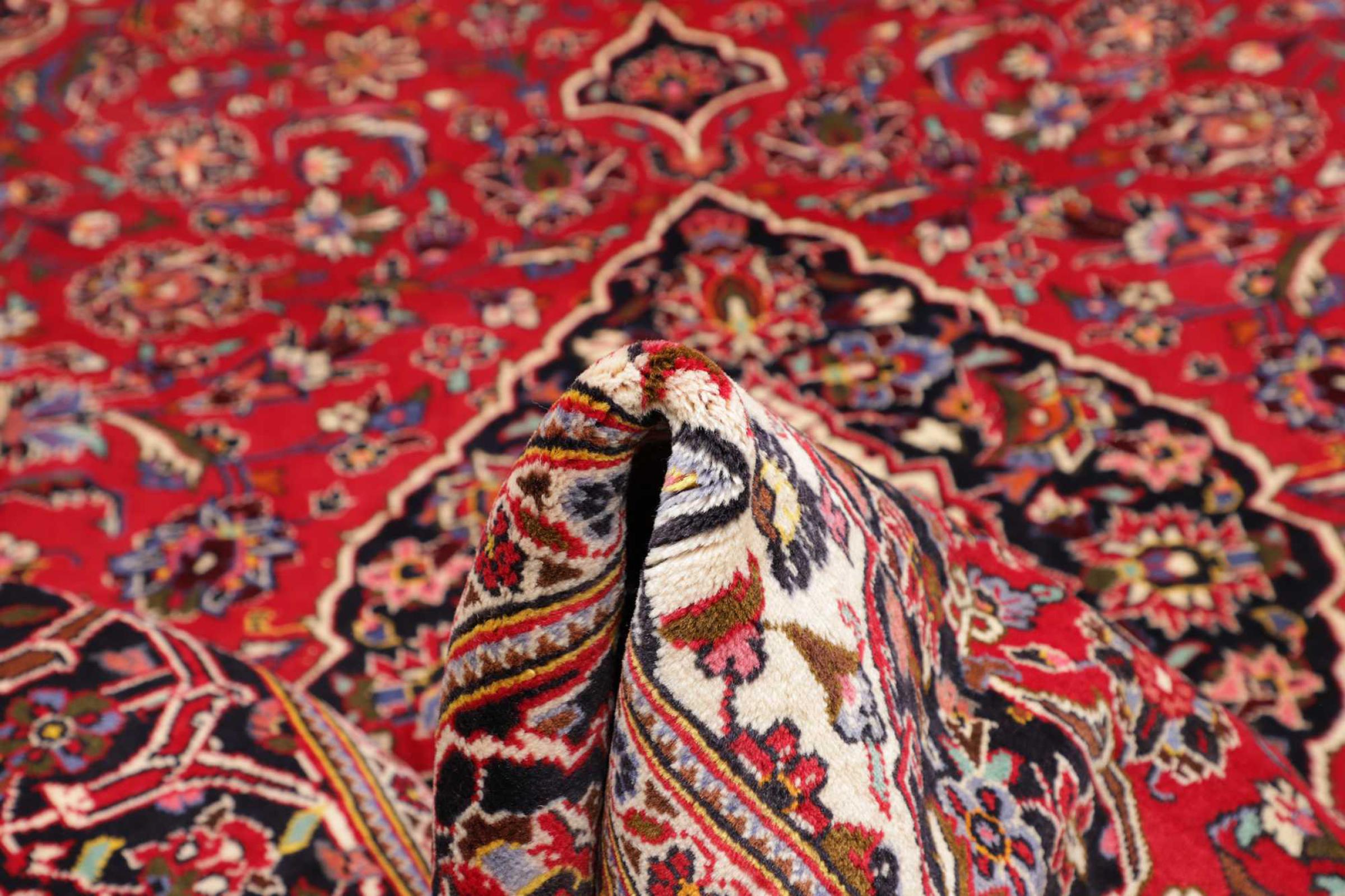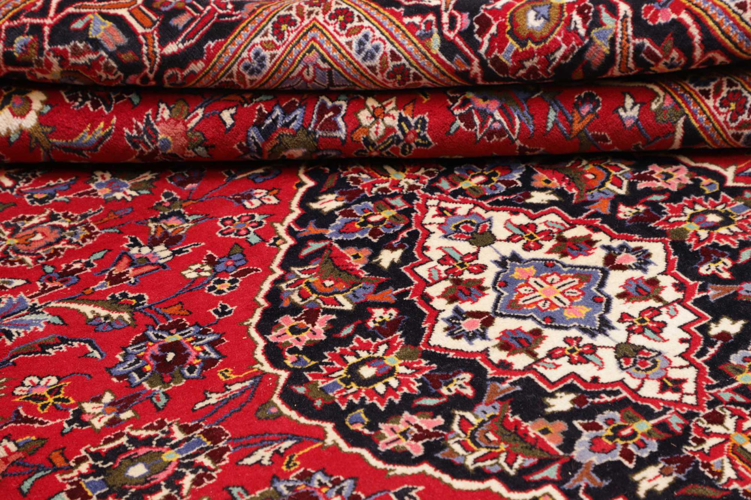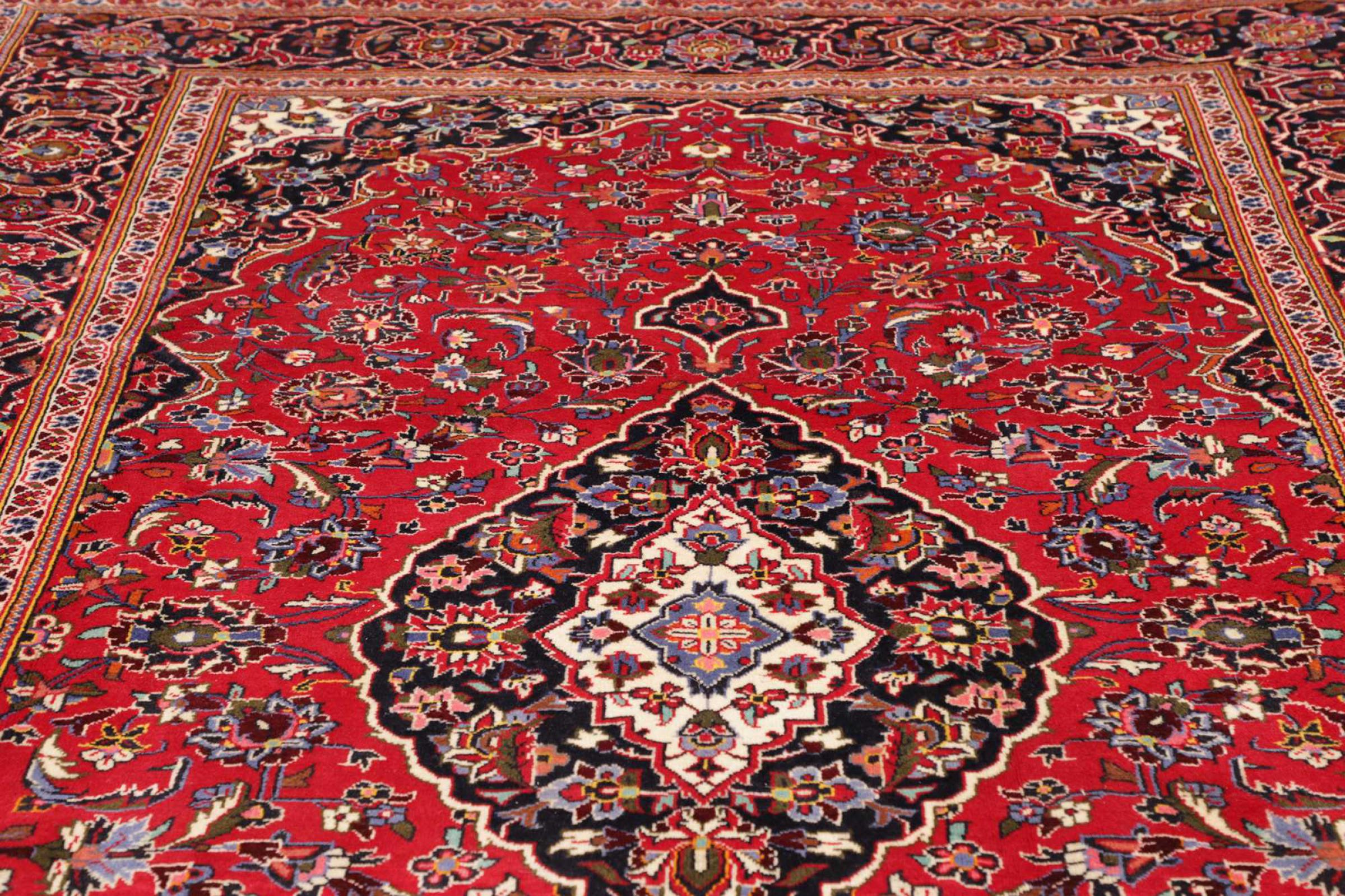 This carpet from Kashan (Keshan) is held in its very traditional and typical Persian design with beautiful ornaments. Kashan rugs are highly popular due to their exceptionally elegant design. These carpets originate from Kashan, a city on the ancient Silk Road. This carpet has been knotted by hand from high grade sheep wool and is going to be an one-of-a-kind highlight in your home.