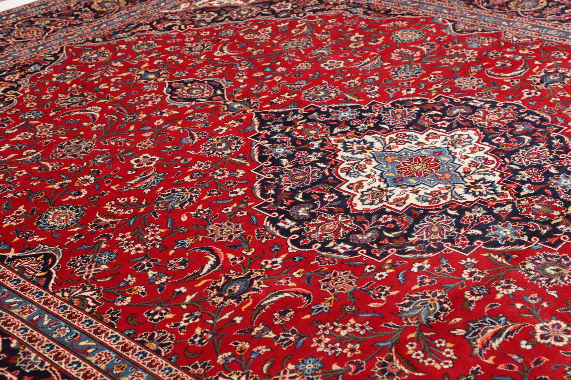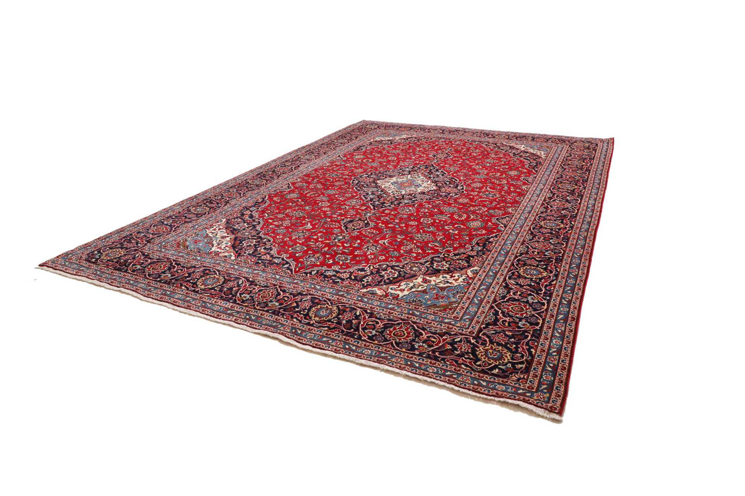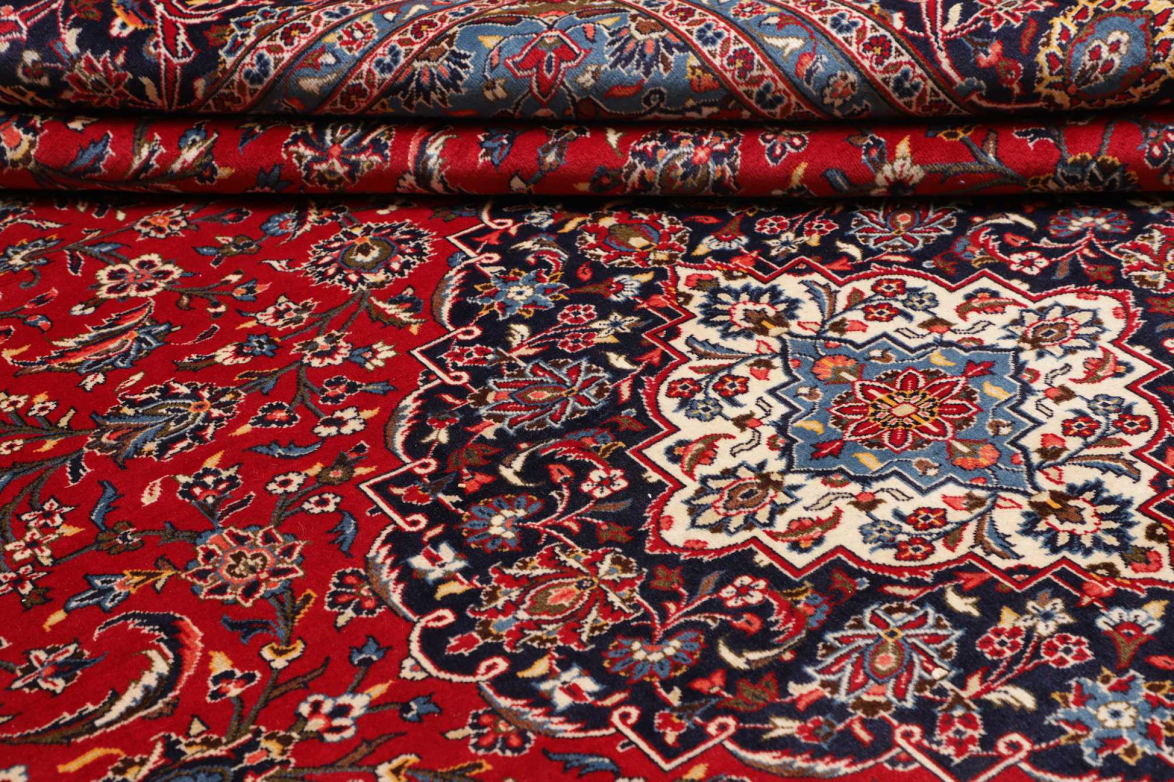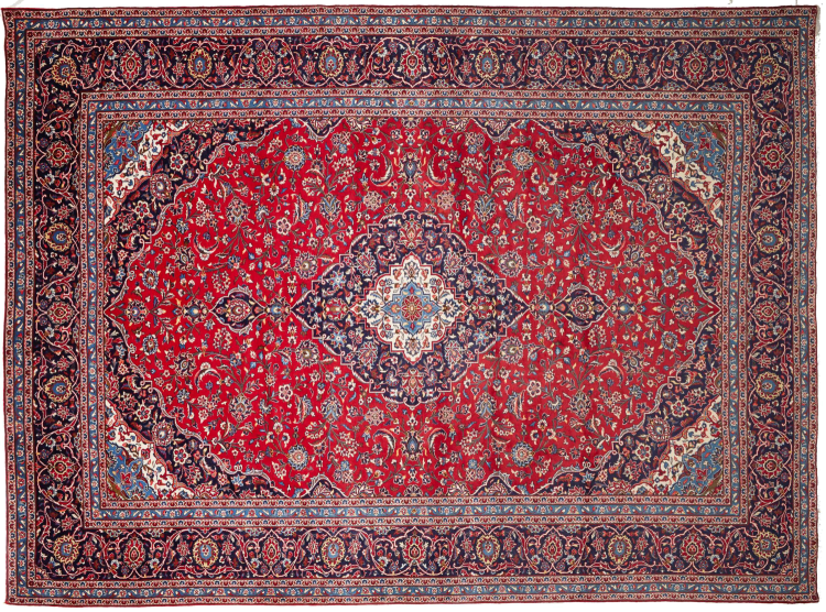 Hand knotted rugs from the city of Kashan (Keshan) are known worldwide. Not only do these Persian rugs have a very popular design, but their quality is undisputedly one of the best. In the Persian Empire the city was considered one of the most important trading places along the famous Silk Road. Kashan rugs usually have a central medallion, floral ornaments and a red background. They are made of high-quality sheep's wool and vegetable dyes.