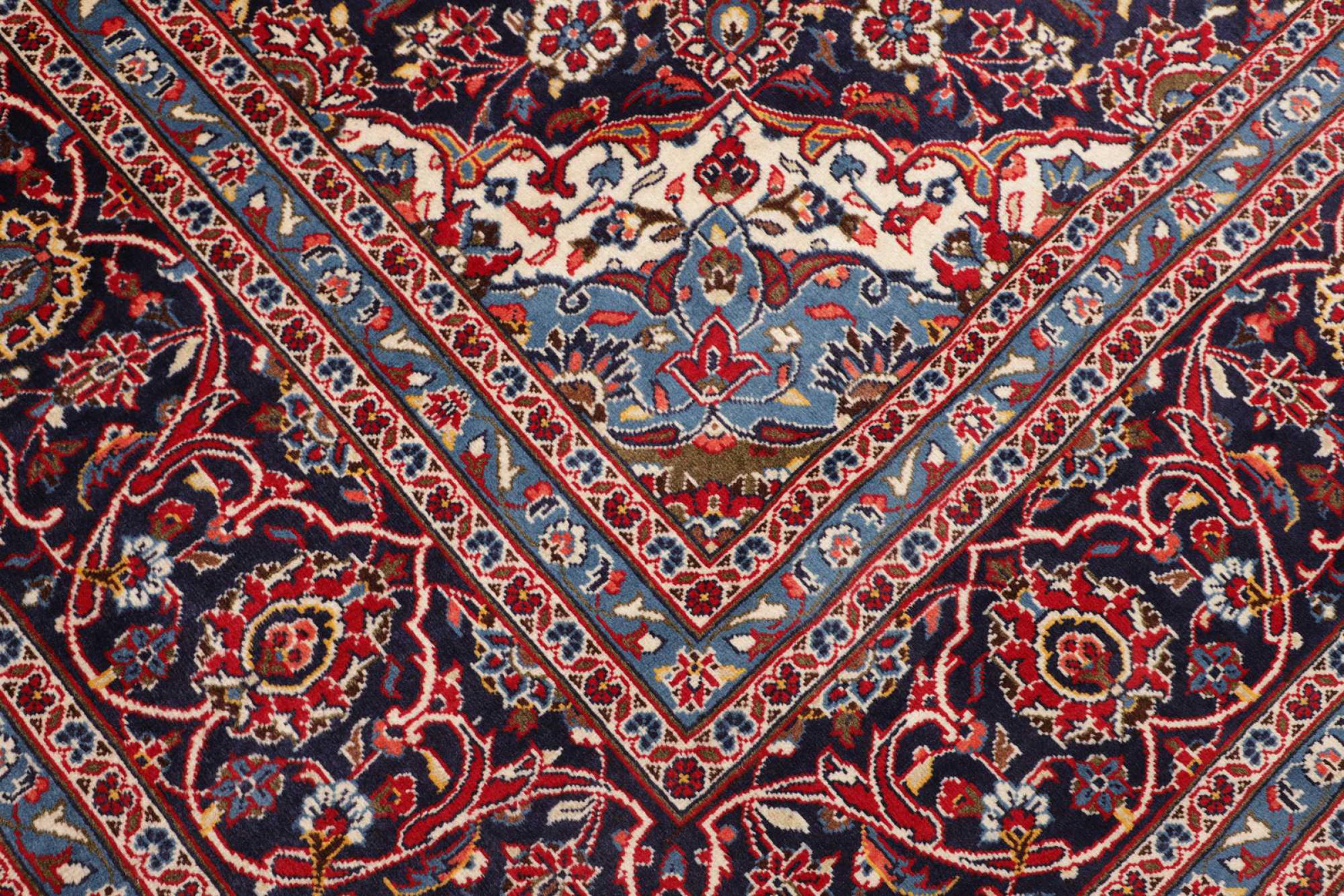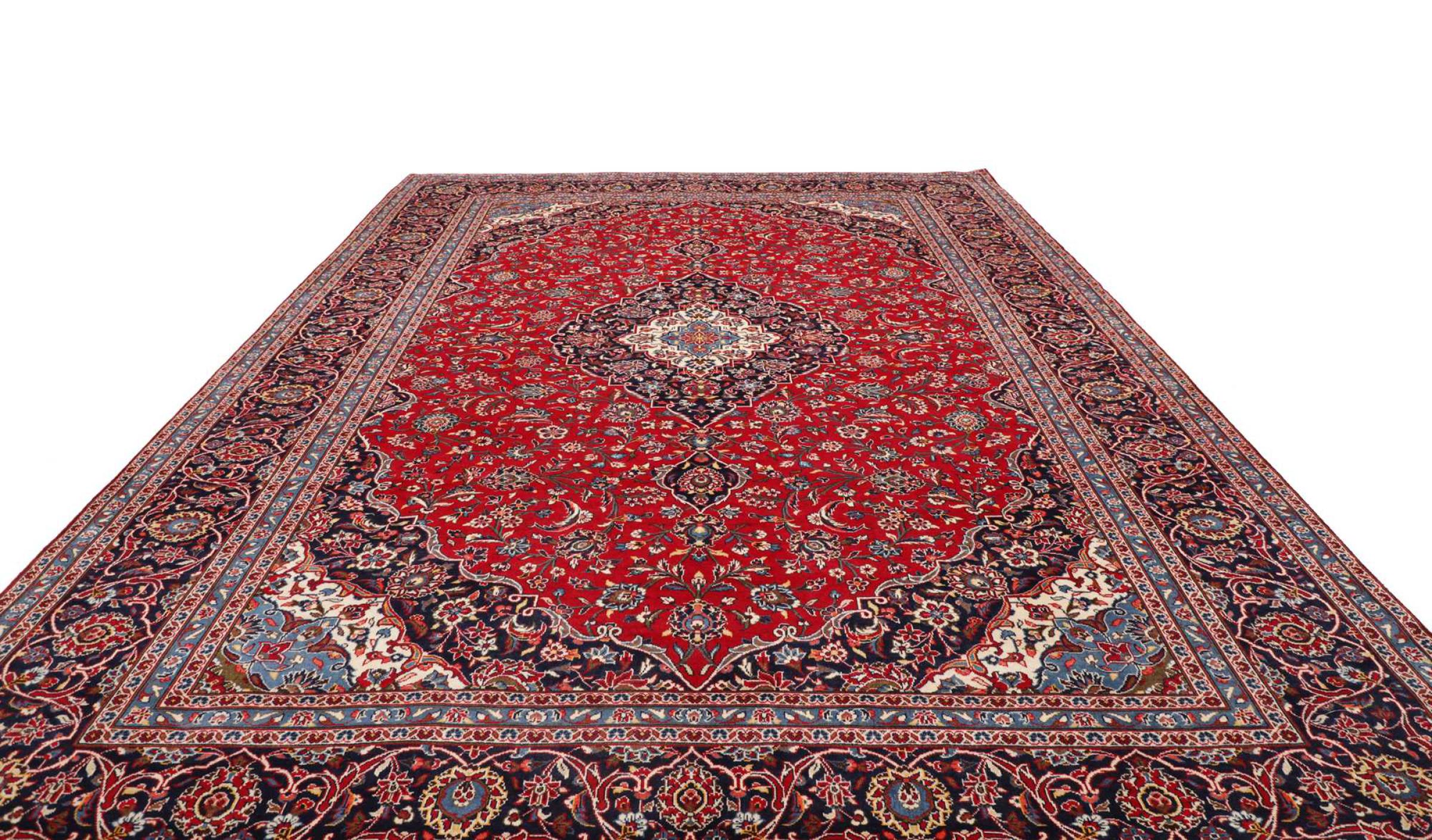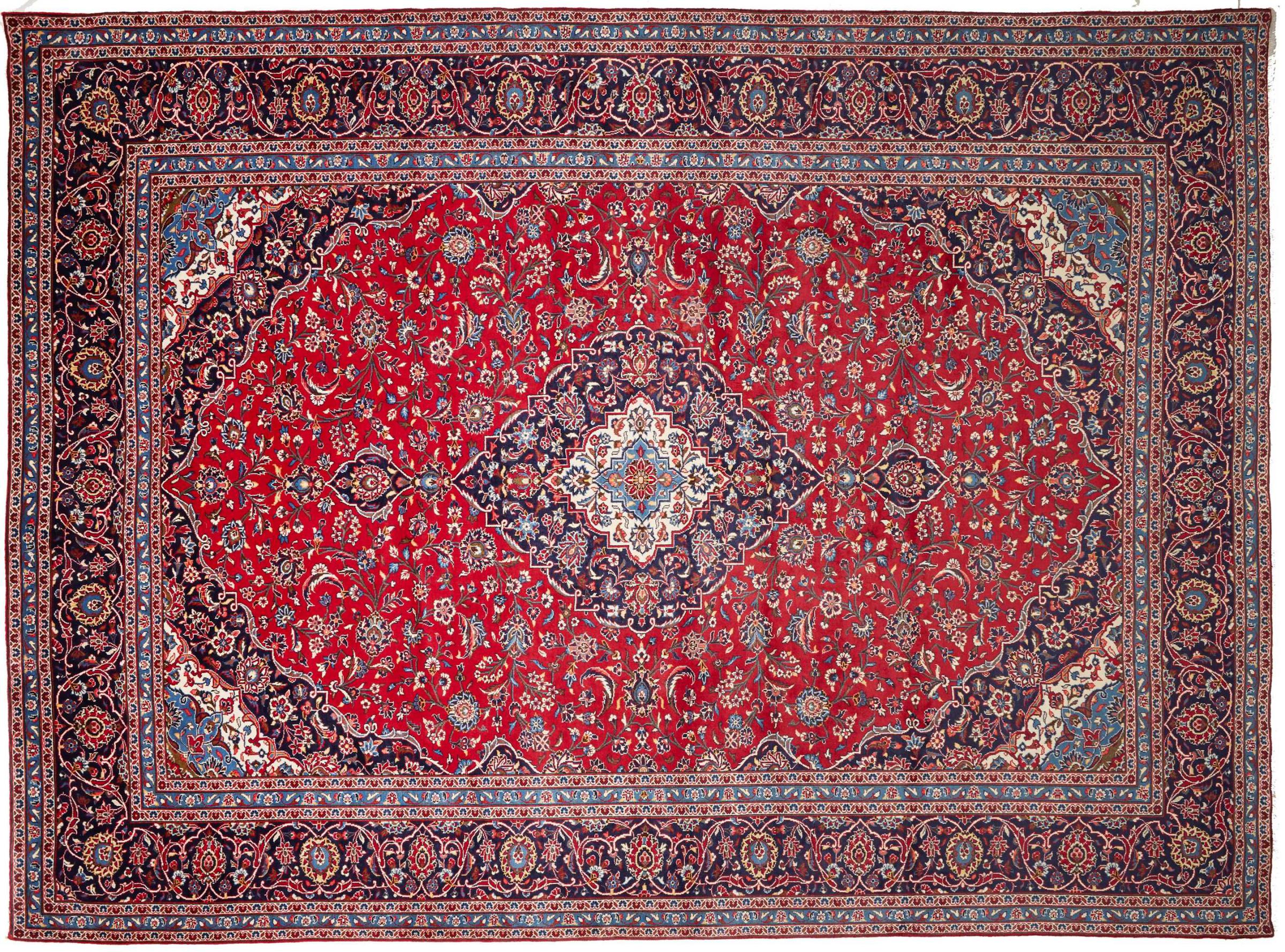 Hand knotted rugs from the city of Kashan (Keshan) are known worldwide. Not only do these Persian rugs have a very popular design, but their quality is undisputedly one of the best. In the Persian Empire the city was considered one of the most important trading places along the famous Silk Road. Kashan rugs usually have a central medallion, floral ornaments and a red background. They are made of high-quality sheep's wool and vegetable dyes.