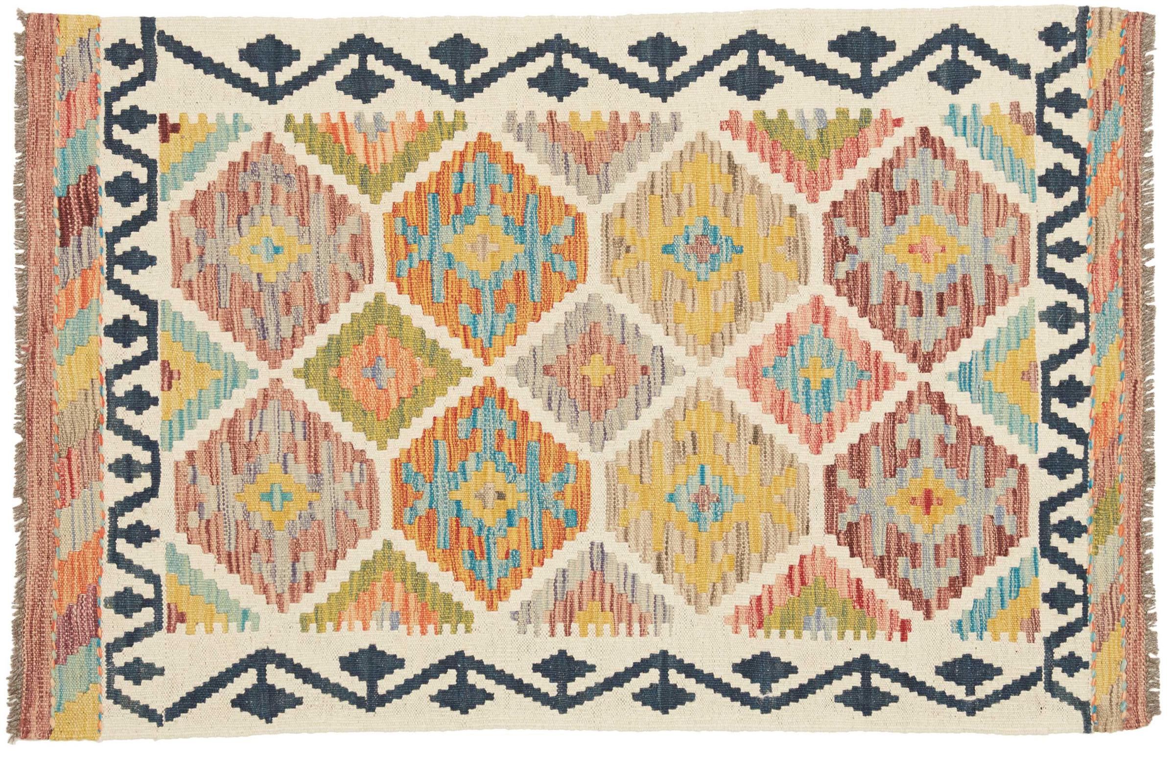 This handwoven Kilim Afghan is a wonderful and unique piece of art. Hard to believe that these modern colours and patterns have already been used centuries ago. This carpet has been woven by hand in old tradition in Afghanistan. It delivers a portion of contemporary history, which you won't find in this specific design a second time. It consists of high-grade natural wool and gives your home a personalised touch.