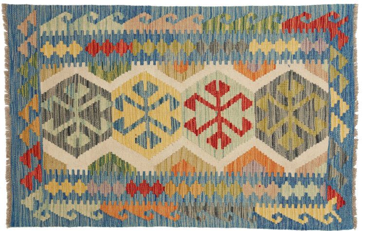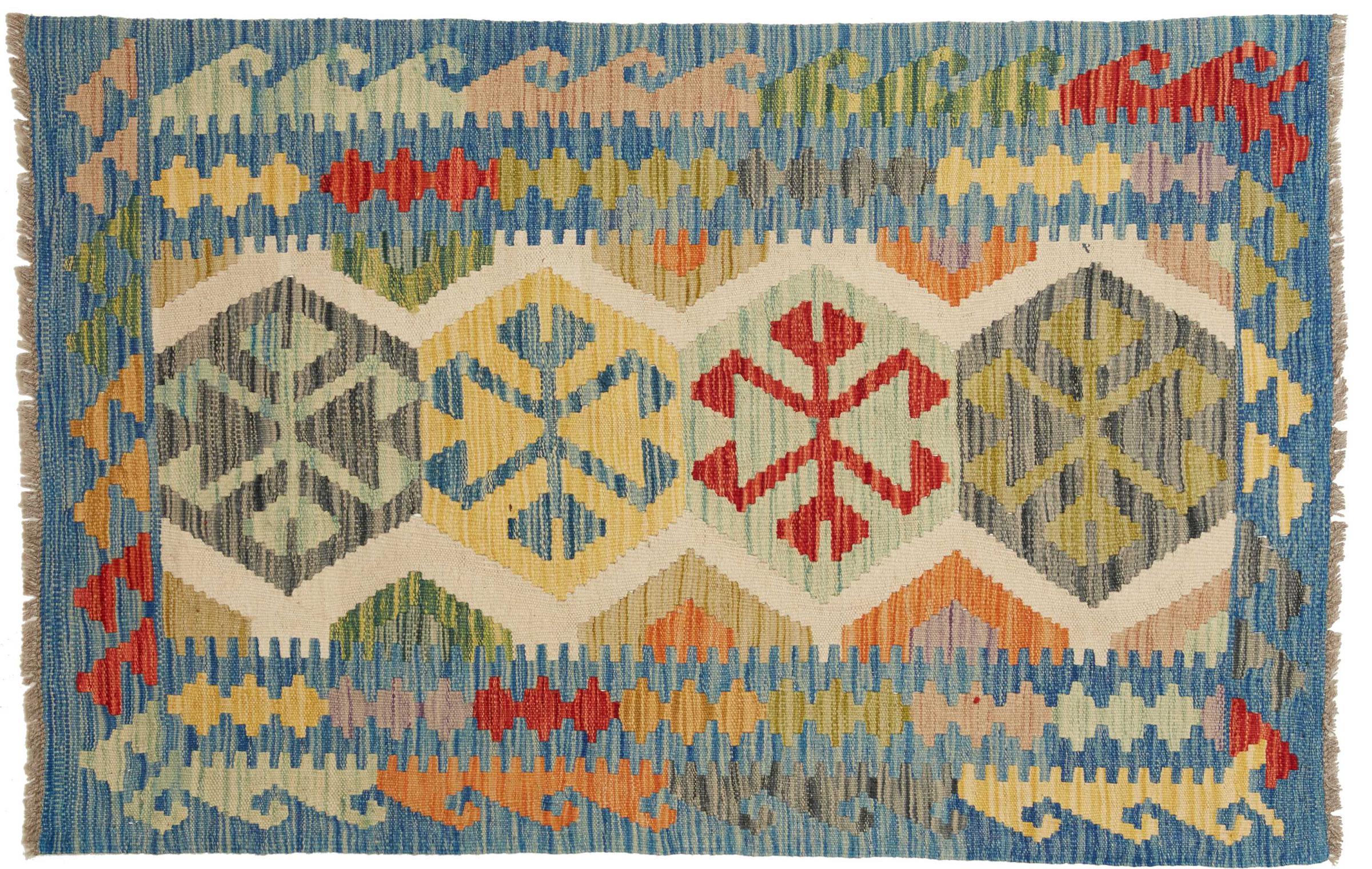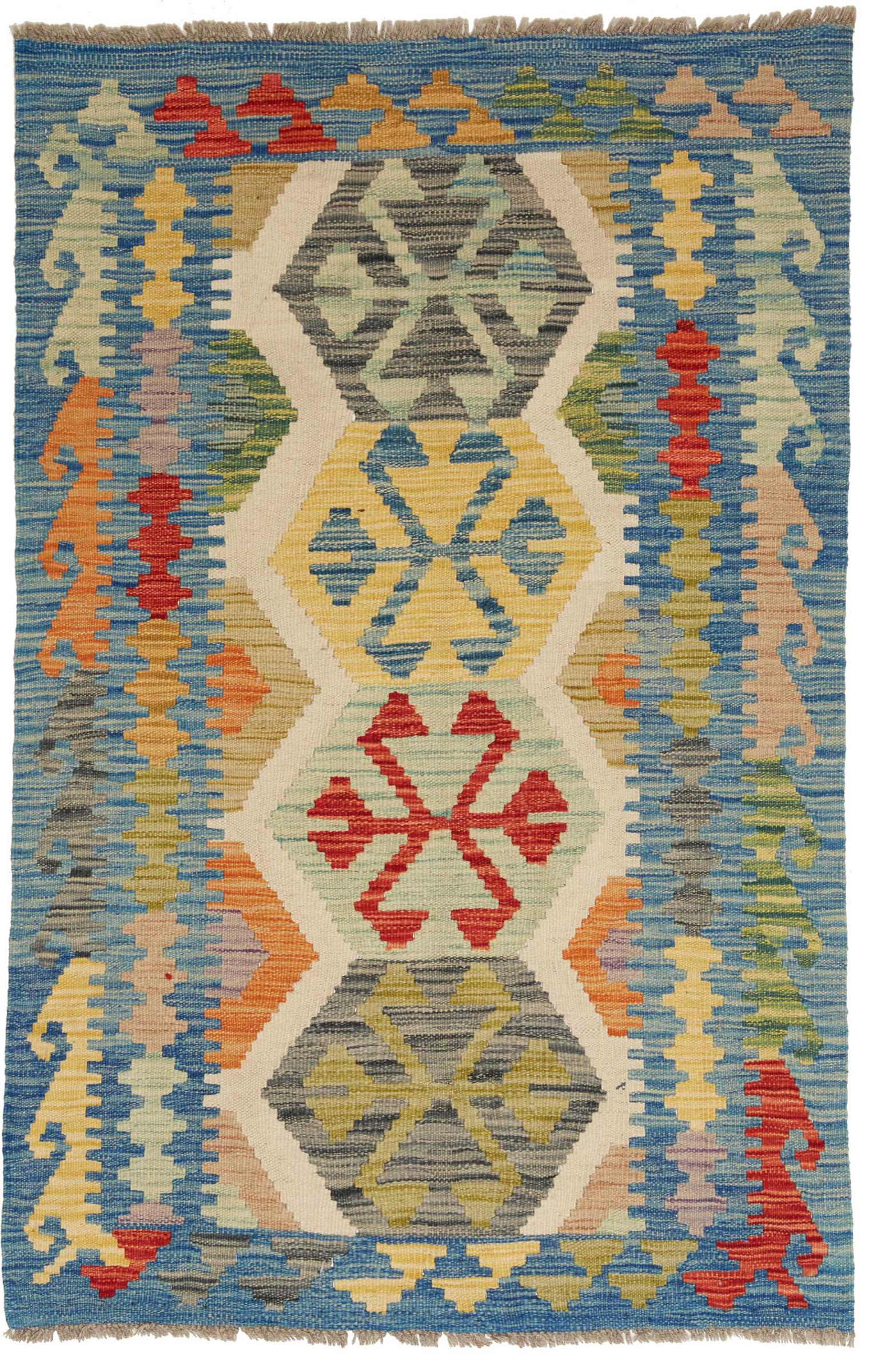 This handwoven Kilim Afghan is a wonderful and unique piece of art. Hard to believe that these modern colours and patterns have already been used centuries ago. This carpet has been woven by hand in old tradition in Afghanistan. It delivers a portion of contemporary history, which you won't find in this specific design a second time. It consists of high-grade natural wool and gives your home a personalised touch.