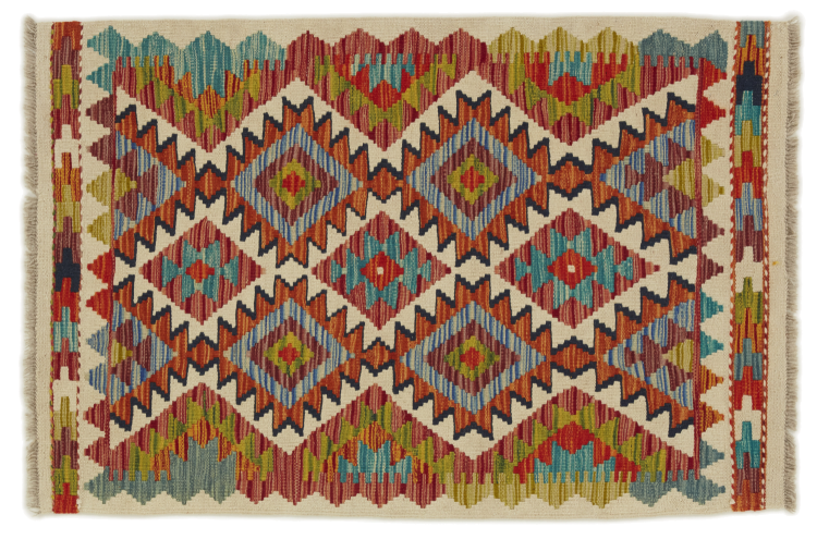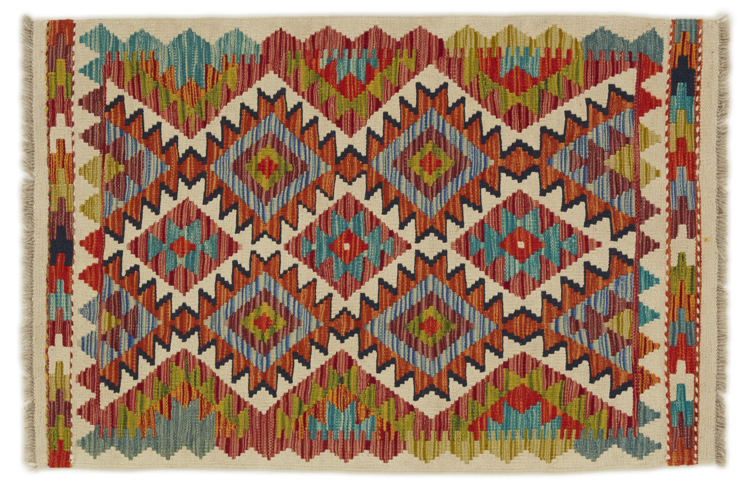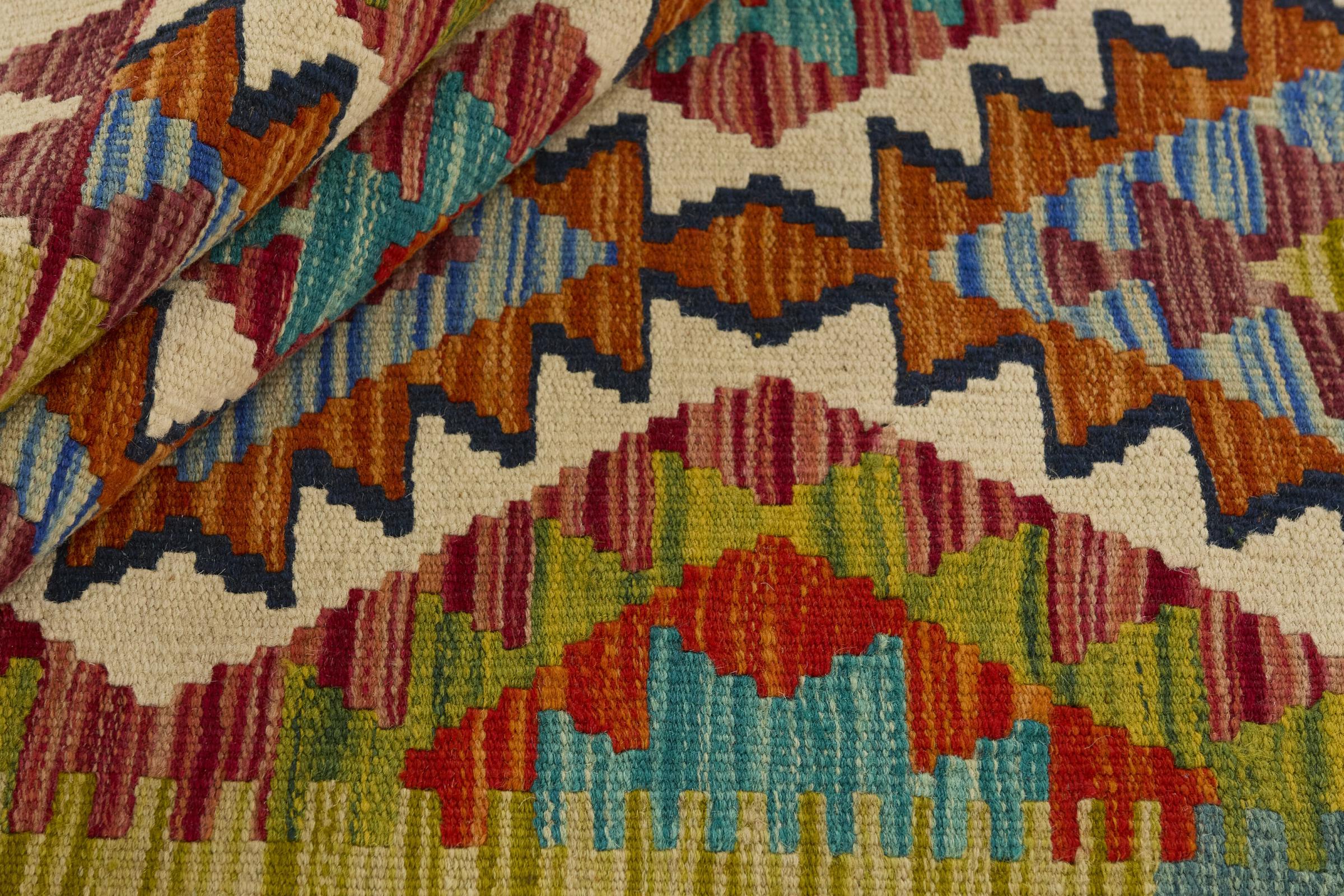 This handwoven Kilim Afghan is a wonderful and unique piece of art. Hard to believe that these modern colours and patterns have already been used centuries ago. This carpet has been woven by hand in old tradition in Afghanistan. It delivers a portion of contemporary history, which you won't find in this specific design a second time. It consists of high-grade natural wool and gives your home a personalised touch.