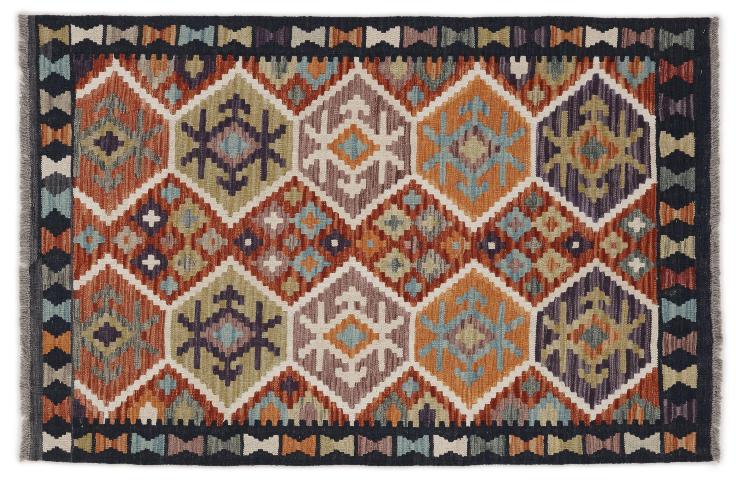 This handwoven Kilim Afghan is a wonderful and unique piece of art. Hard to believe that these modern colours and patterns have already been used centuries ago. This carpet has been woven by hand in old tradition in Afghanistan. It delivers a portion of contemporary history, which you won't find in this specific design a second time. It consists of high-grade natural wool and gives your home a personalised touch.