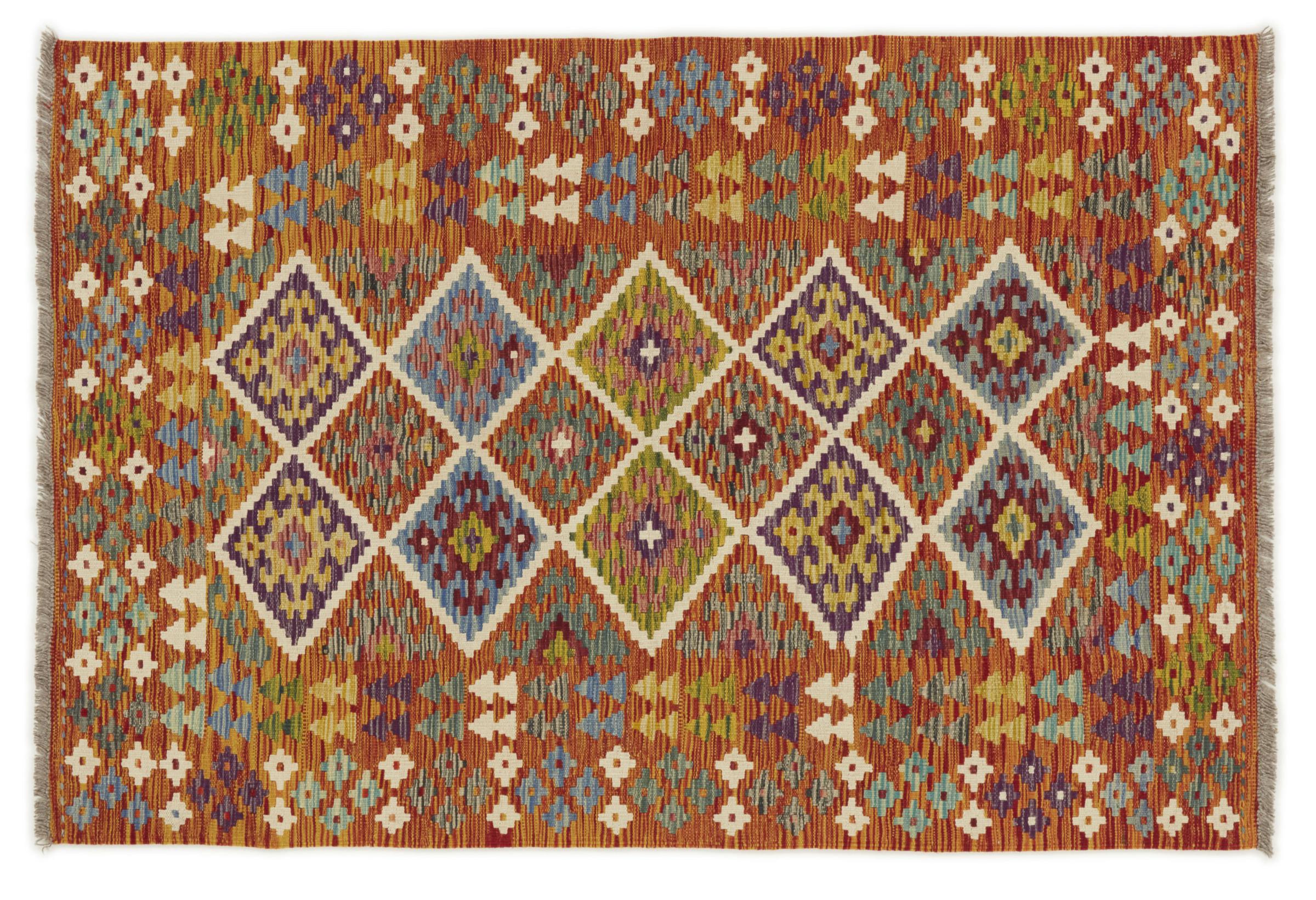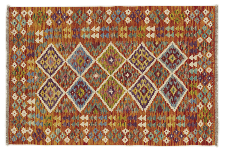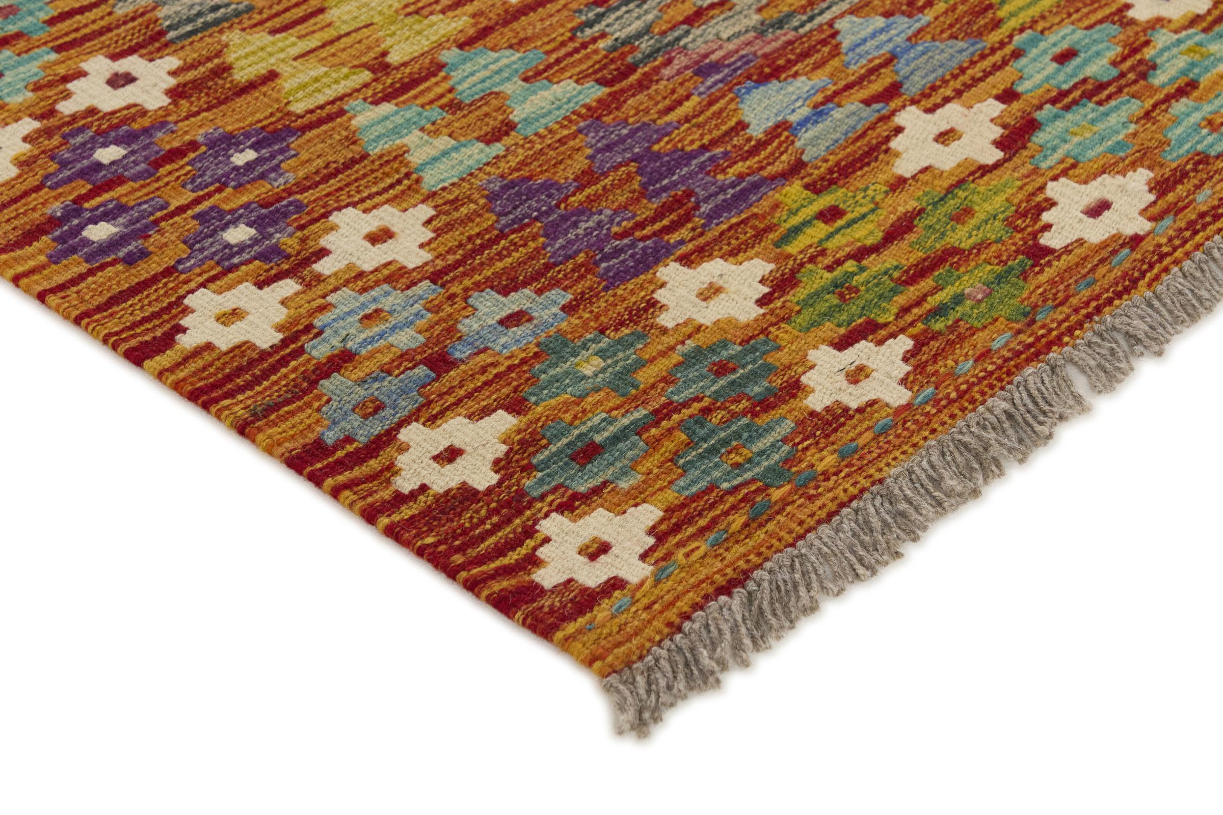 This handwoven Kilim Afghan is a wonderful and unique piece of art. Hard to believe that these modern colours and patterns have already been used centuries ago. This carpet has been woven by hand in old tradition in Afghanistan. It delivers a portion of contemporary history, which you won't find in this specific design a second time. It consists of high-grade natural wool and gives your home a personalised touch.