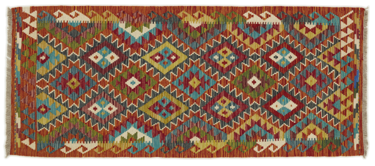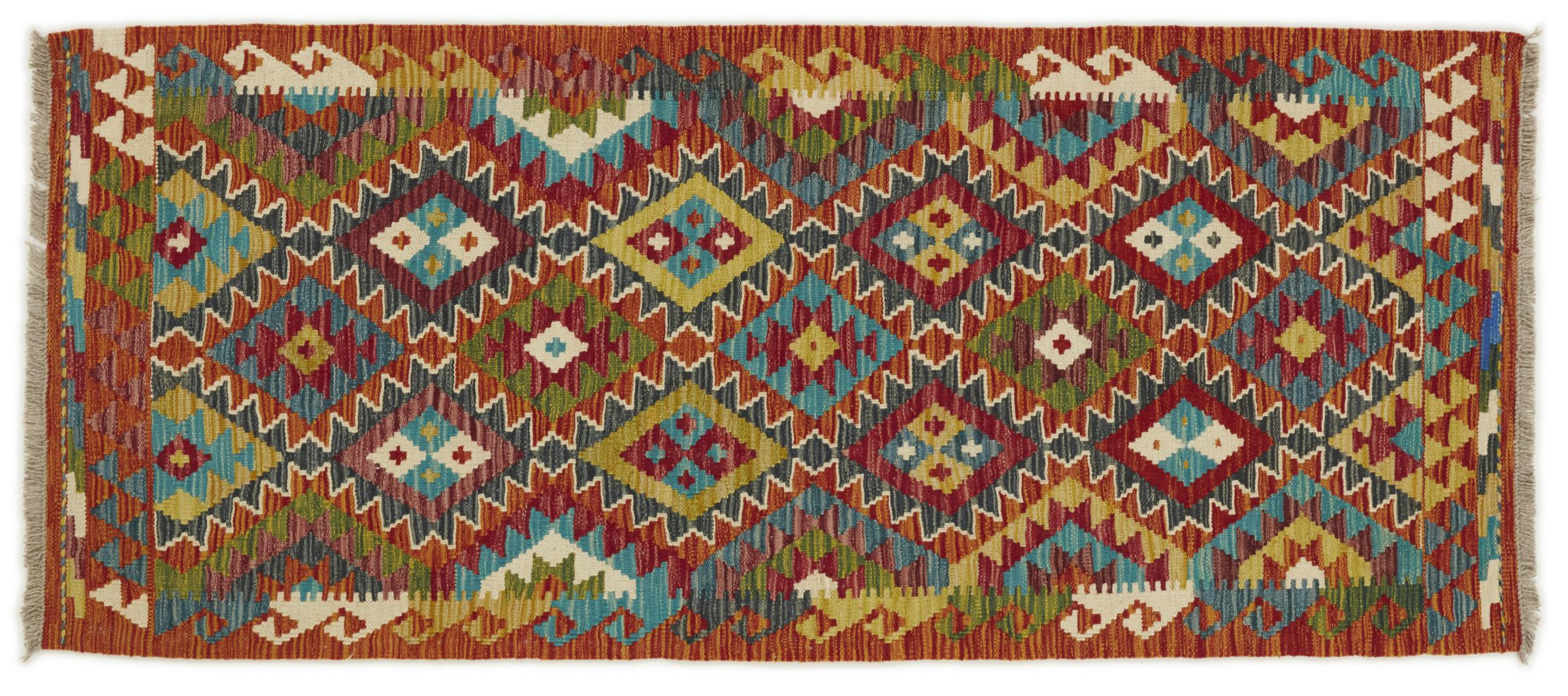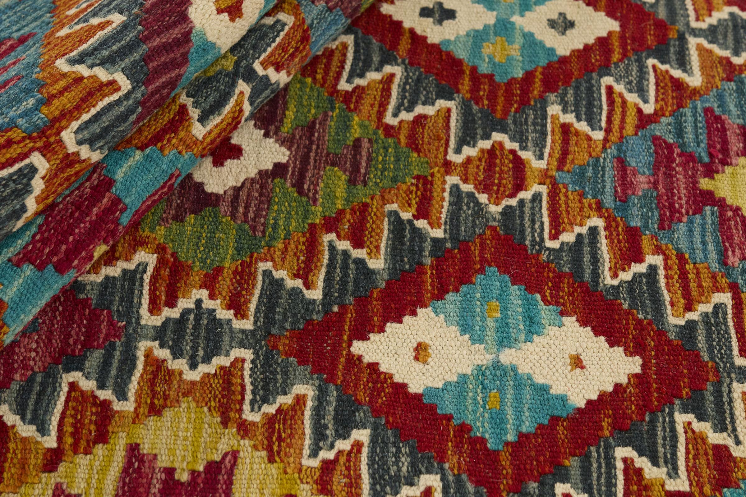 This handwoven Kilim Afghan is a wonderful and unique piece of art. Hard to believe that these modern colours and patterns have already been used centuries ago. This carpet has been woven by hand in old tradition in Afghanistan. It delivers a portion of contemporary history, which you won't find in this specific design a second time. It consists of high-grade natural wool and gives your home a personalised touch.