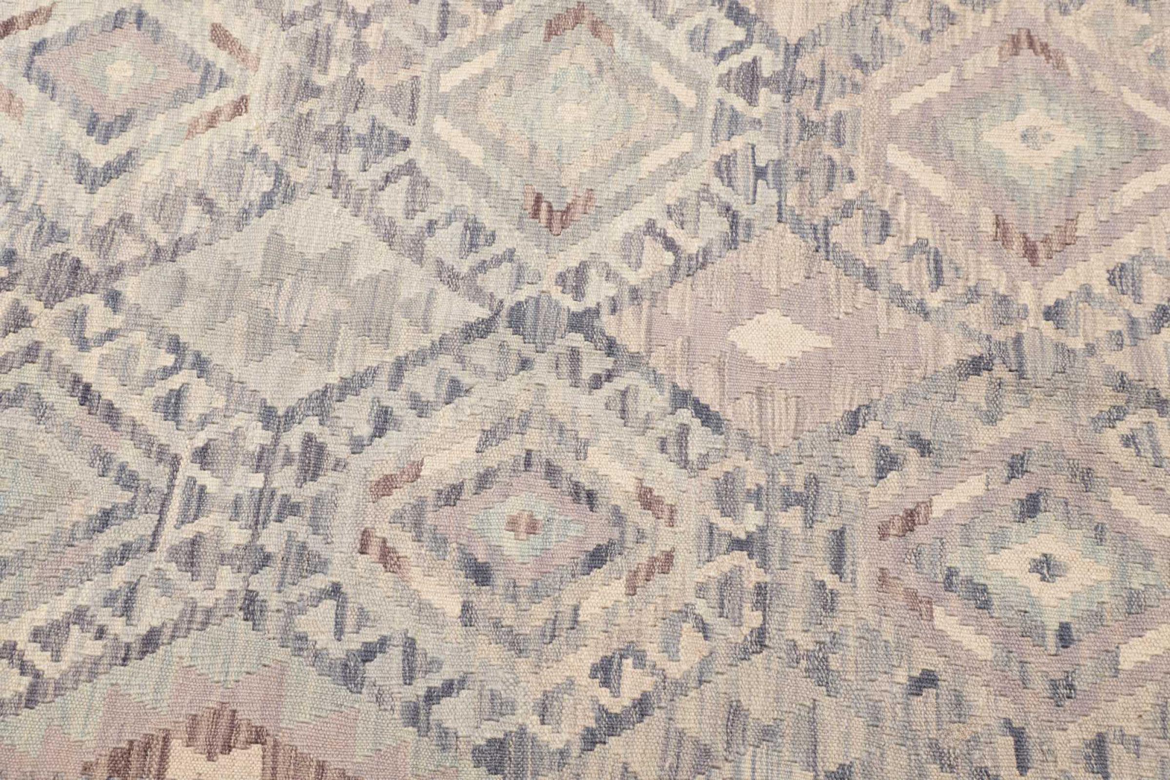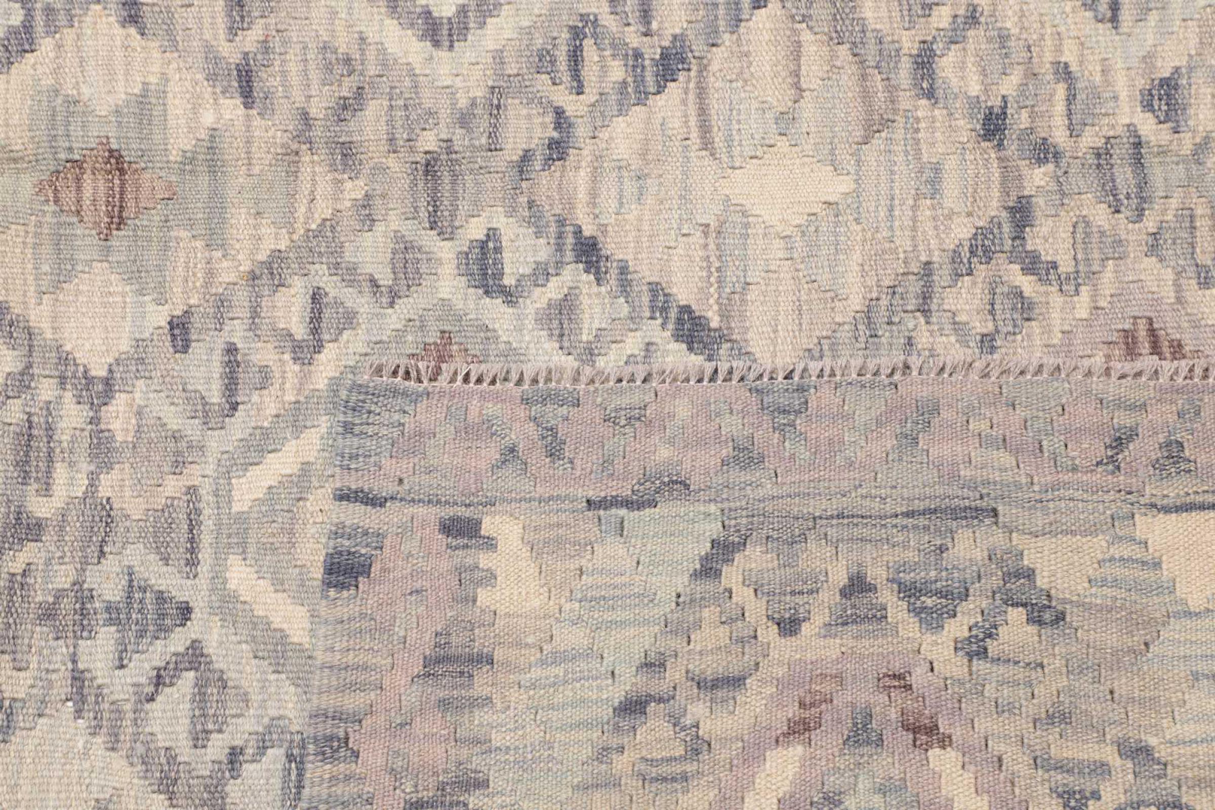 This rug was made as a flat weave by hand on a loom. Flatweave is the term used to describe rugs that have no pile. As the name promises, these rugs are woven and not knotted. This results in a flat rug with a structured surface. Flatweaves are not as soft and usually thinner than knotted rugs. At the same time they are much less complex to manufacture and can usually be laid out from both sides (front and back). Their patterns are usually geometric, which is determined by the fabric.