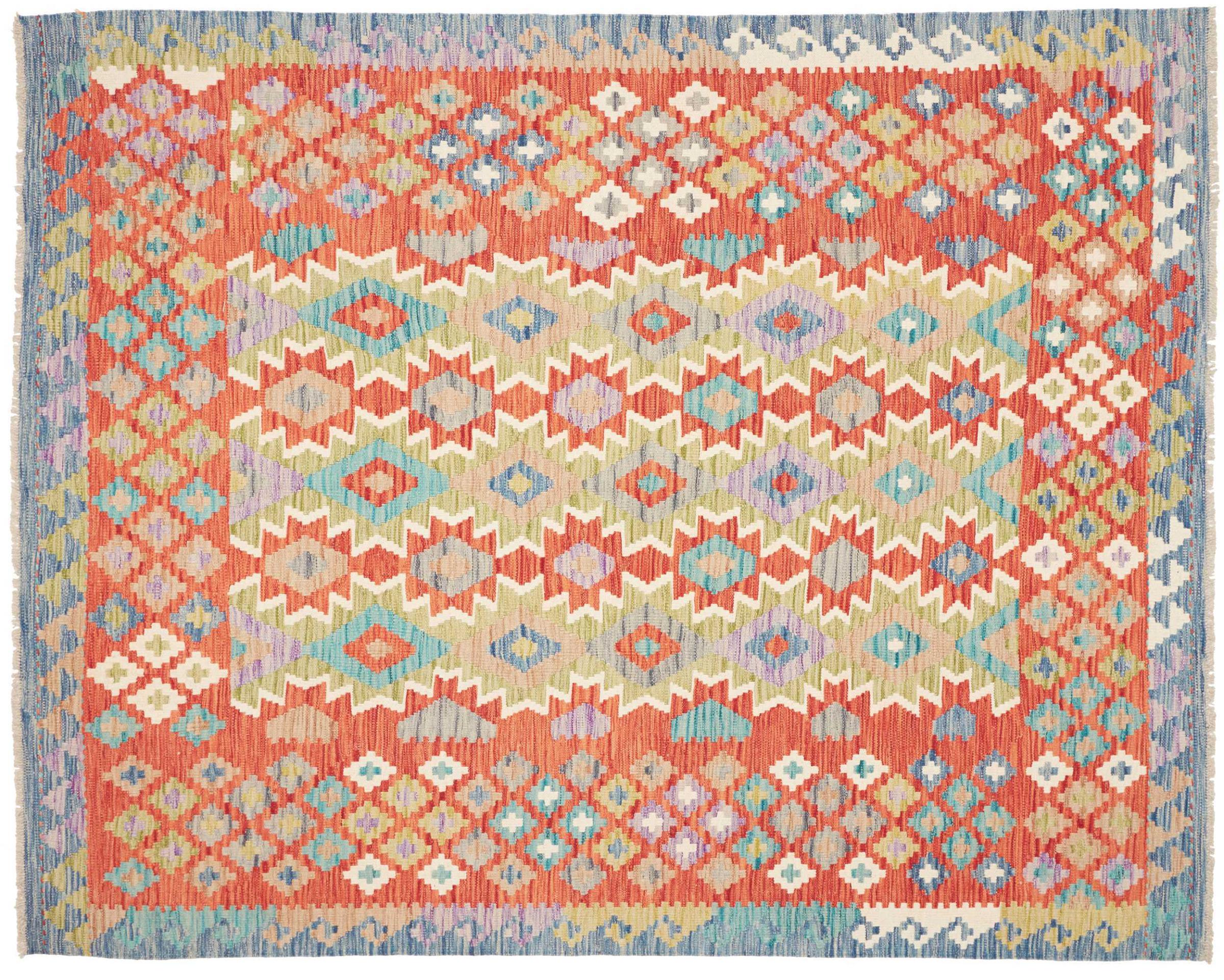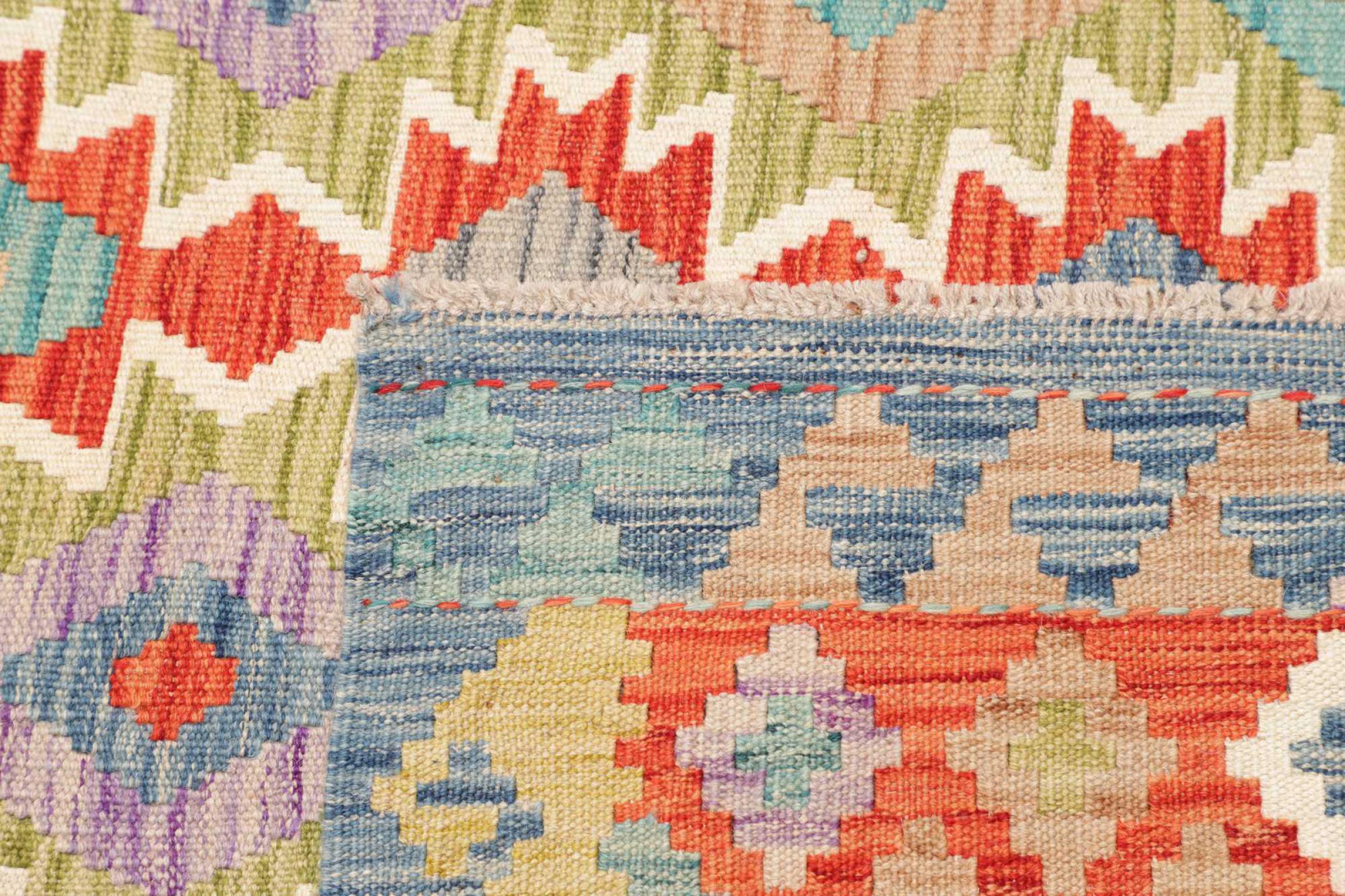 This rug was made as a flat weave by hand on a loom. Flatweave is the term used to describe rugs that have no pile. As the name promises, these rugs are woven and not knotted. This results in a flat rug with a structured surface. Flatweaves are not as soft and usually thinner than knotted rugs. At the same time they are much less complex to manufacture and can usually be laid out from both sides (front and back). Their patterns are usually geometric, which is determined by the fabric.