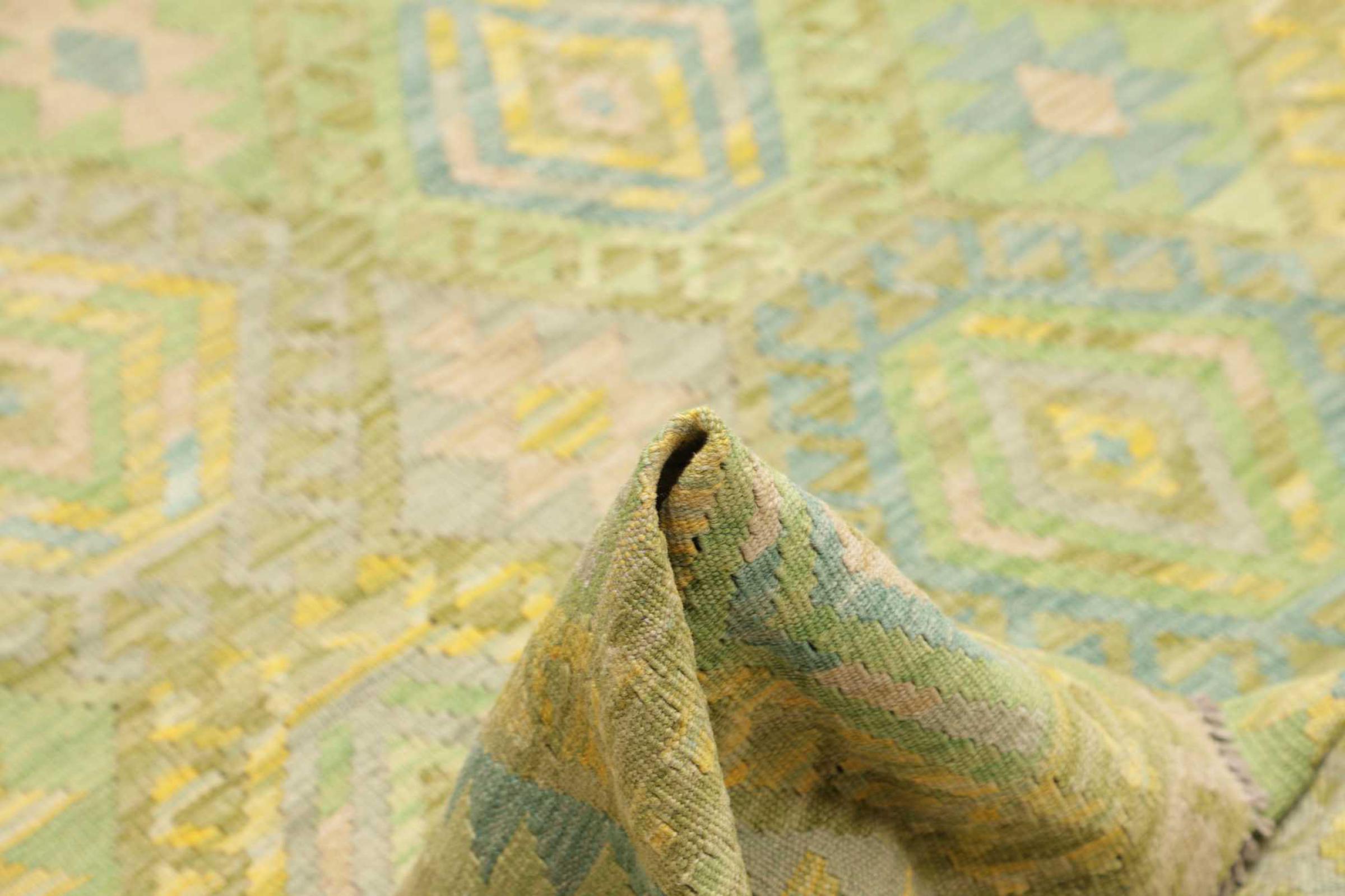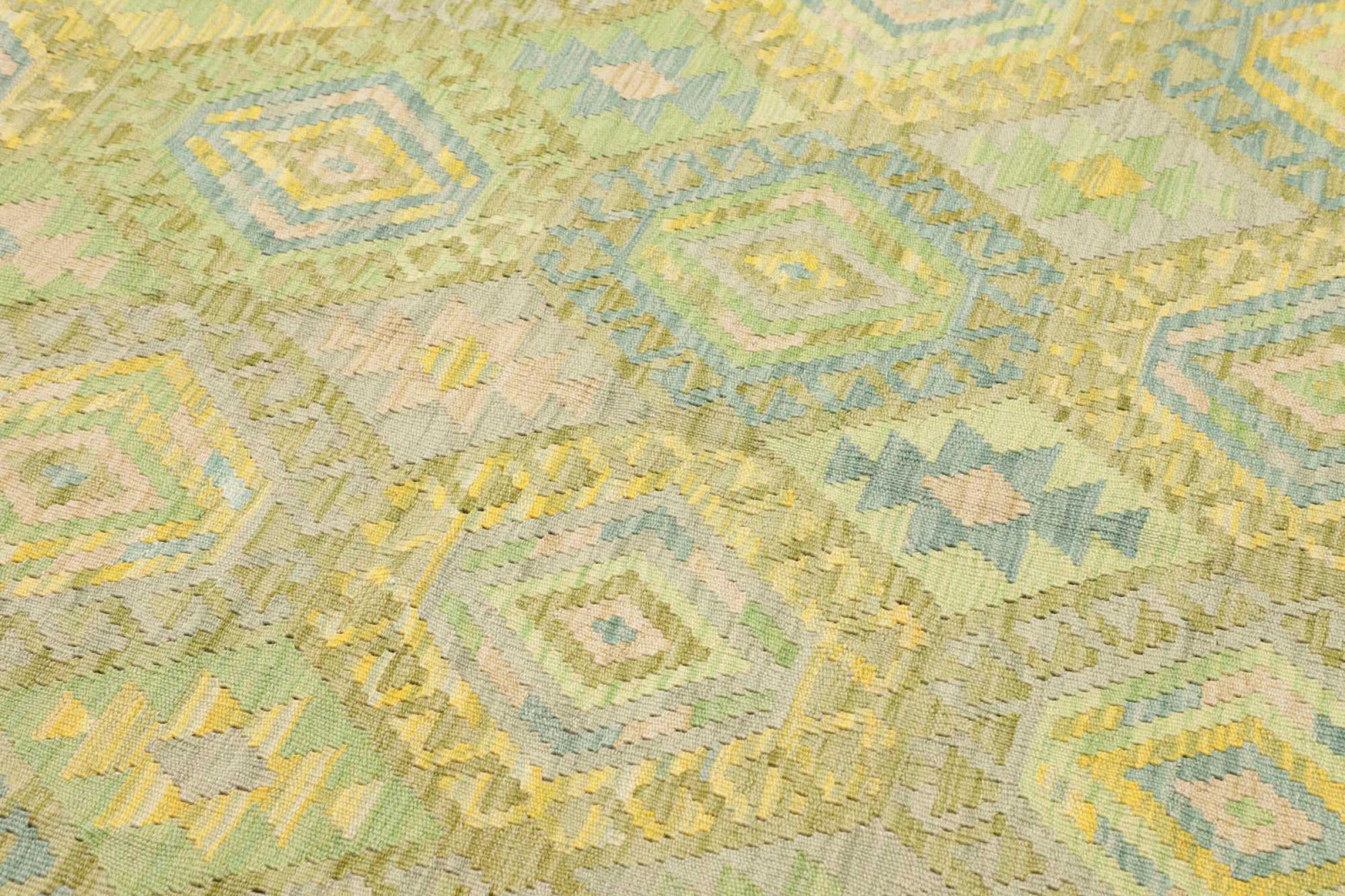 This rug was made as a flat weave by hand on a loom. Flatweave is the term used to describe rugs that have no pile. As the name promises, these rugs are woven and not knotted. This results in a flat rug with a structured surface. Flatweaves are not as soft and usually thinner than knotted rugs. At the same time they are much less complex to manufacture and can usually be laid out from both sides (front and back). Their patterns are usually geometric, which is determined by the fabric.