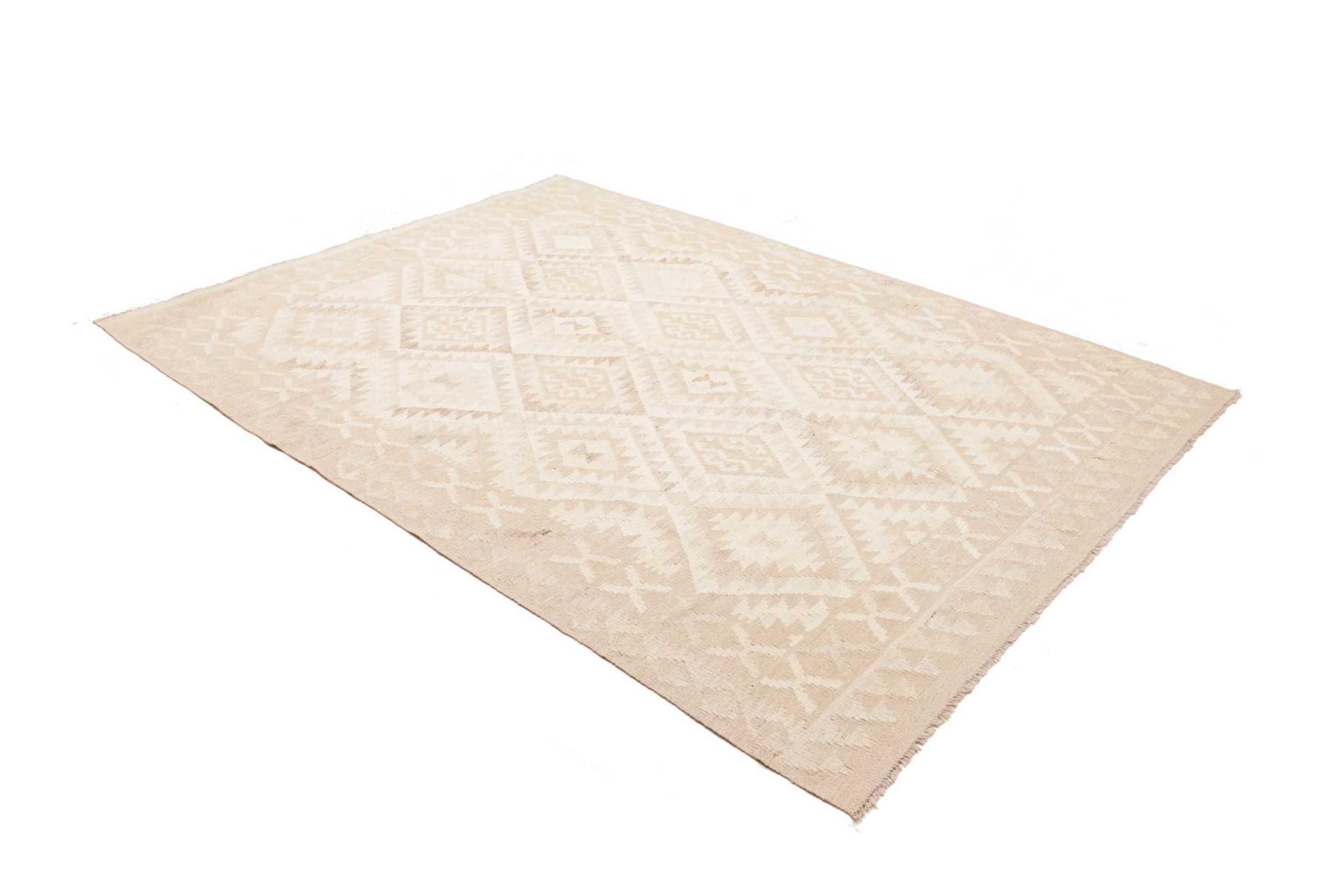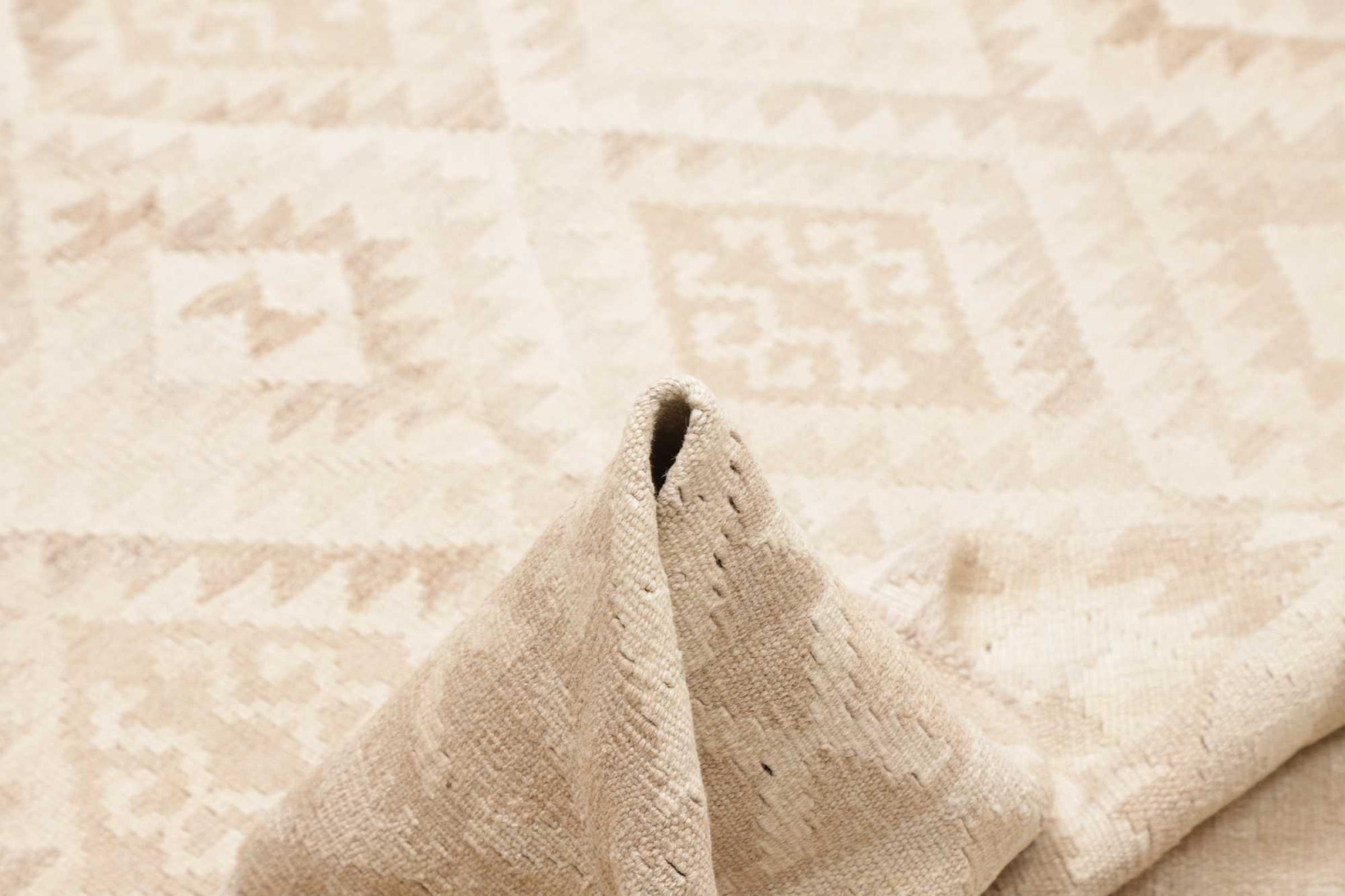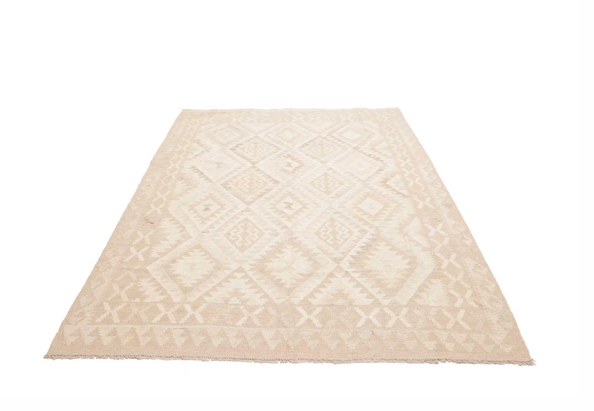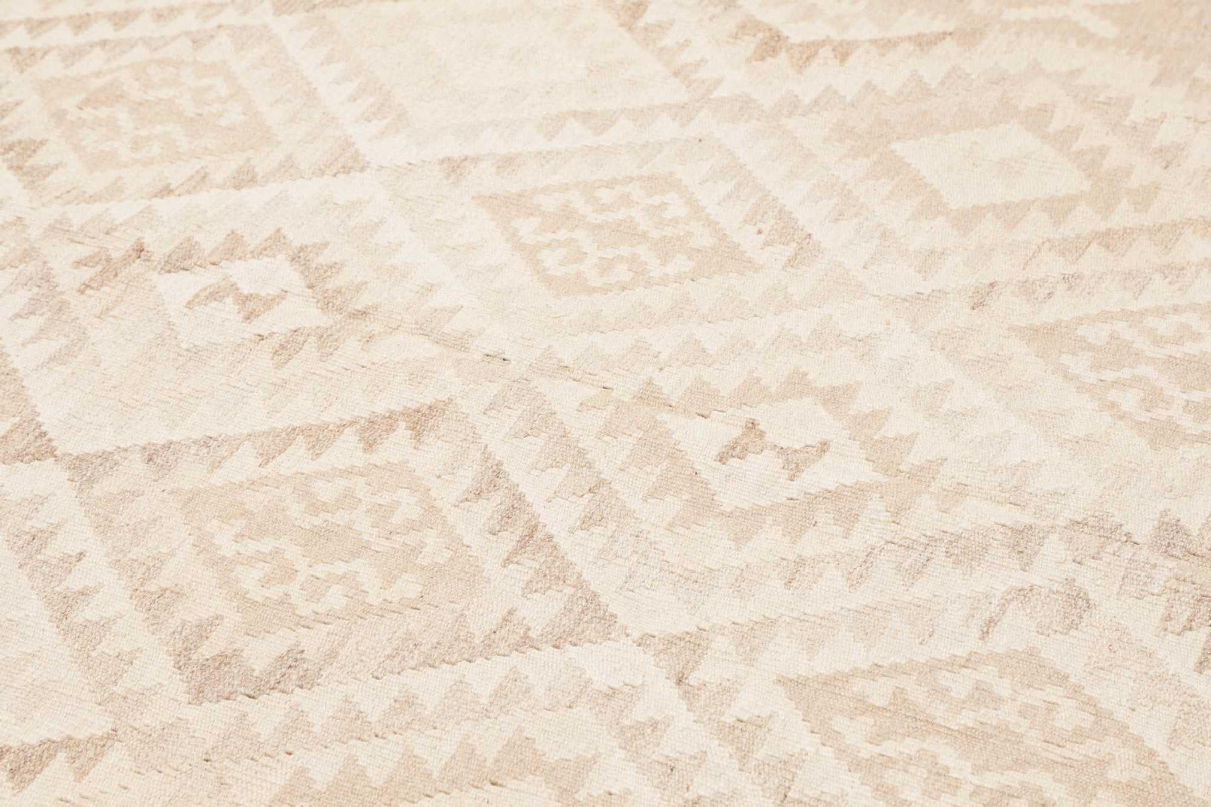 This rug was made as a flat weave by hand on a loom. Flatweave is the term used to describe rugs that have no pile. As the name promises, these rugs are woven and not knotted. This results in a flat rug with a structured surface. Flatweaves are not as soft and usually thinner than knotted rugs. At the same time they are much less complex to manufacture and can usually be laid out from both sides (front and back). Their patterns are usually geometric, which is determined by the fabric.