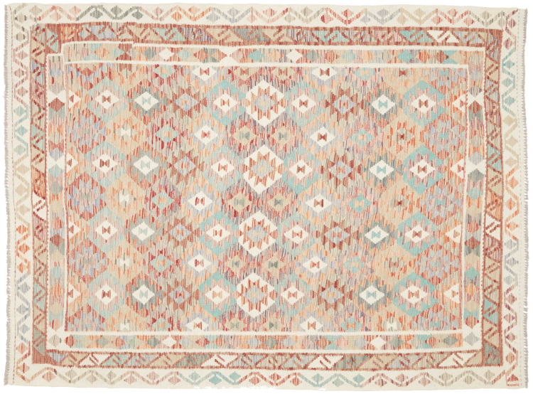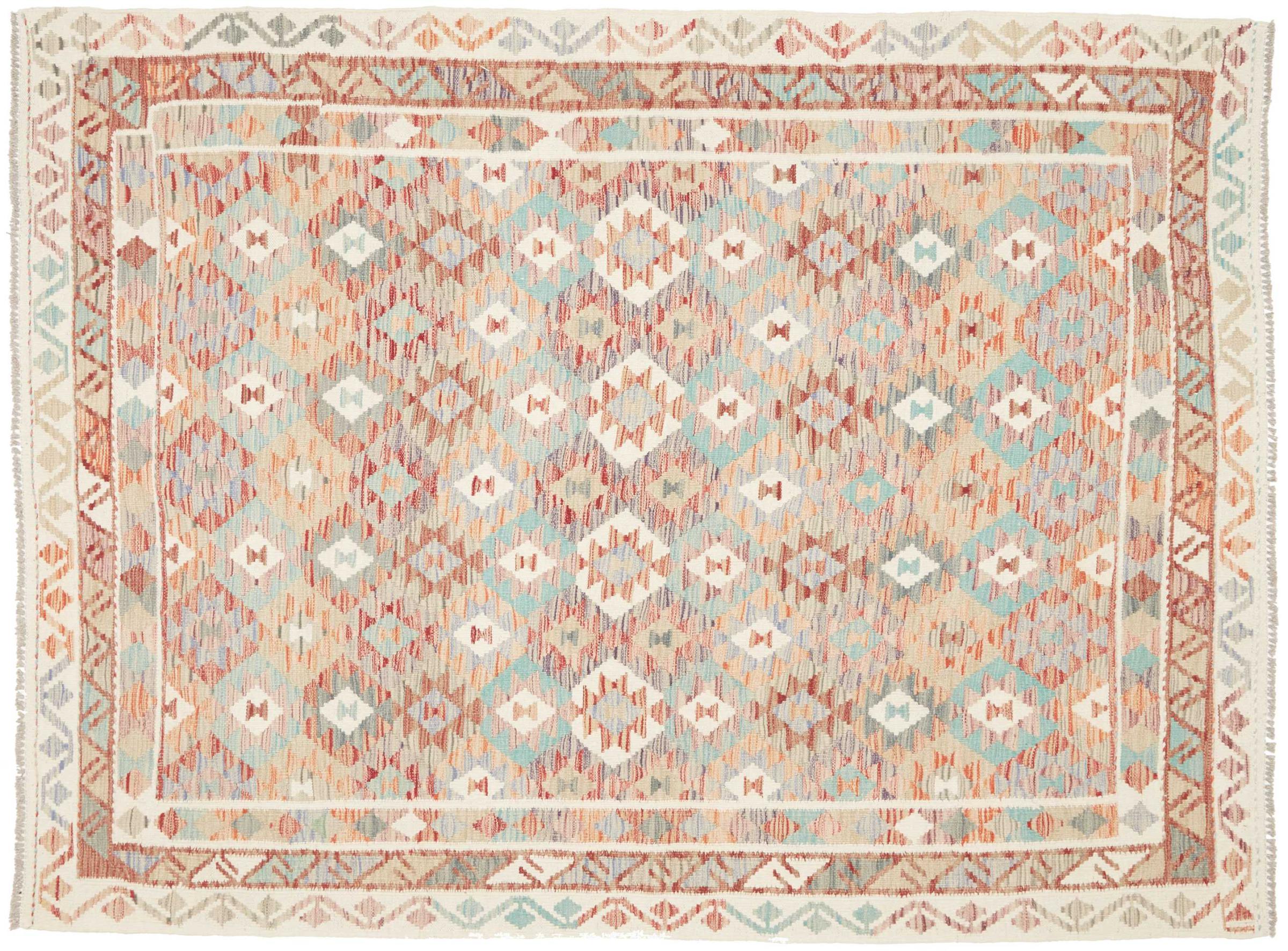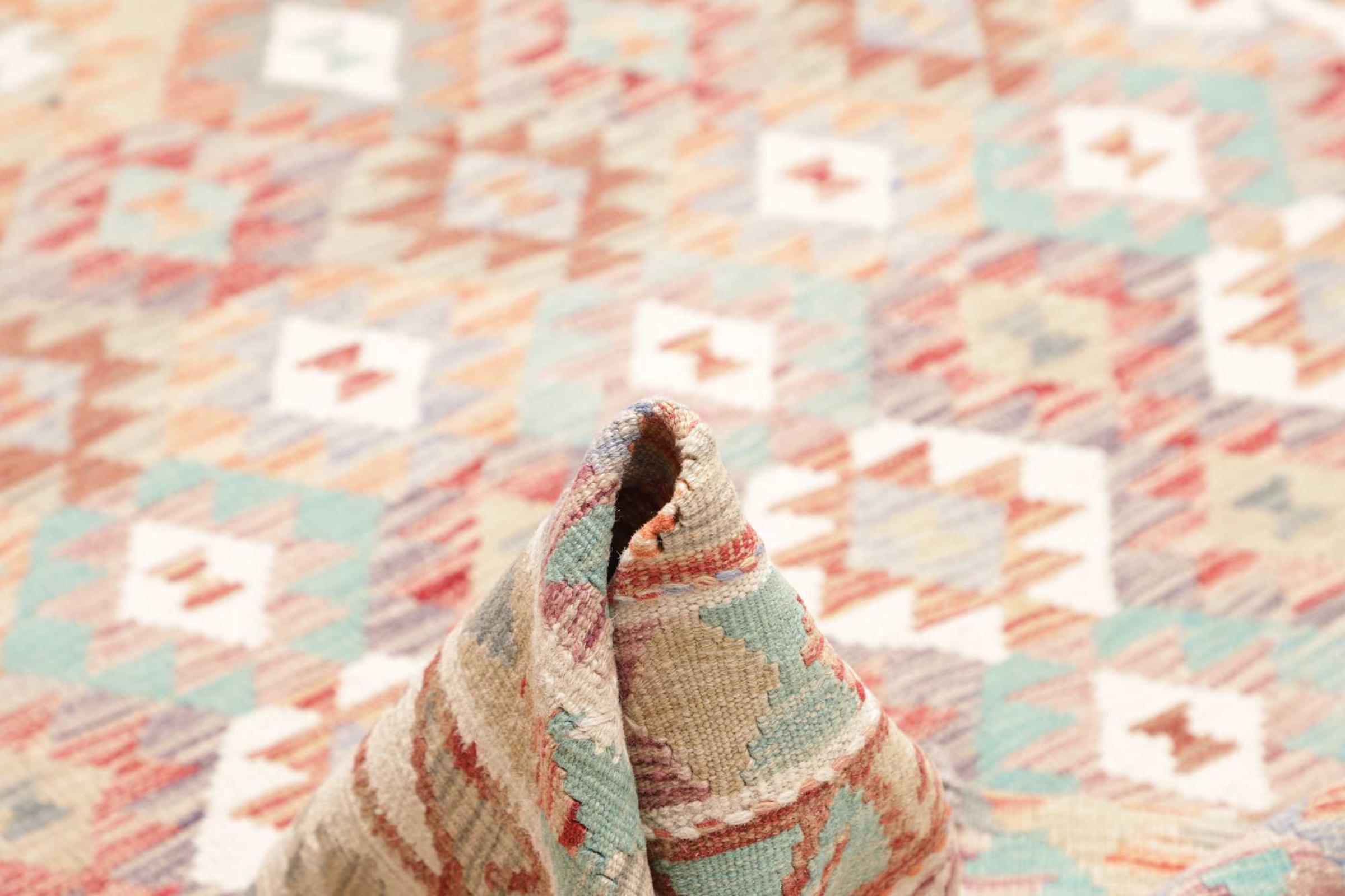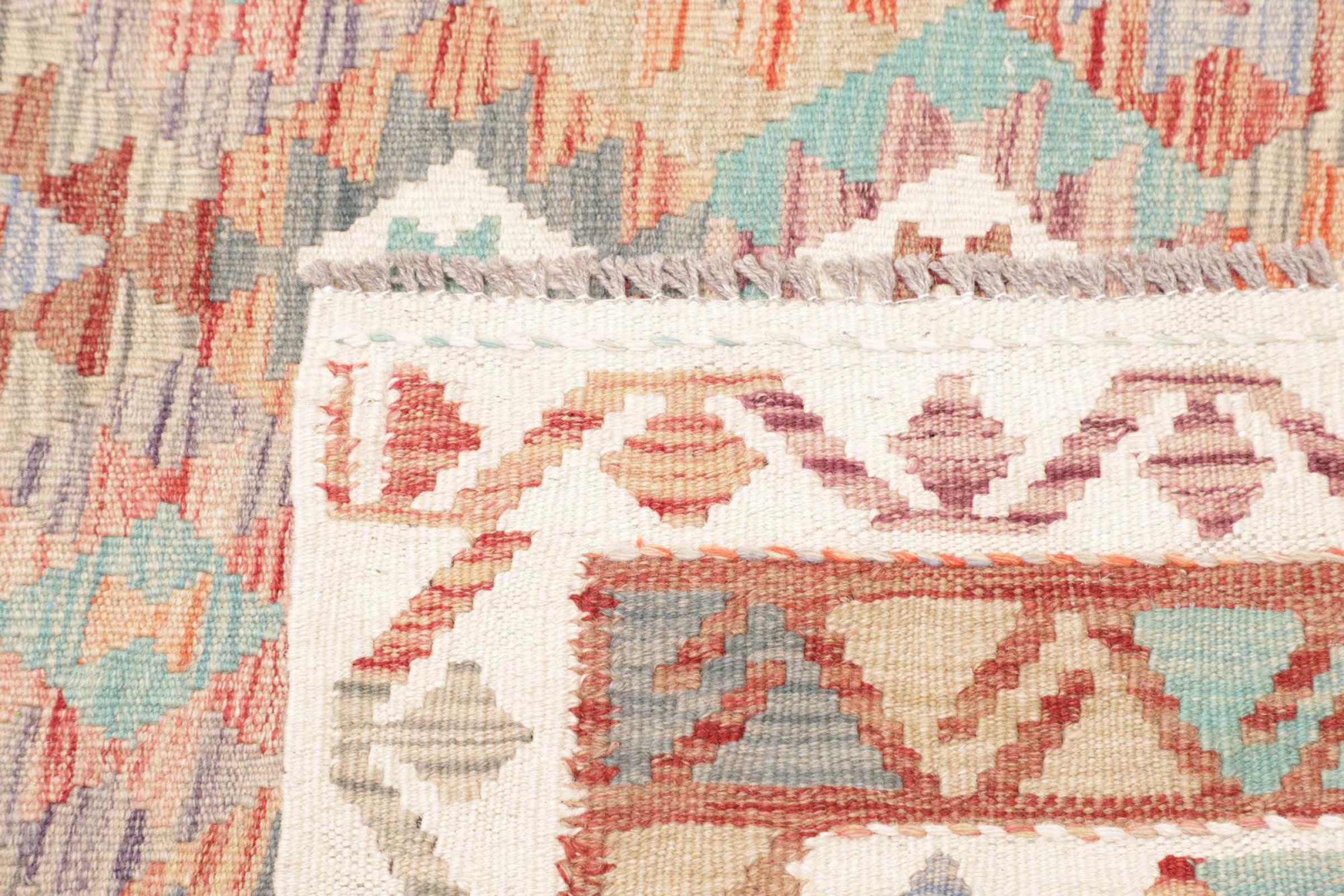 This rug was made as a flat weave by hand on a loom. Flatweave is the term used to describe rugs that have no pile. As the name promises, these rugs are woven and not knotted. This results in a flat rug with a structured surface. Flatweaves are not as soft and usually thinner than knotted rugs. At the same time they are much less complex to manufacture and can usually be laid out from both sides (front and back). Their patterns are usually geometric, which is determined by the fabric.