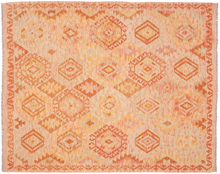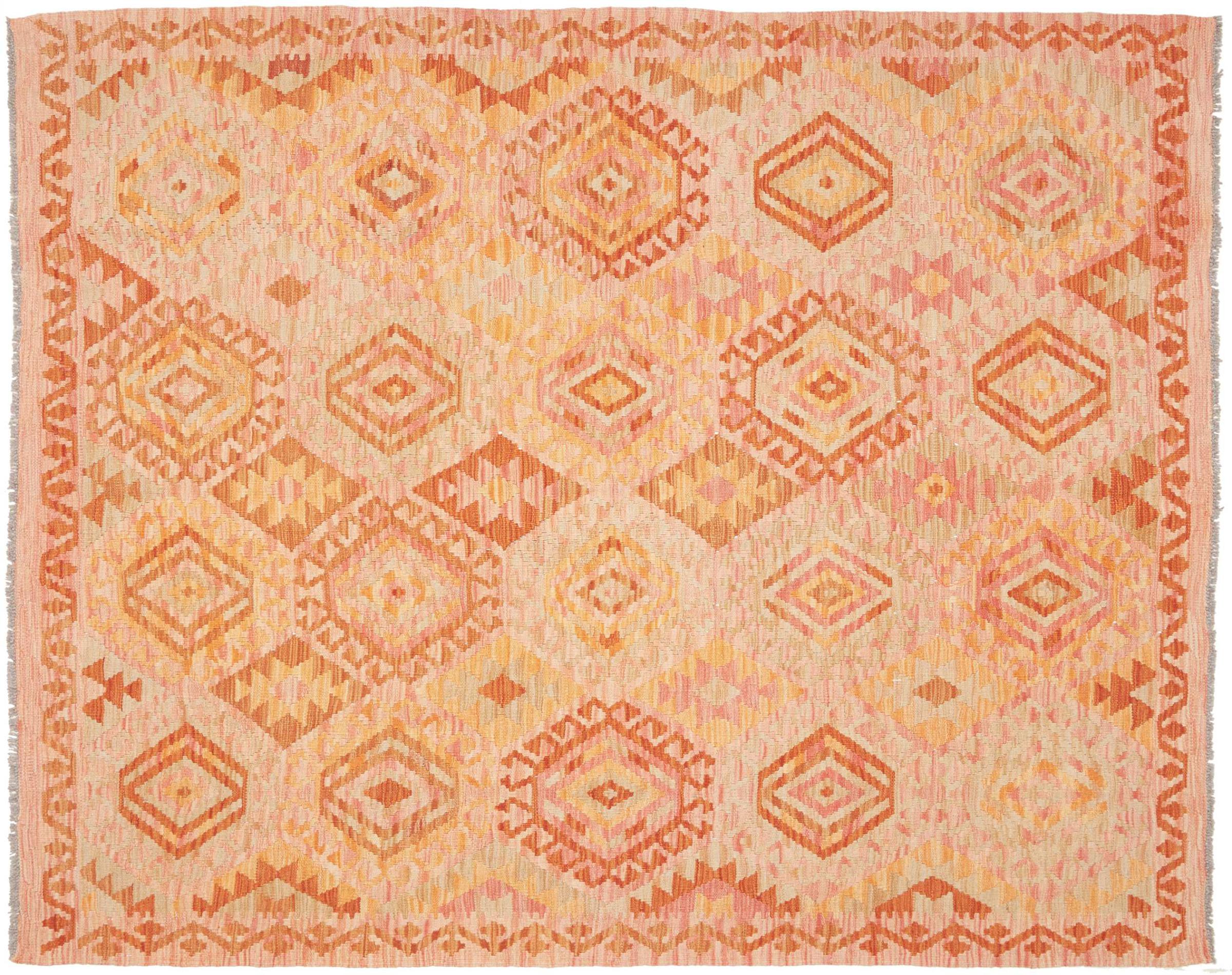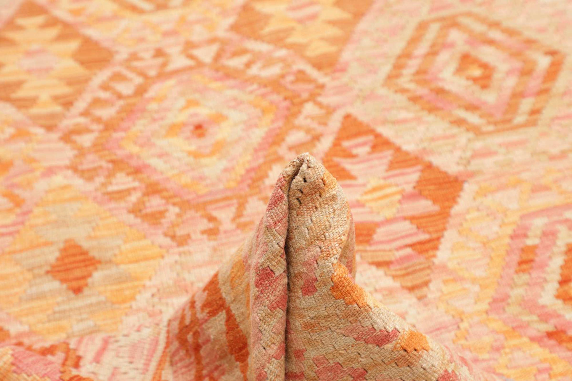 This rug was made as a flat weave by hand on a loom. Flatweave is the term used to describe rugs that have no pile. As the name promises, these rugs are woven and not knotted. This results in a flat rug with a structured surface. Flatweaves are not as soft and usually thinner than knotted rugs. At the same time they are much less complex to manufacture and can usually be laid out from both sides (front and back). Their patterns are usually geometric, which is determined by the fabric.