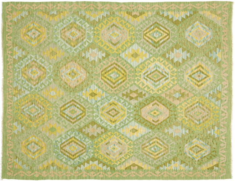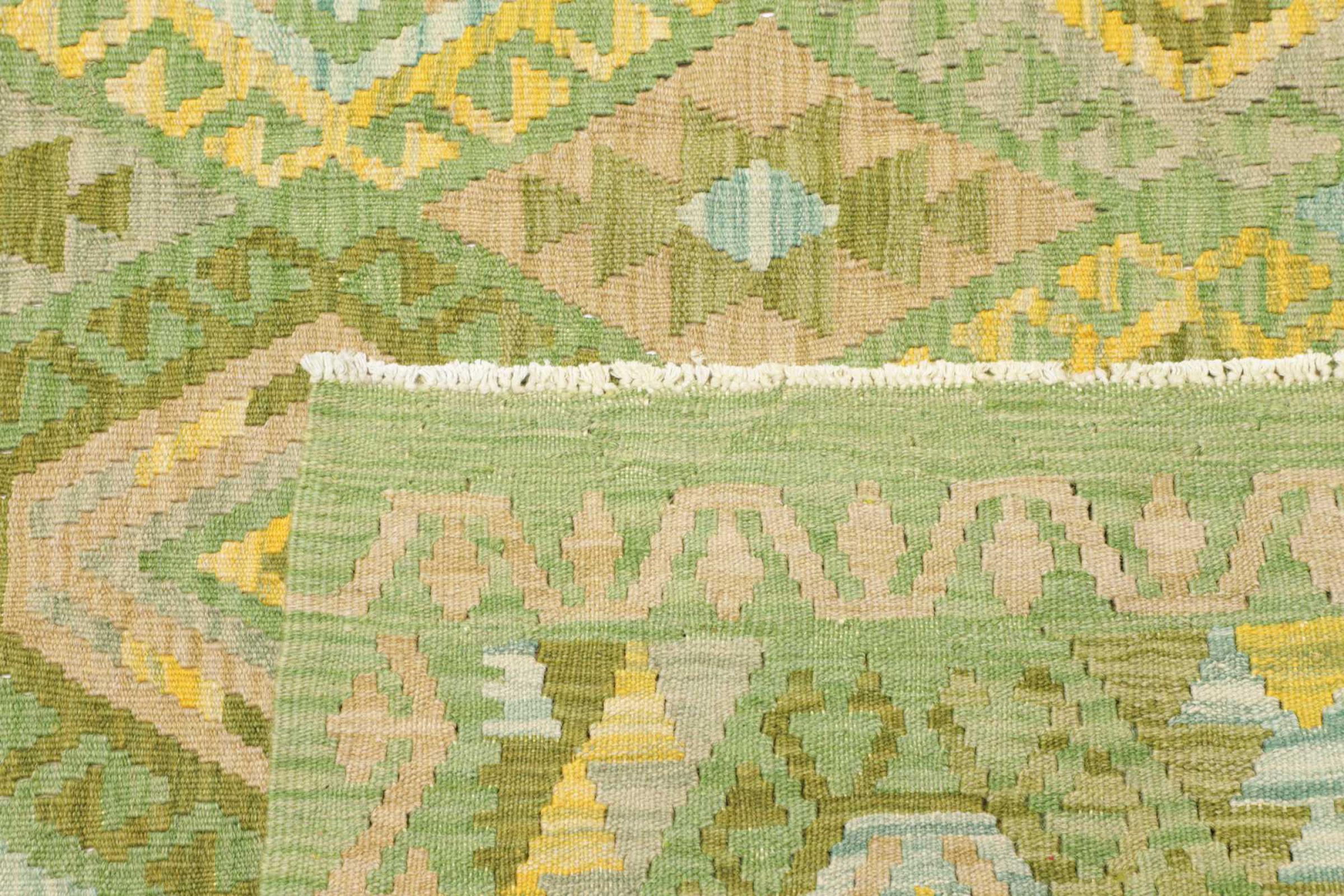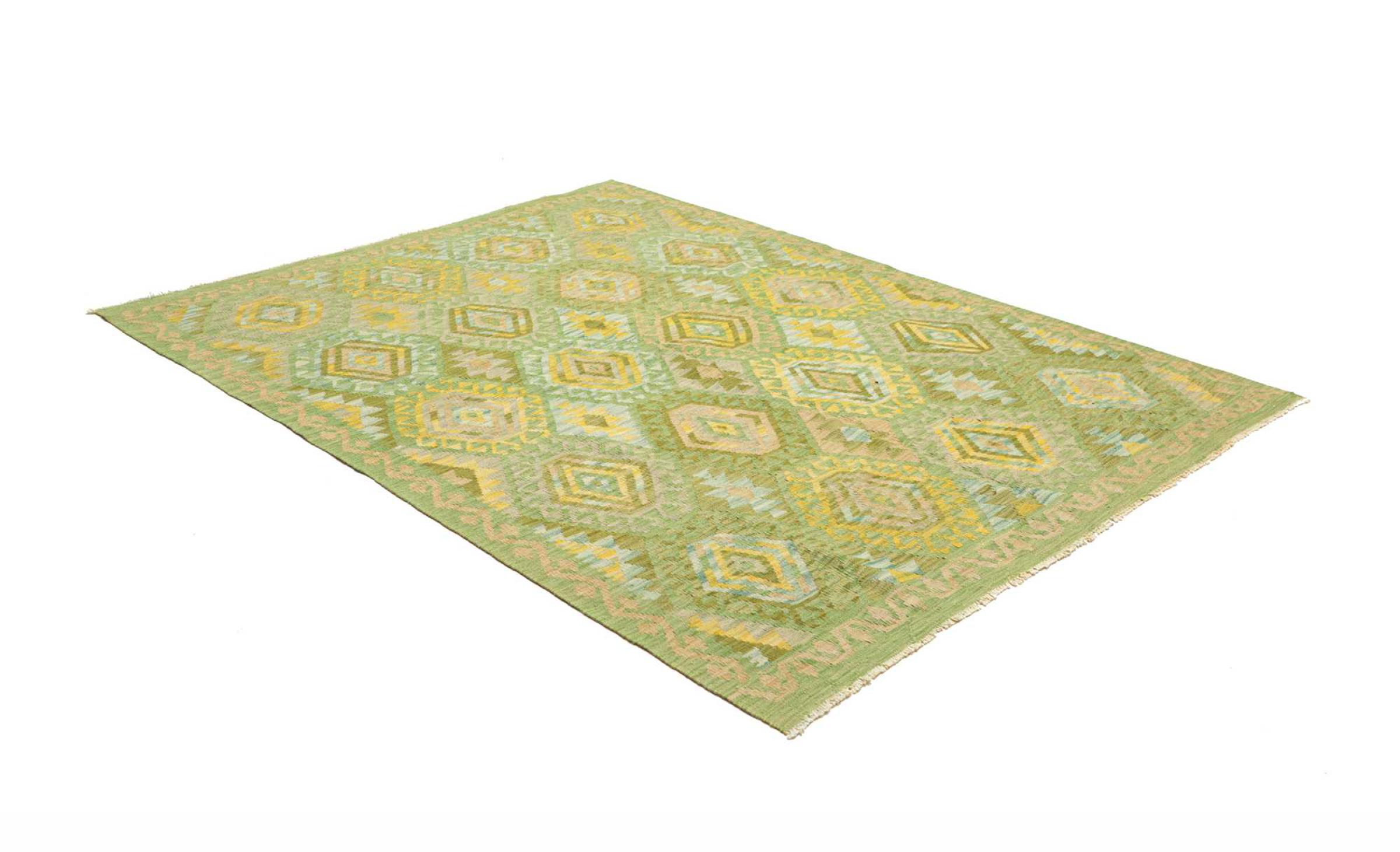 This rug was made as a flat weave by hand on a loom. Flatweave is the term used to describe rugs that have no pile. As the name promises, these rugs are woven and not knotted. This results in a flat rug with a structured surface. Flatweaves are not as soft and usually thinner than knotted rugs. At the same time they are much less complex to manufacture and can usually be laid out from both sides (front and back). Their patterns are usually geometric, which is determined by the fabric.