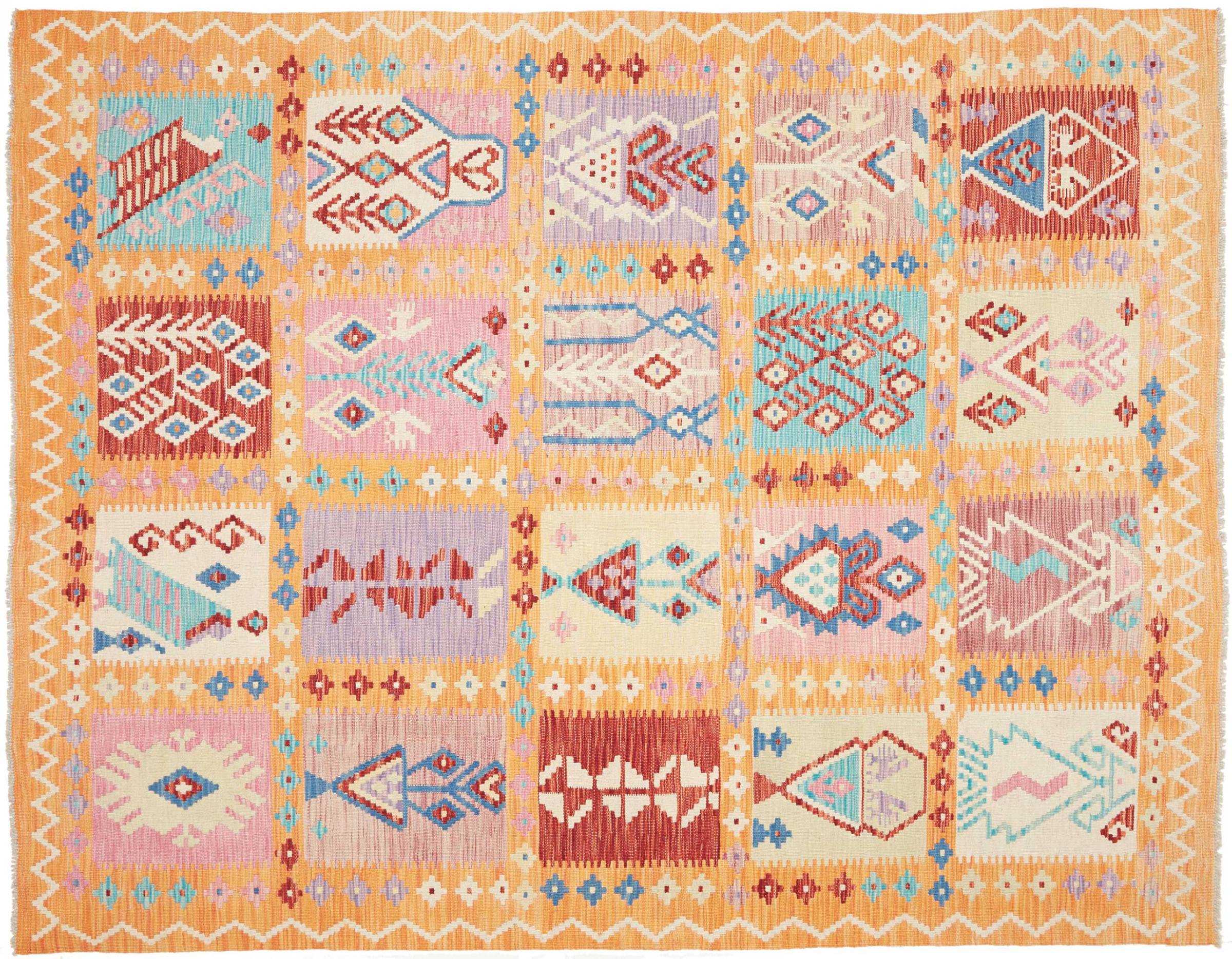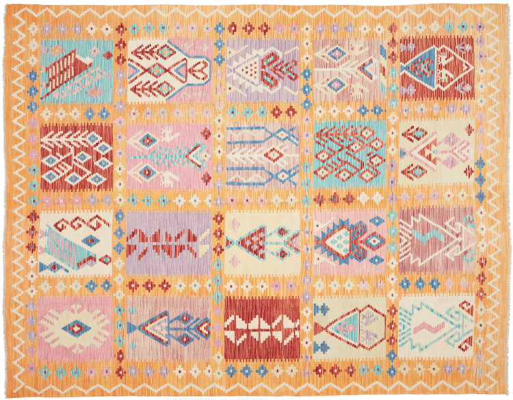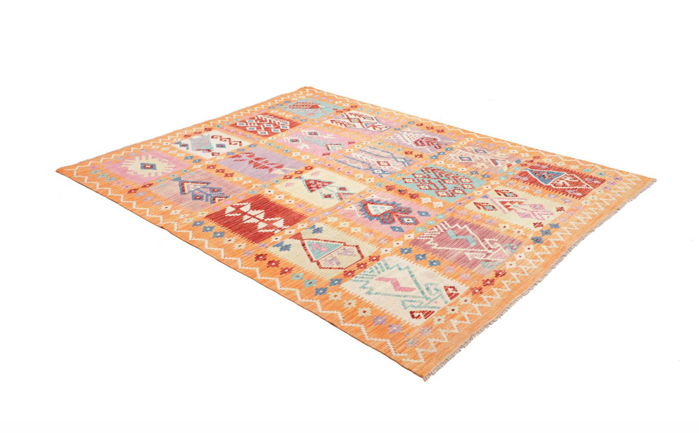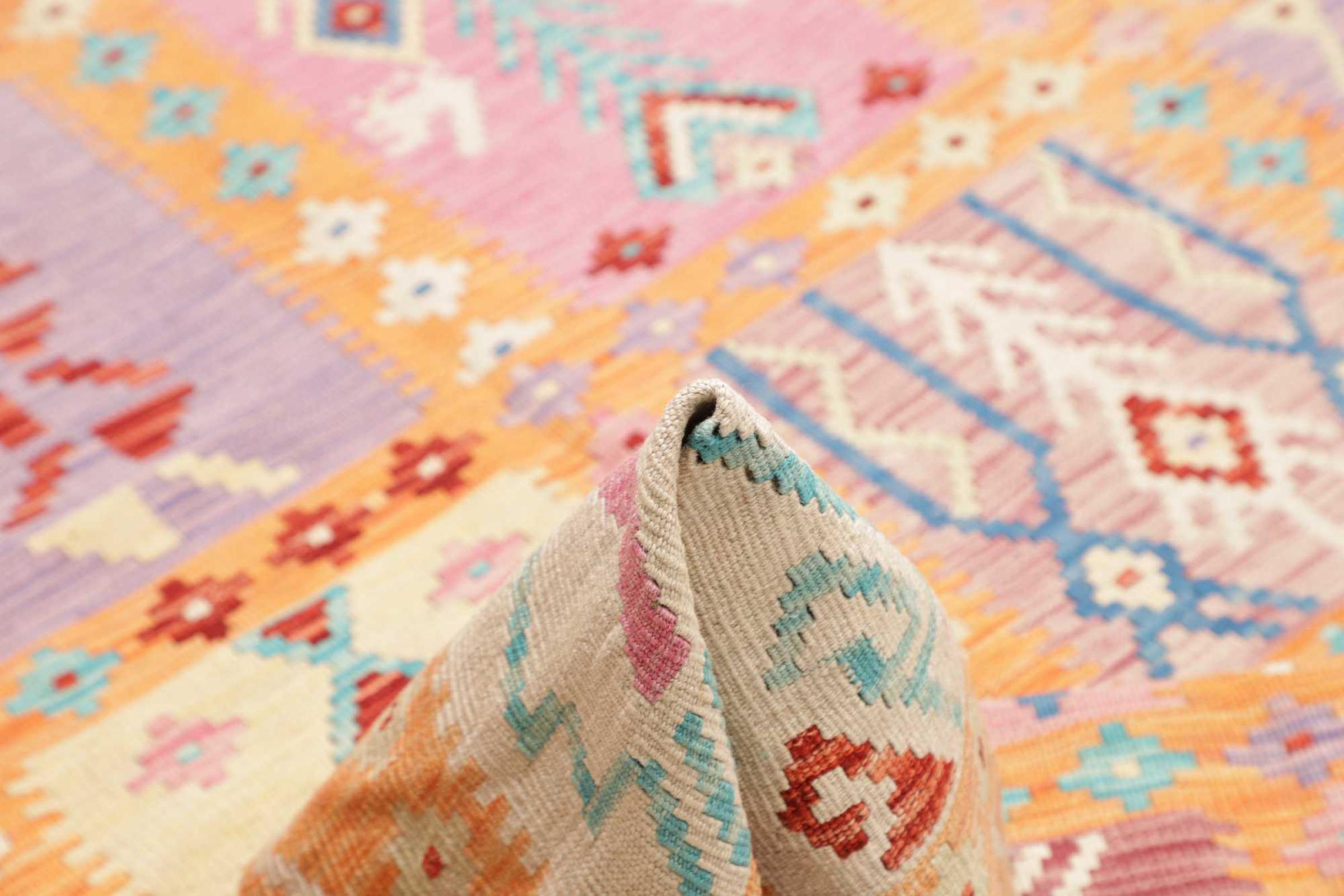 This rug was made as a flat weave by hand on a loom. Flatweave is the term used to describe rugs that have no pile. As the name promises, these rugs are woven and not knotted. This results in a flat rug with a structured surface. Flatweaves are not as soft and usually thinner than knotted rugs. At the same time they are much less complex to manufacture and can usually be laid out from both sides (front and back). Their patterns are usually geometric, which is determined by the fabric.
