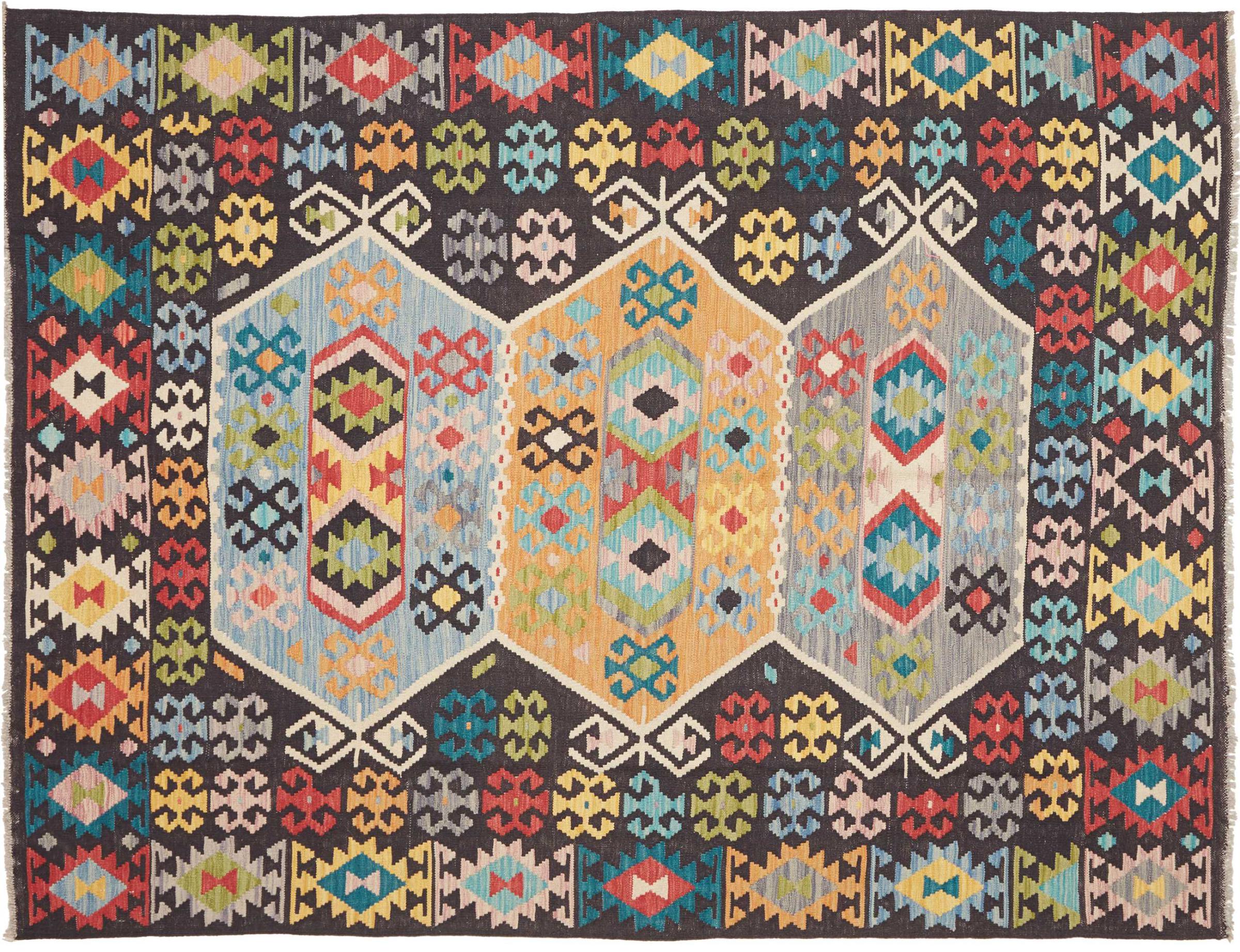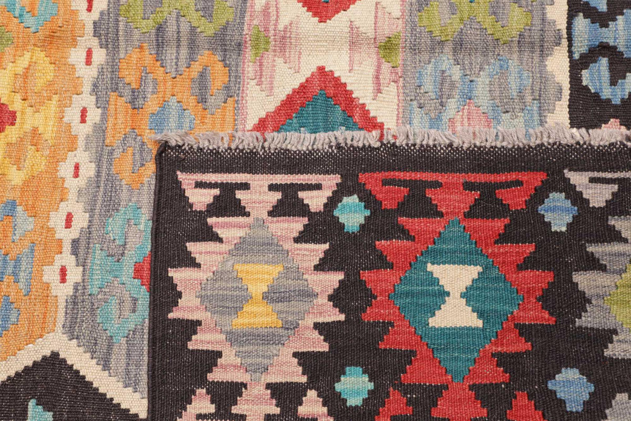 This rug was made as a flat weave by hand on a loom. Flatweave is the term used to describe rugs that have no pile. As the name promises, these rugs are woven and not knotted. This results in a flat rug with a structured surface. Flatweaves are not as soft and usually thinner than knotted rugs. At the same time they are much less complex to manufacture and can usually be laid out from both sides (front and back). Their patterns are usually geometric, which is determined by the fabric.