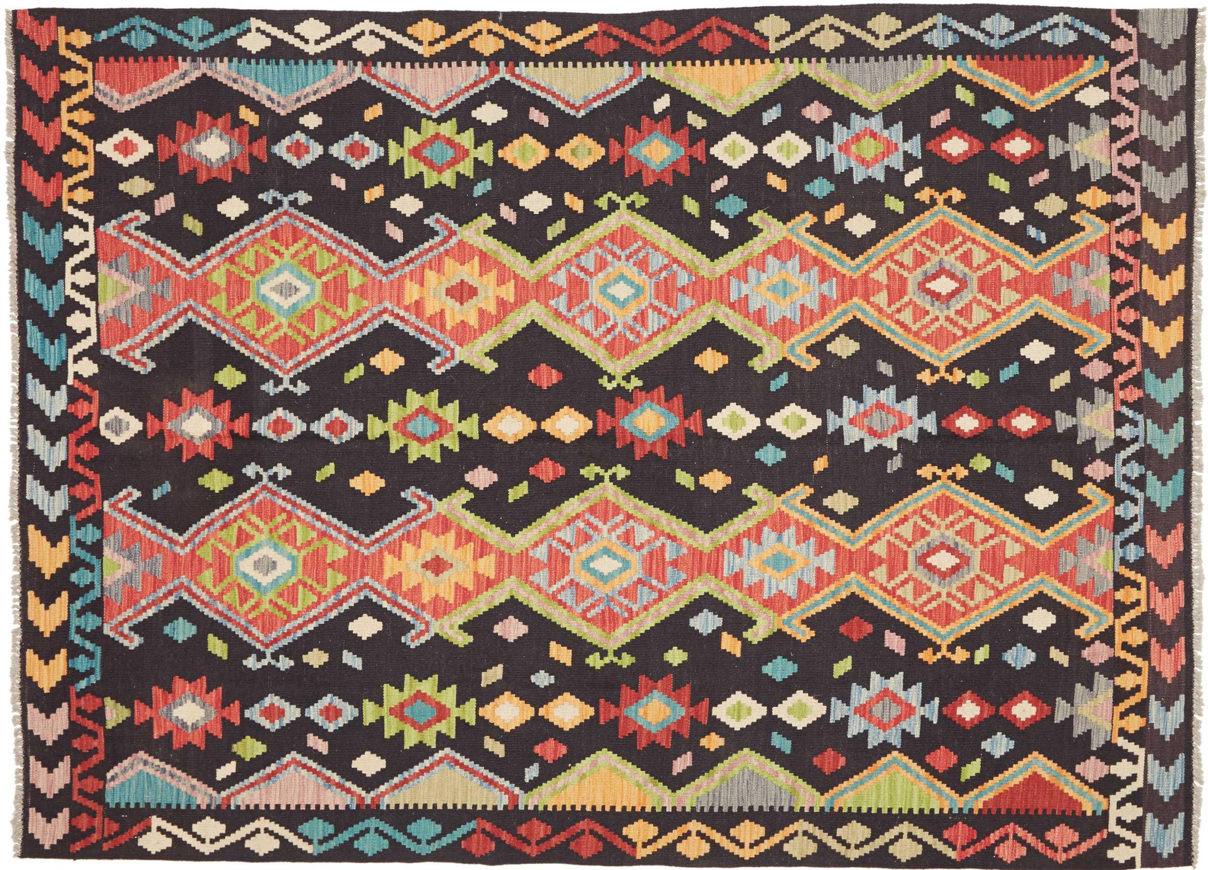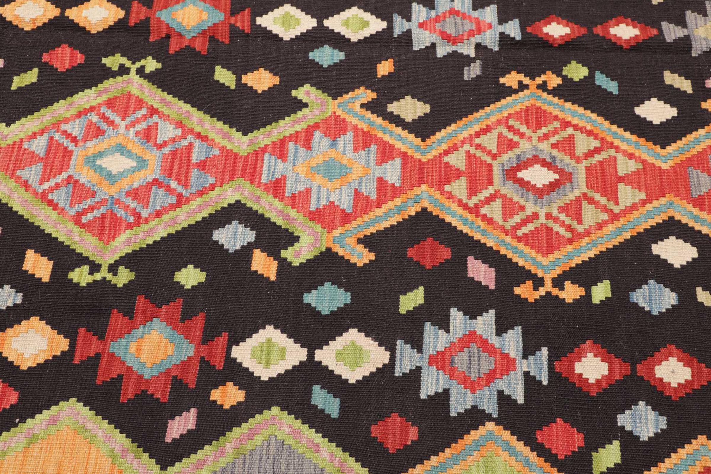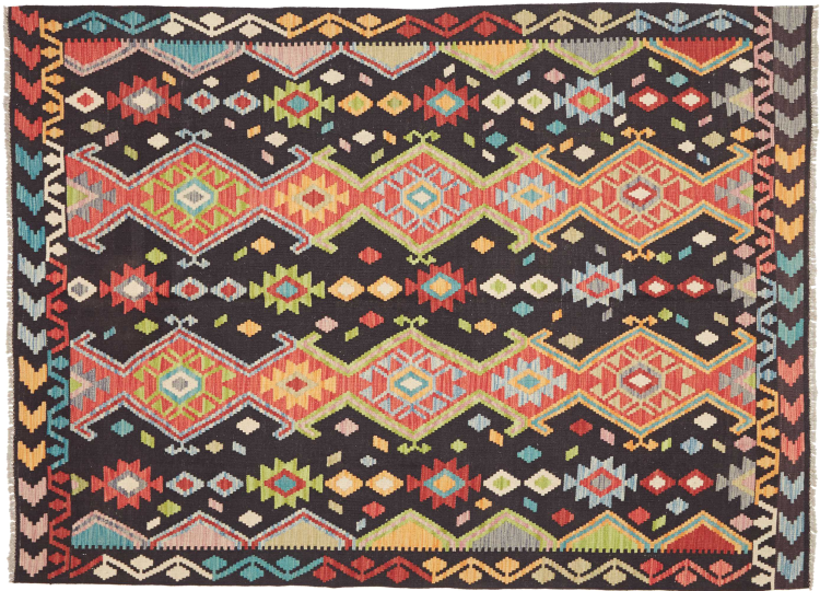 This rug was made as a flat weave by hand on a loom. Flatweave is the term used to describe rugs that have no pile. As the name promises, these rugs are woven and not knotted. This results in a flat rug with a structured surface. Flatweaves are not as soft and usually thinner than knotted rugs. At the same time they are much less complex to manufacture and can usually be laid out from both sides (front and back). Their patterns are usually geometric, which is determined by the fabric.