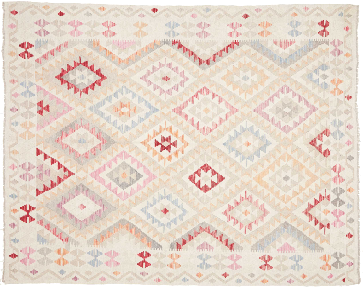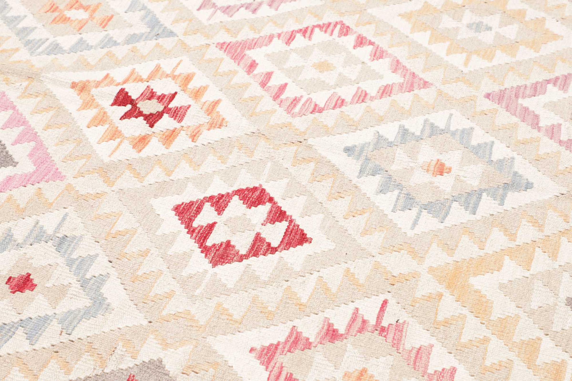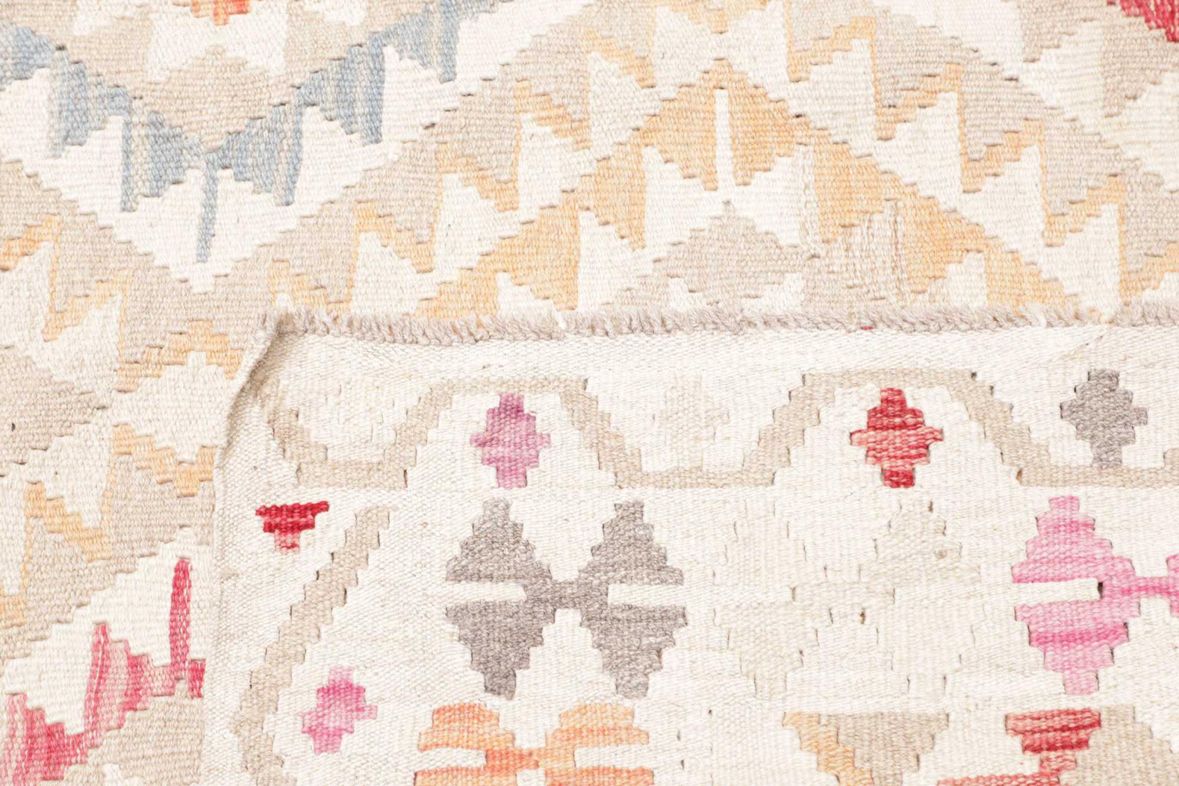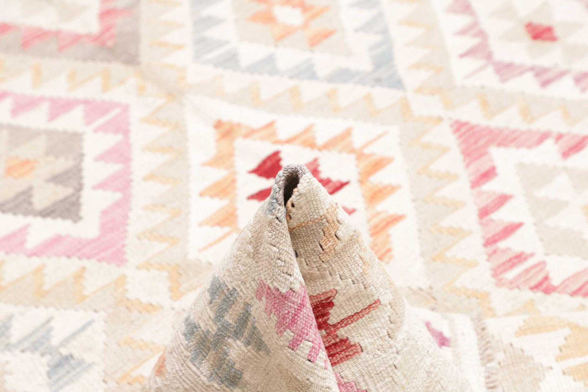 This rug was made as a flat weave by hand on a loom. Flatweave is the term used to describe rugs that have no pile. As the name promises, these rugs are woven and not knotted. This results in a flat rug with a structured surface. Flatweaves are not as soft and usually thinner than knotted rugs. At the same time they are much less complex to manufacture and can usually be laid out from both sides (front and back). Their patterns are usually geometric, which is determined by the fabric.