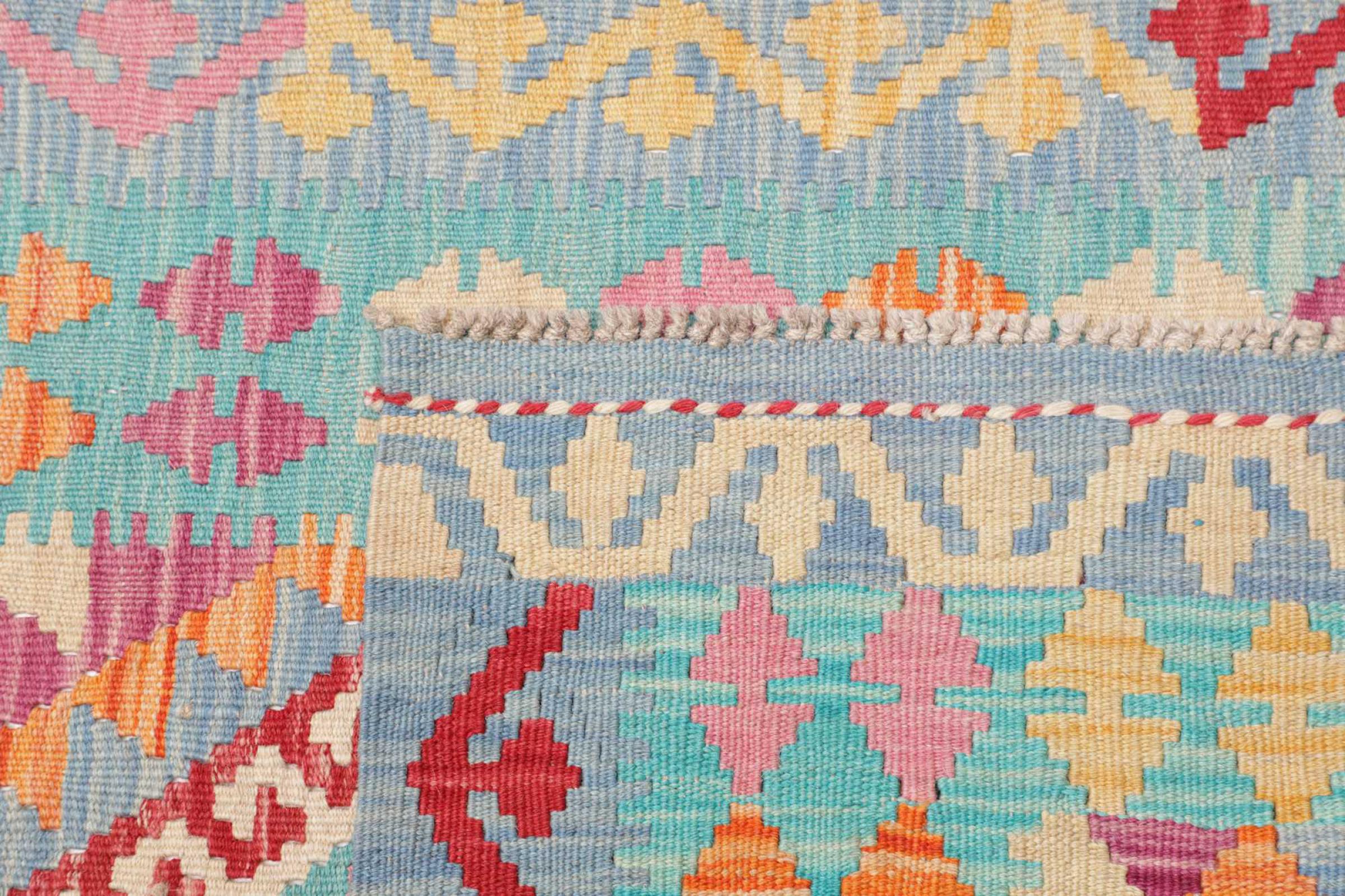 This rug was made as a flat weave by hand on a loom. Flatweave is the term used to describe rugs that have no pile. As the name promises, these rugs are woven and not knotted. This results in a flat rug with a structured surface. Flatweaves are not as soft and usually thinner than knotted rugs. At the same time they are much less complex to manufacture and can usually be laid out from both sides (front and back). Their patterns are usually geometric, which is determined by the fabric.