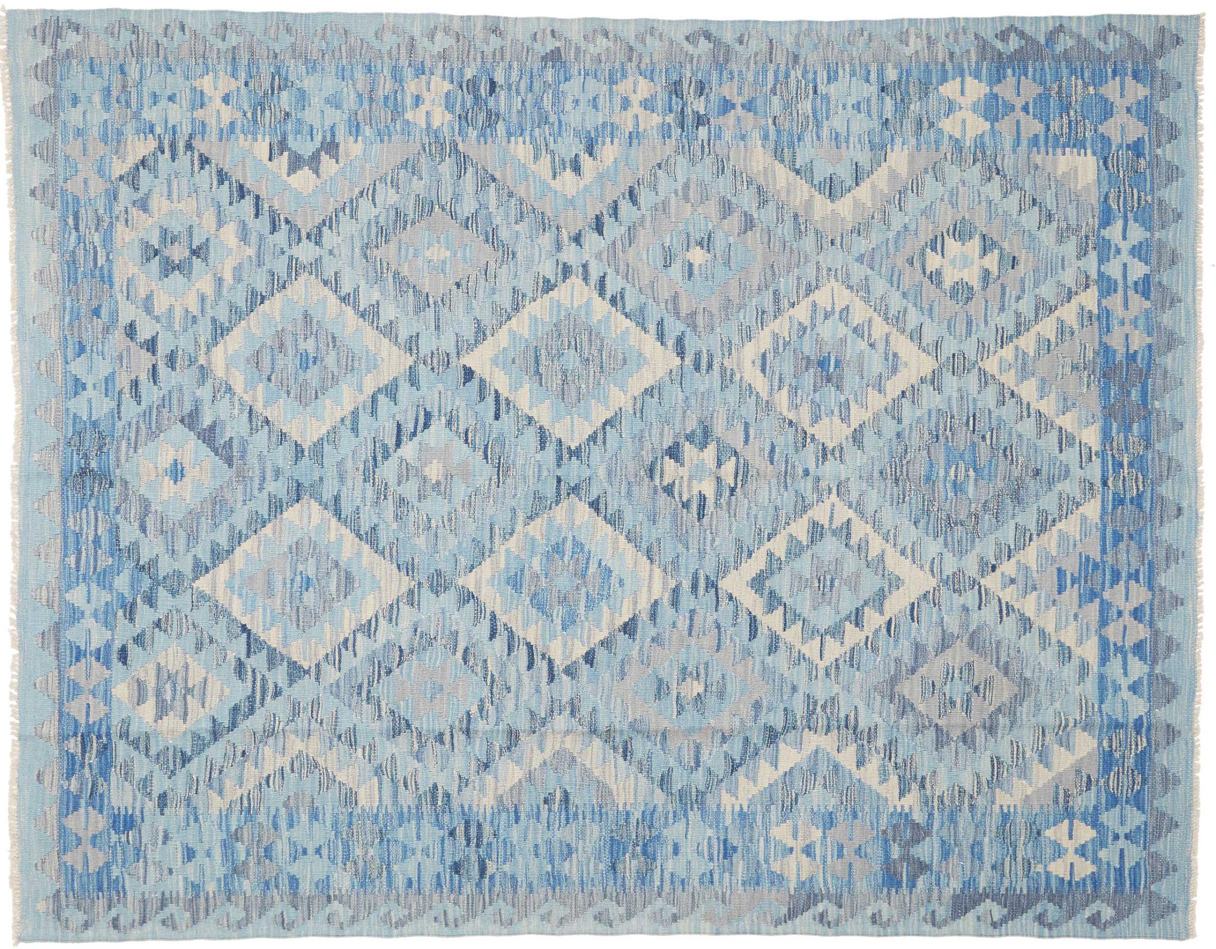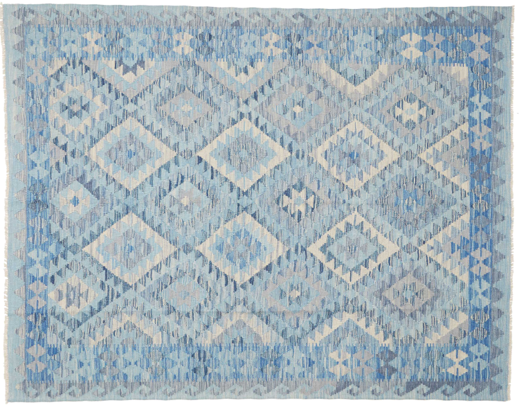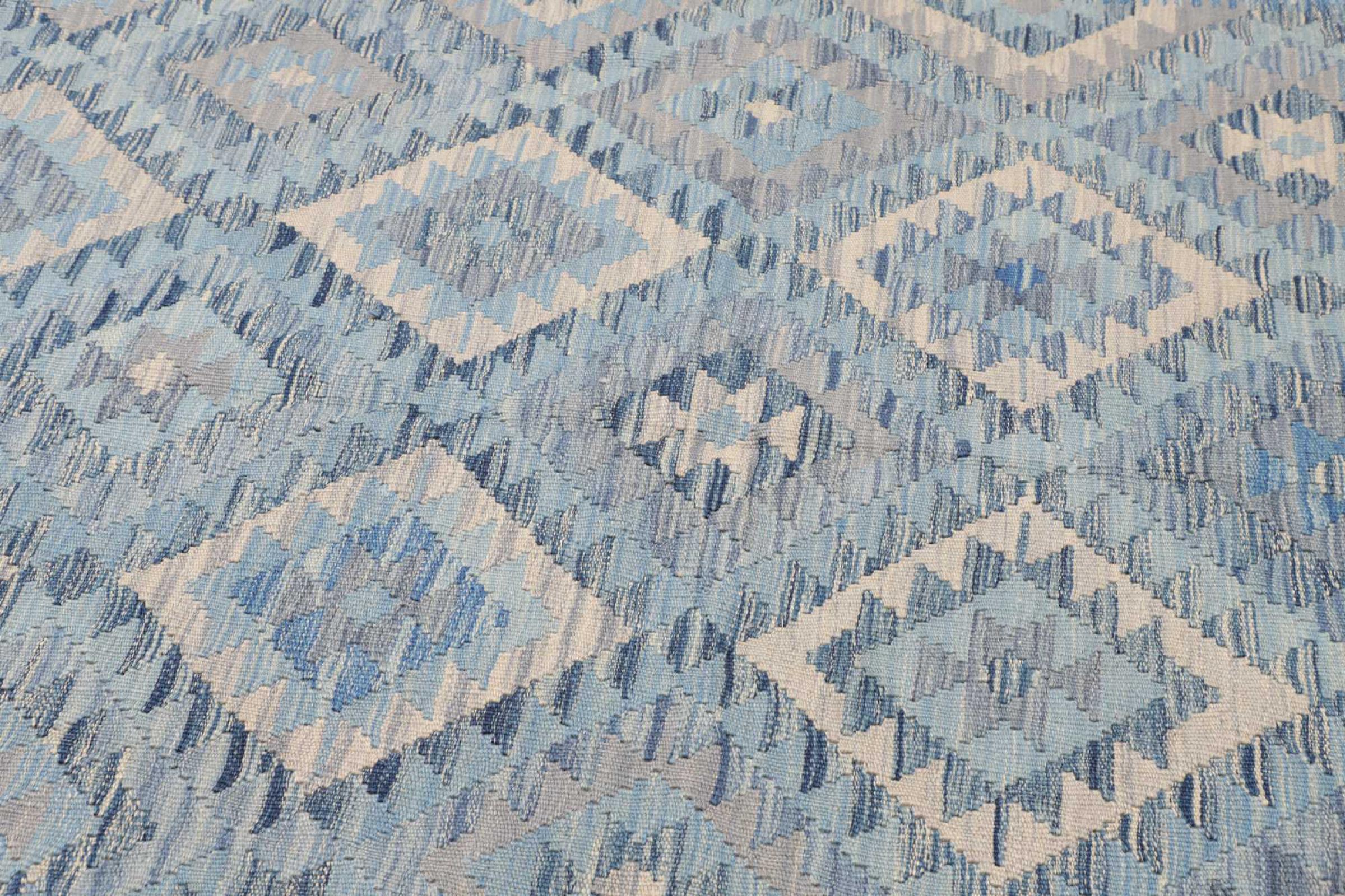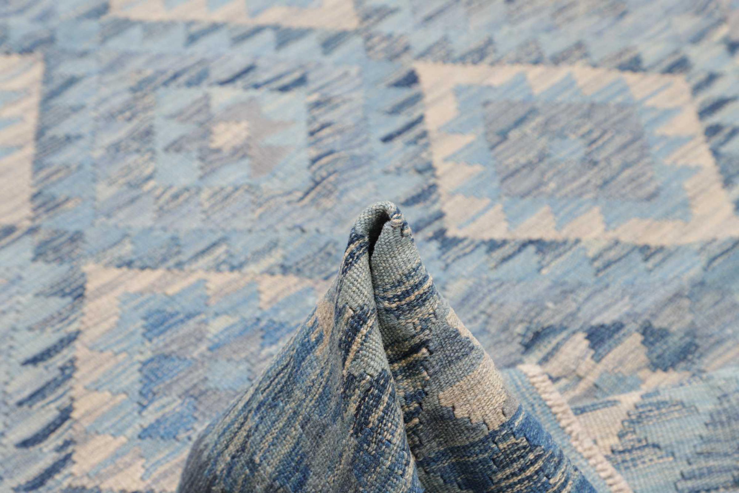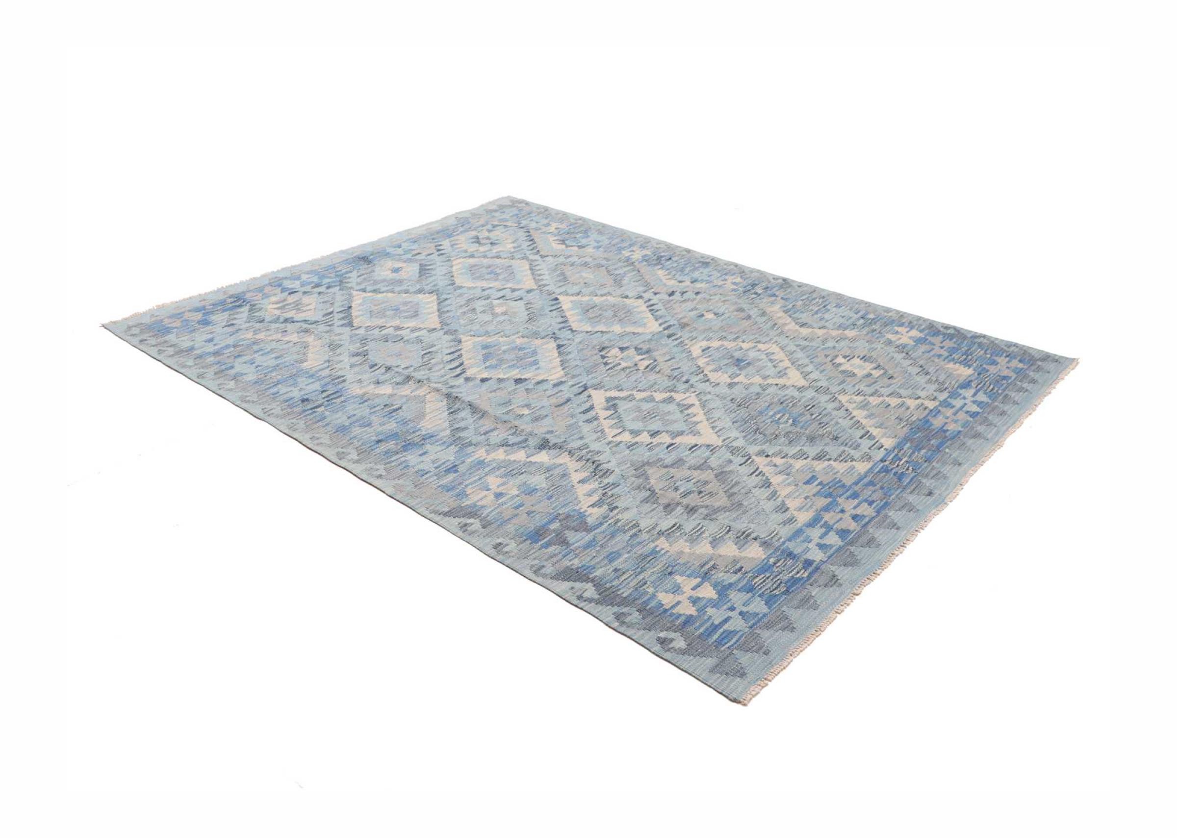 This rug was made as a flat weave by hand on a loom. Flatweave is the term used to describe rugs that have no pile. As the name promises, these rugs are woven and not knotted. This results in a flat rug with a structured surface. Flatweaves are not as soft and usually thinner than knotted rugs. At the same time they are much less complex to manufacture and can usually be laid out from both sides (front and back). Their patterns are usually geometric, which is determined by the fabric.