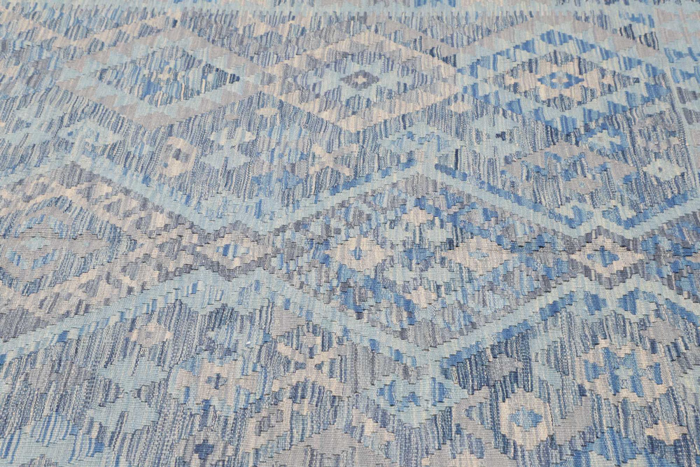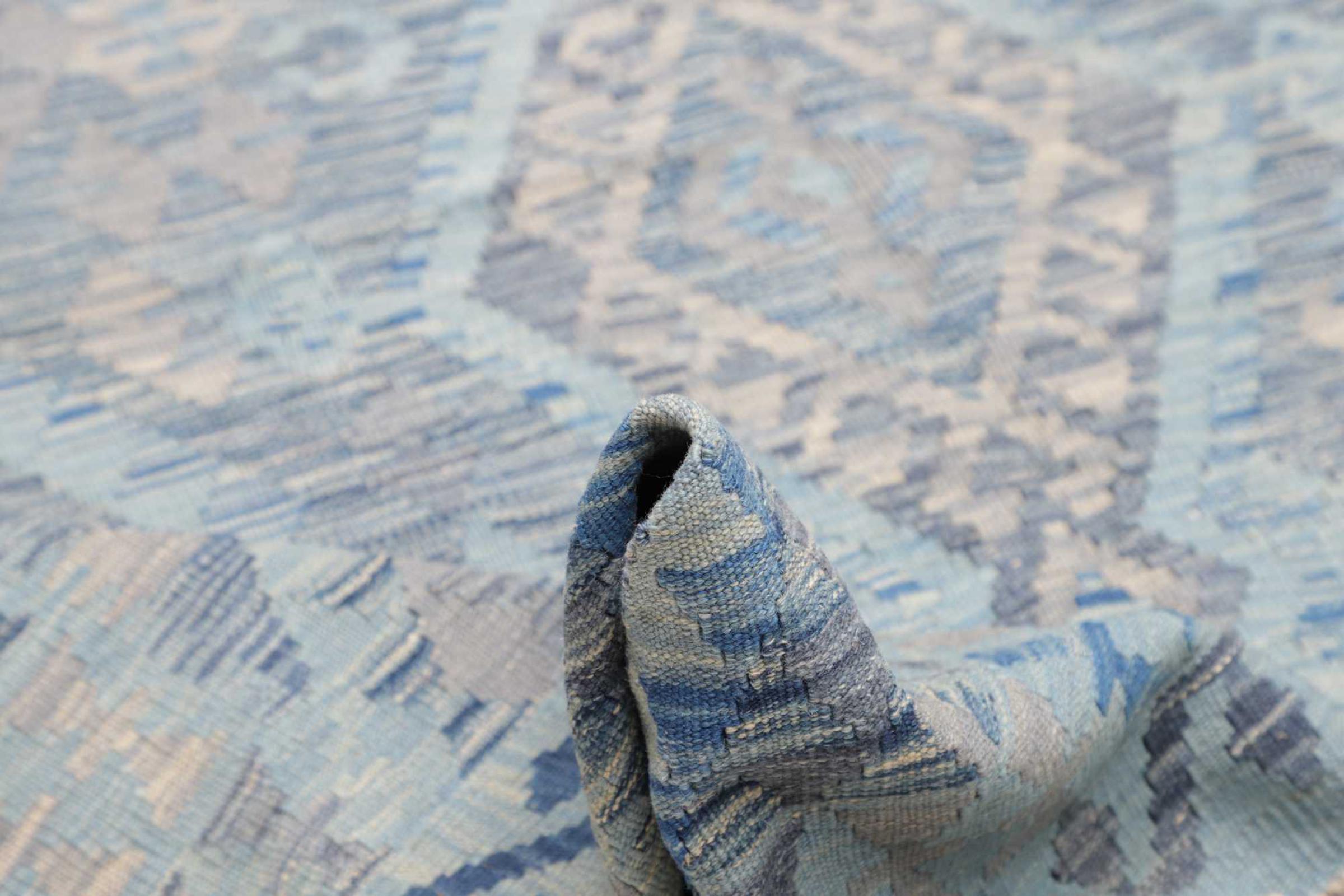 This rug was made as a flat weave by hand on a loom. Flatweave is the term used to describe rugs that have no pile. As the name promises, these rugs are woven and not knotted. This results in a flat rug with a structured surface. Flatweaves are not as soft and usually thinner than knotted rugs. At the same time they are much less complex to manufacture and can usually be laid out from both sides (front and back). Their patterns are usually geometric, which is determined by the fabric.