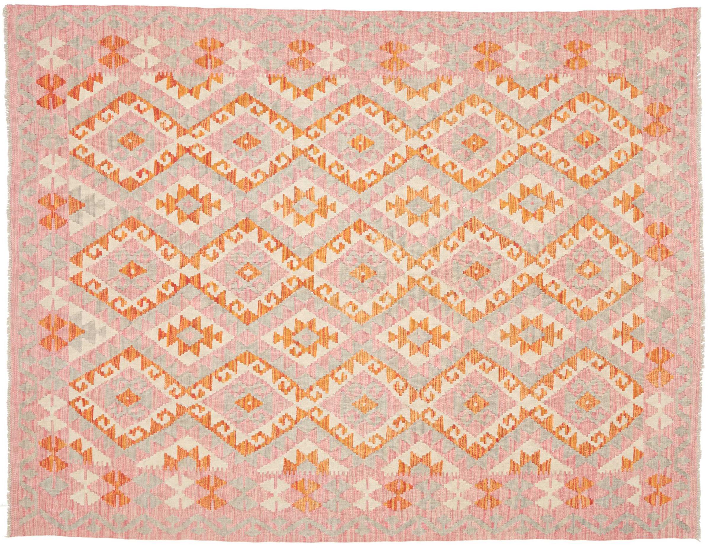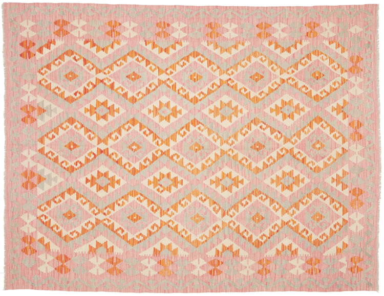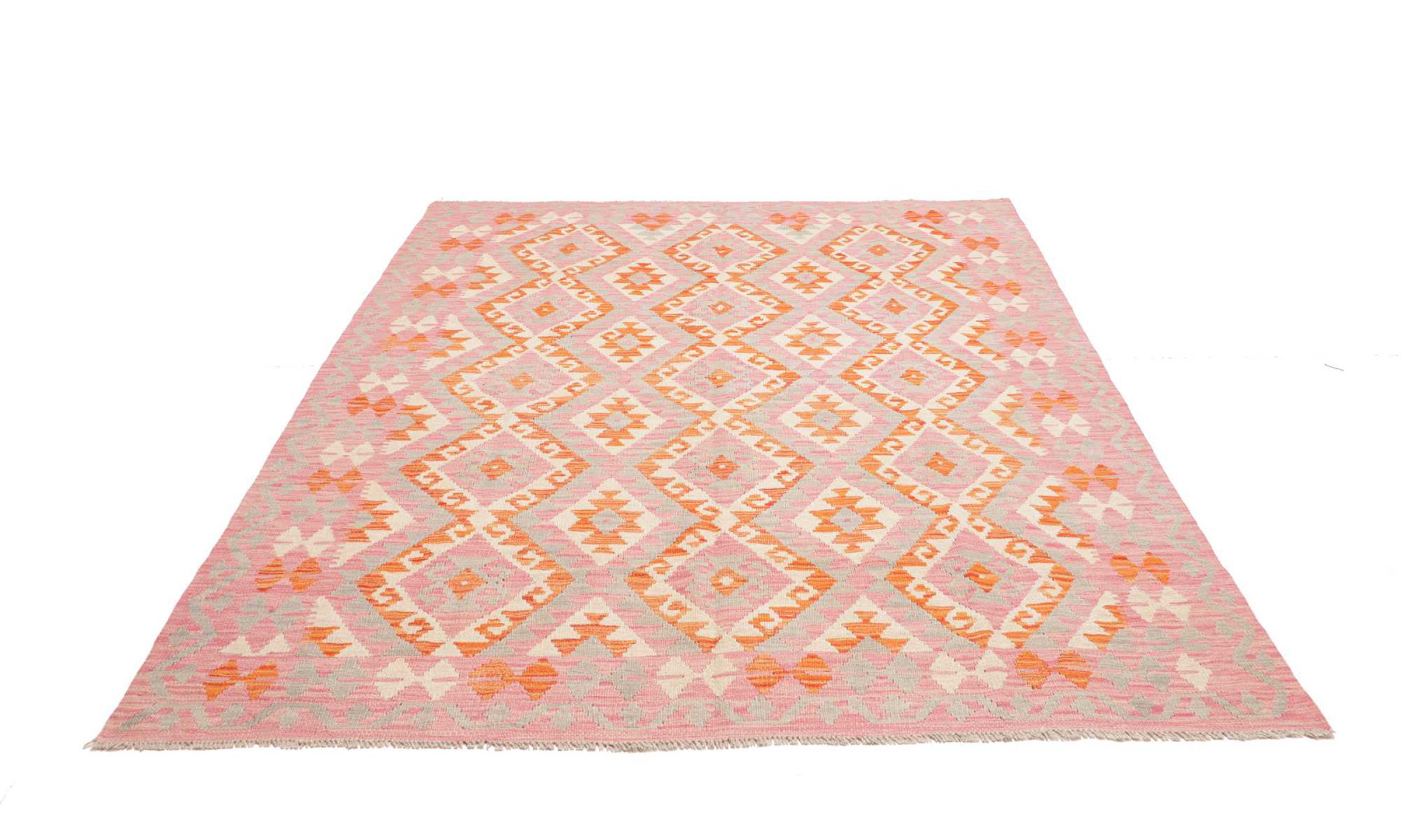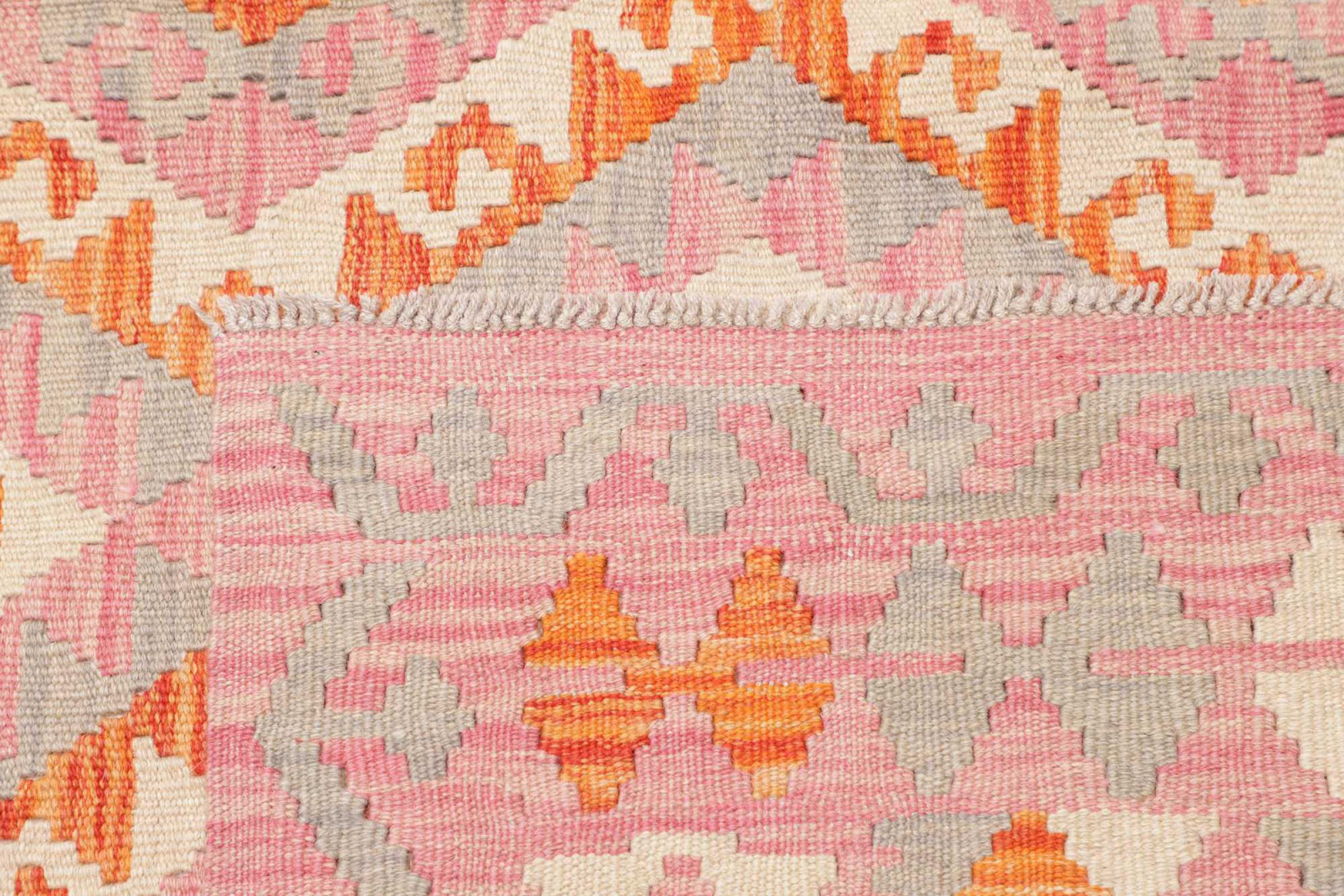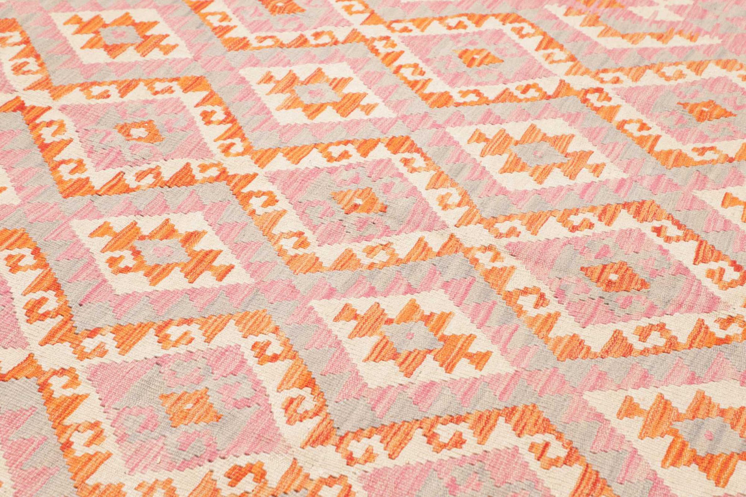 This rug was made as a flat weave by hand on a loom. Flatweave is the term used to describe rugs that have no pile. As the name promises, these rugs are woven and not knotted. This results in a flat rug with a structured surface. Flatweaves are not as soft and usually thinner than knotted rugs. At the same time they are much less complex to manufacture and can usually be laid out from both sides (front and back). Their patterns are usually geometric, which is determined by the fabric.