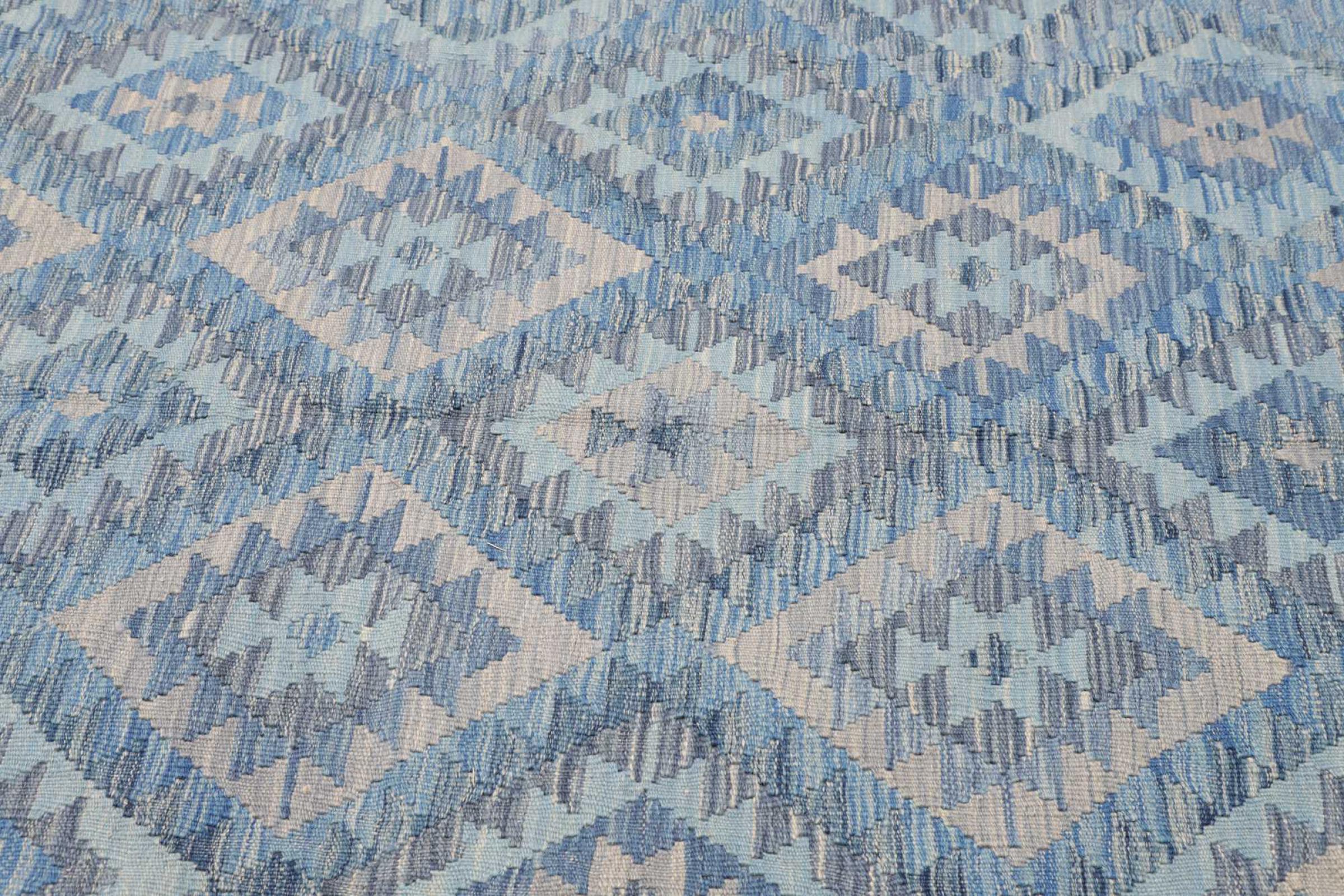 This rug was made as a flat weave by hand on a loom. Flatweave is the term used to describe rugs that have no pile. As the name promises, these rugs are woven and not knotted. This results in a flat rug with a structured surface. Flatweaves are not as soft and usually thinner than knotted rugs. At the same time they are much less complex to manufacture and can usually be laid out from both sides (front and back). Their patterns are usually geometric, which is determined by the fabric.