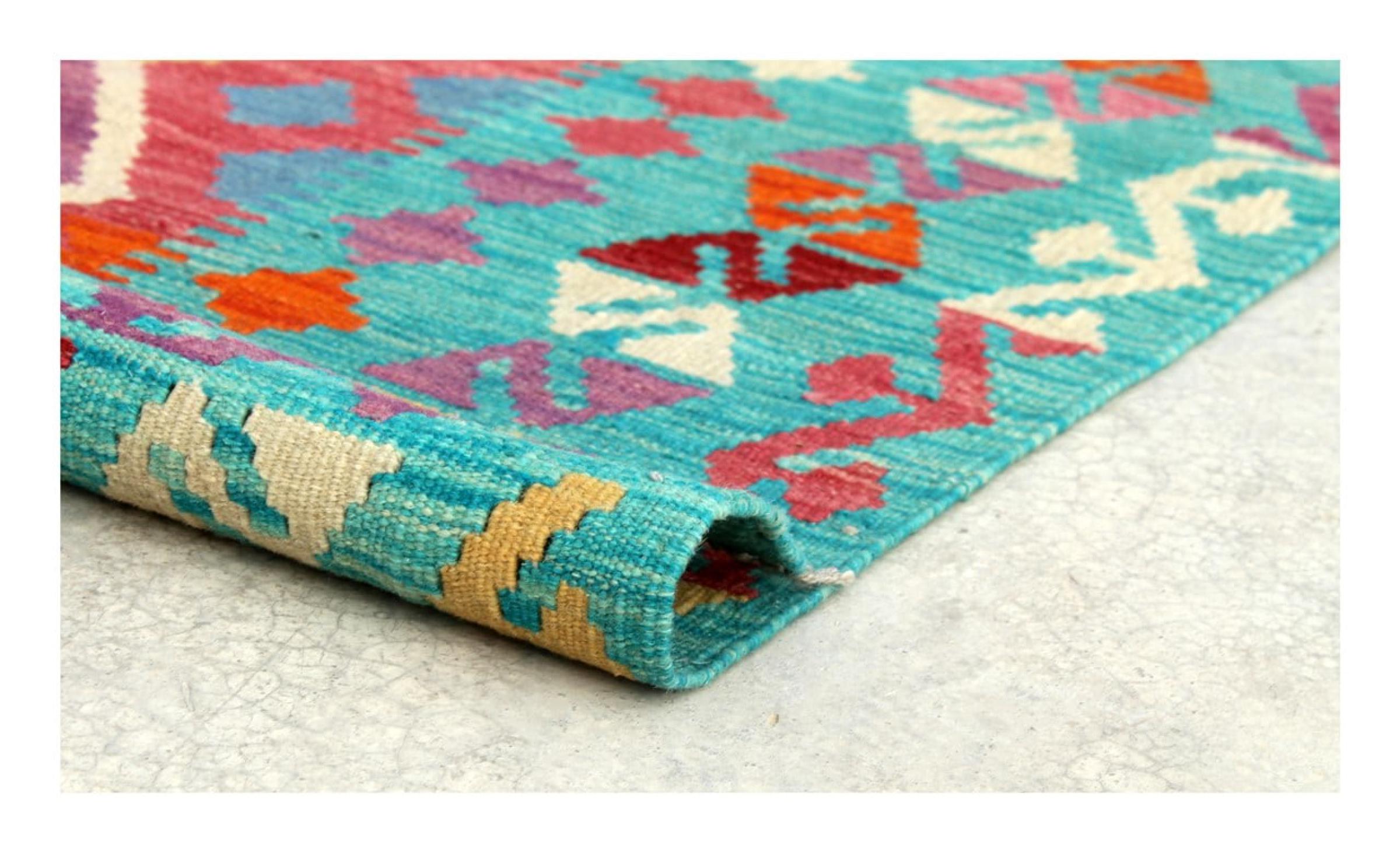 This rug was made as a flat weave by hand on a loom. Flatweave is the term used to describe rugs that have no pile. As the name promises, these rugs are woven and not knotted. This results in a flat rug with a structured surface. Flatweaves are not as soft and usually thinner than knotted rugs. At the same time they are much less complex to manufacture and can usually be laid out from both sides (front and back). Their patterns are usually geometric, which is determined by the fabric.