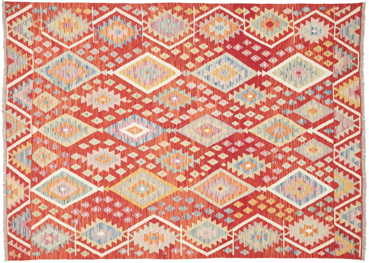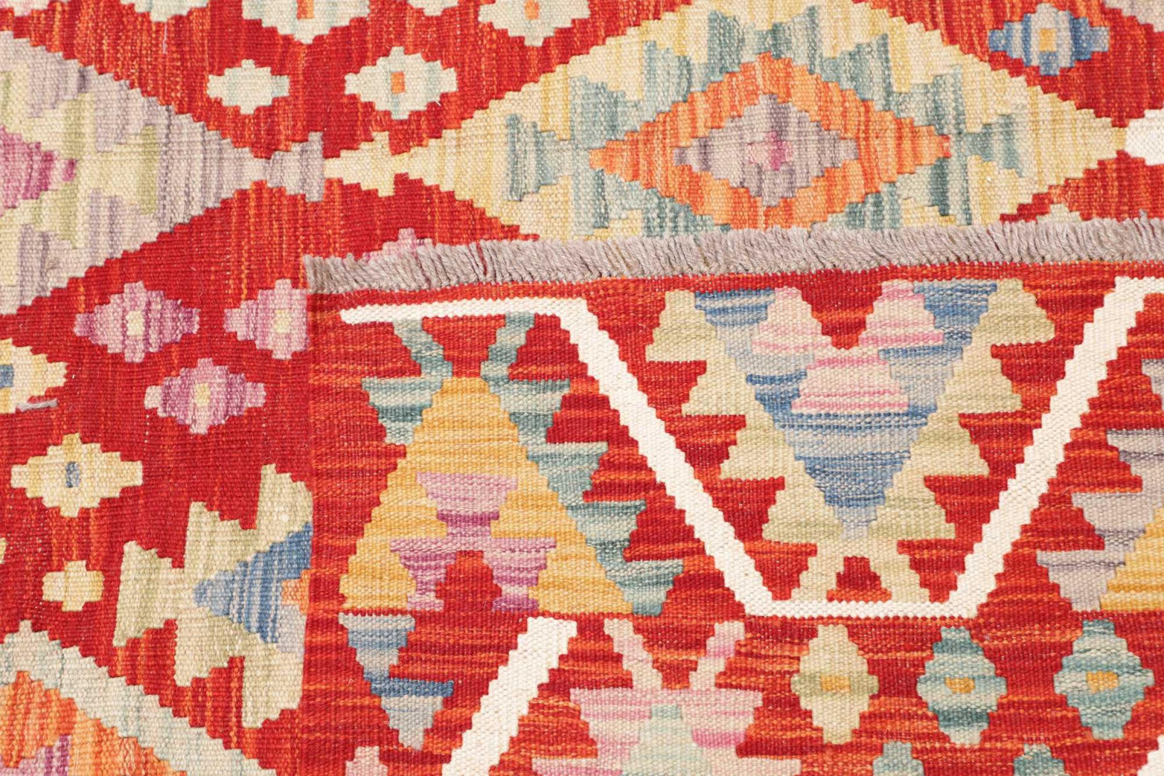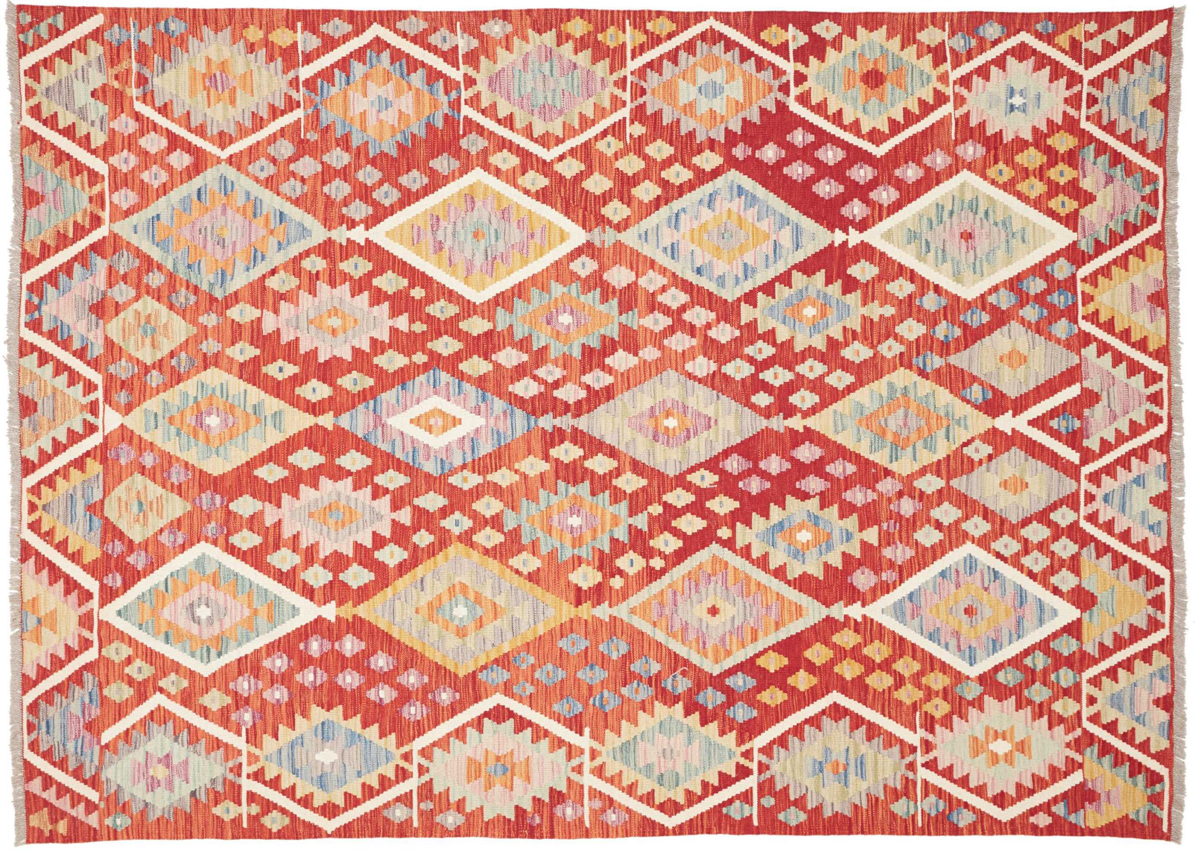 This rug was made as a flat weave by hand on a loom. Flatweave is the term used to describe rugs that have no pile. As the name promises, these rugs are woven and not knotted. This results in a flat rug with a structured surface. Flatweaves are not as soft and usually thinner than knotted rugs. At the same time they are much less complex to manufacture and can usually be laid out from both sides (front and back). Their patterns are usually geometric, which is determined by the fabric.