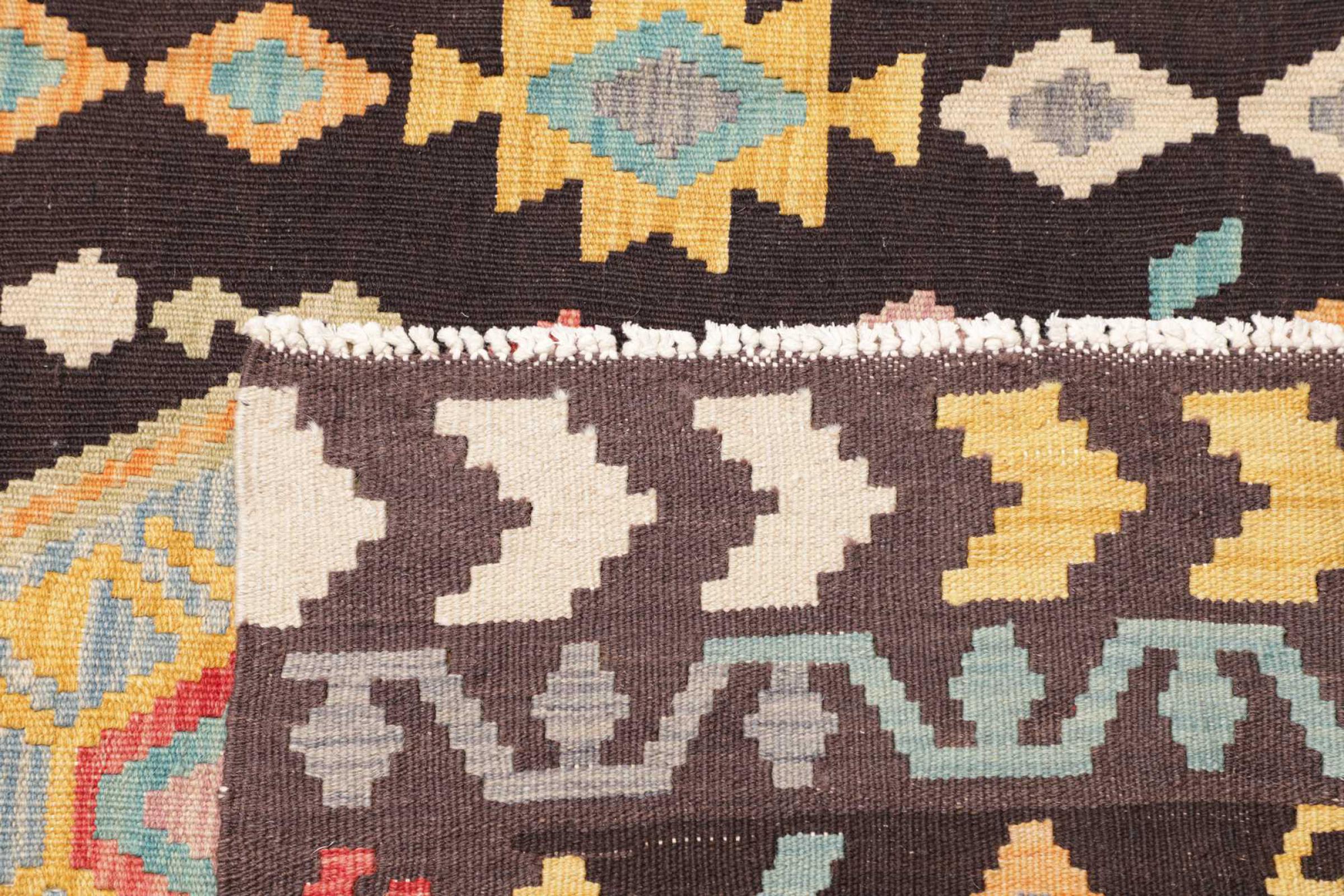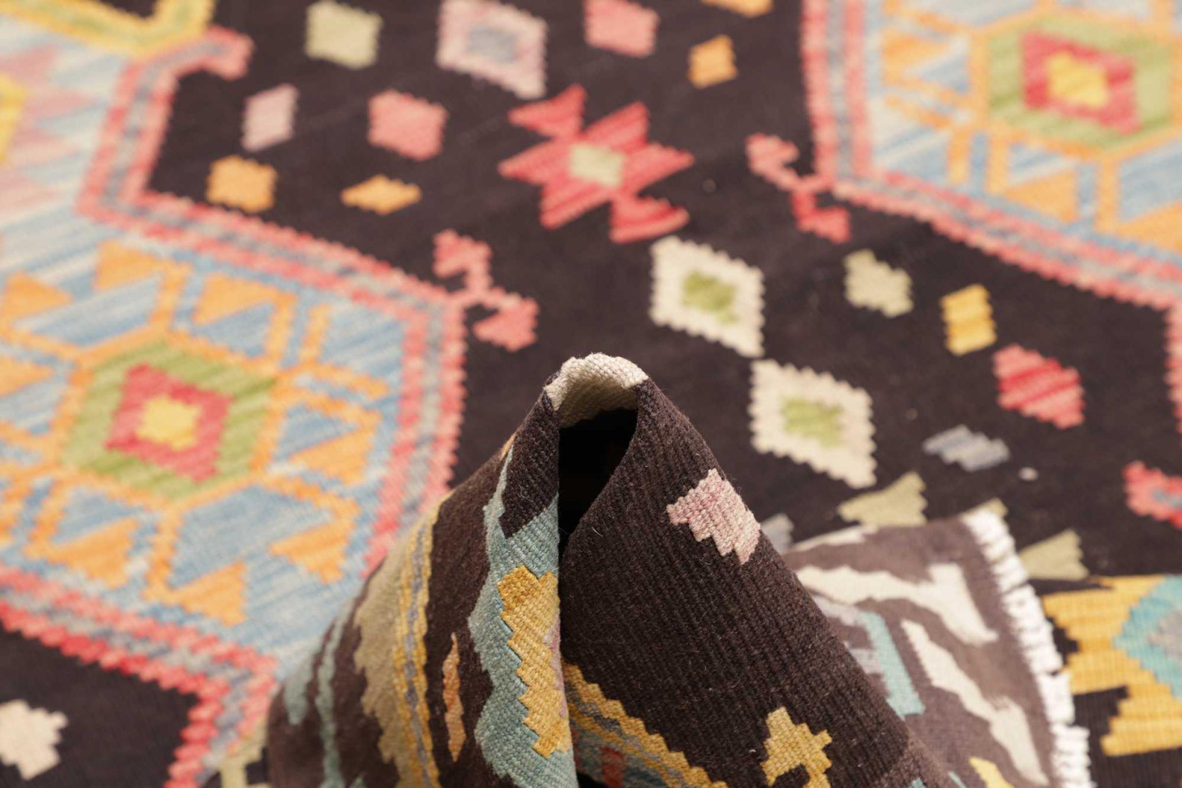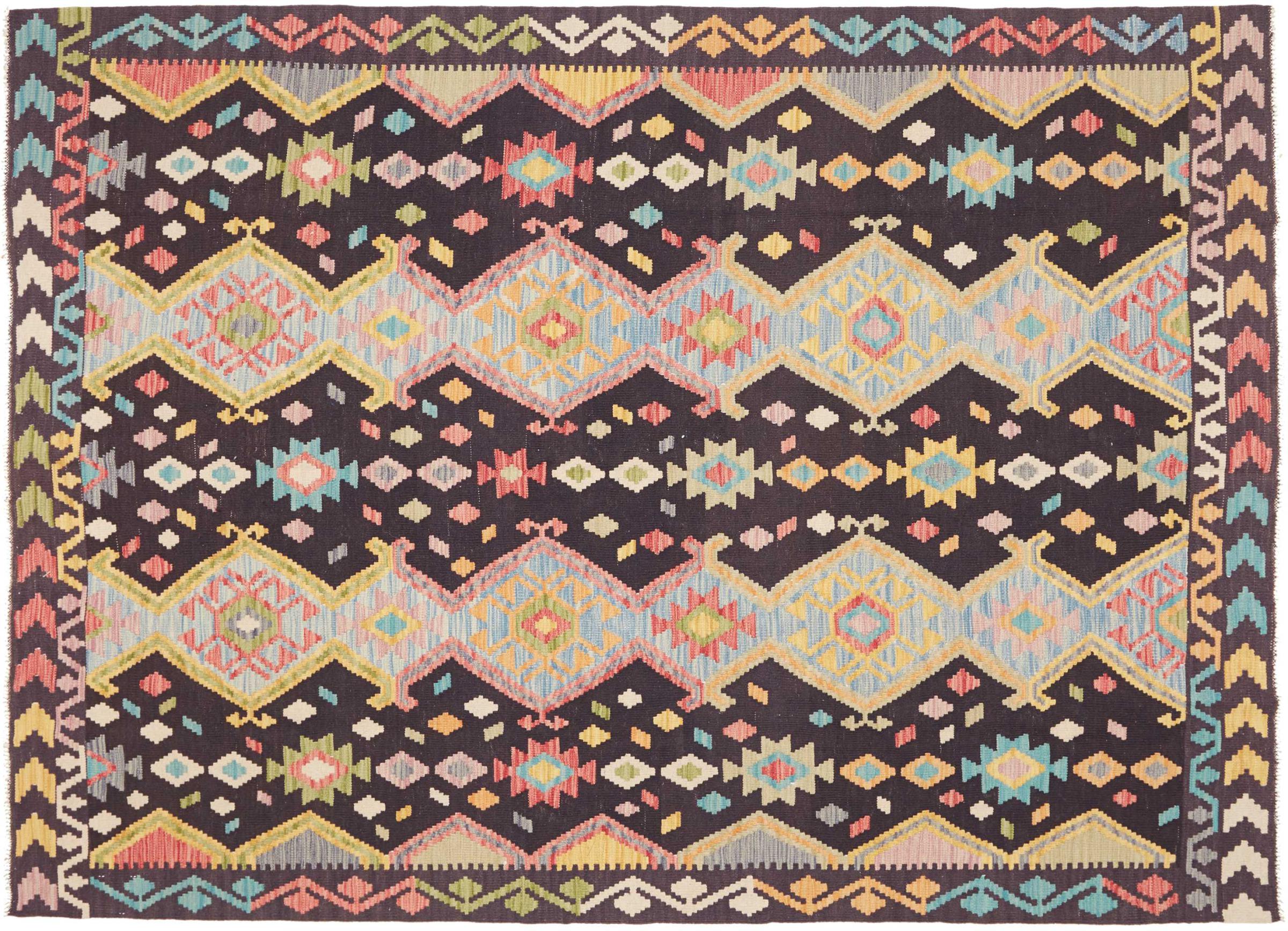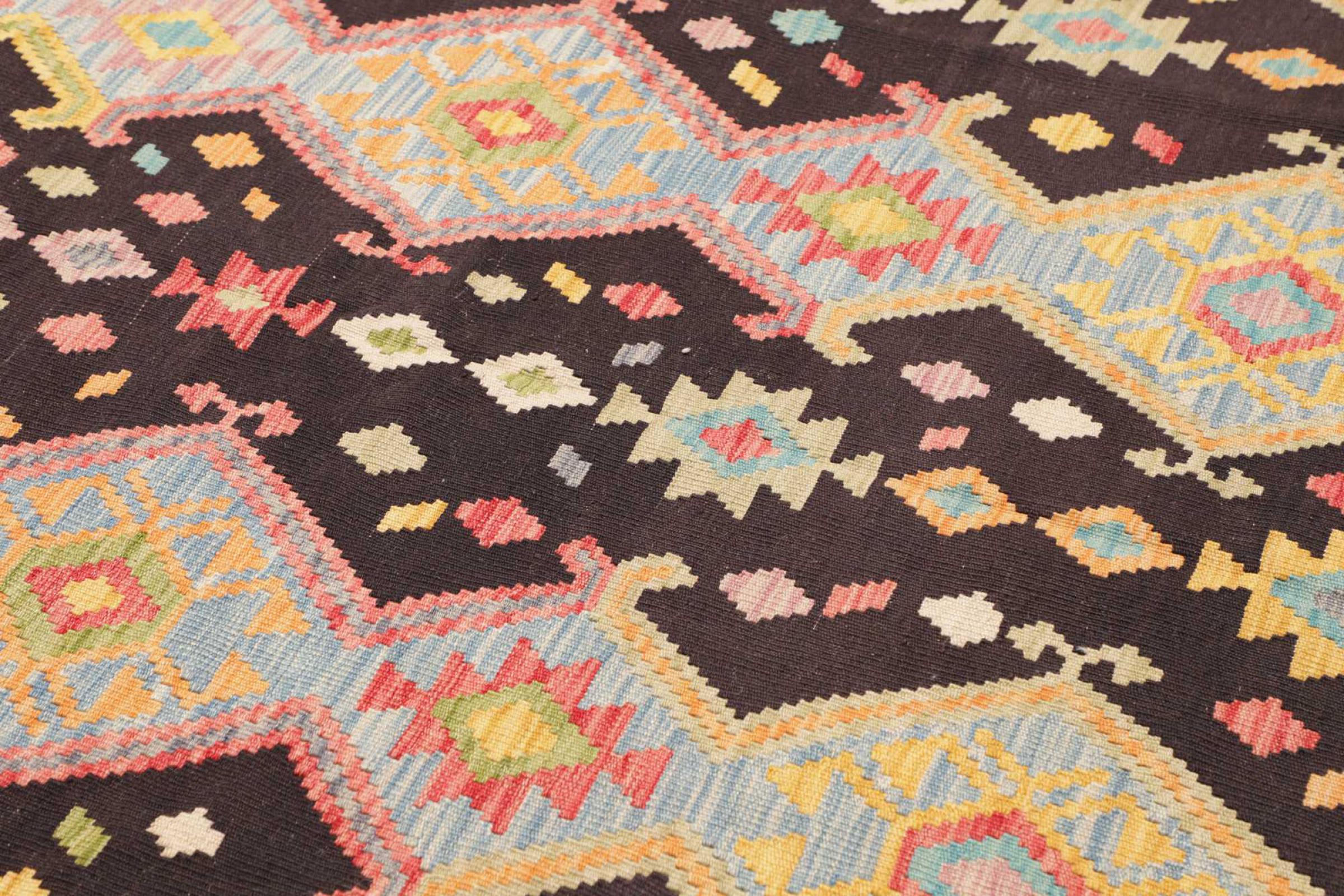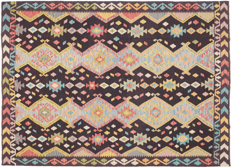 This rug was made as a flat weave by hand on a loom. Flatweave is the term used to describe rugs that have no pile. As the name promises, these rugs are woven and not knotted. This results in a flat rug with a structured surface. Flatweaves are not as soft and usually thinner than knotted rugs. At the same time they are much less complex to manufacture and can usually be laid out from both sides (front and back). Their patterns are usually geometric, which is determined by the fabric.