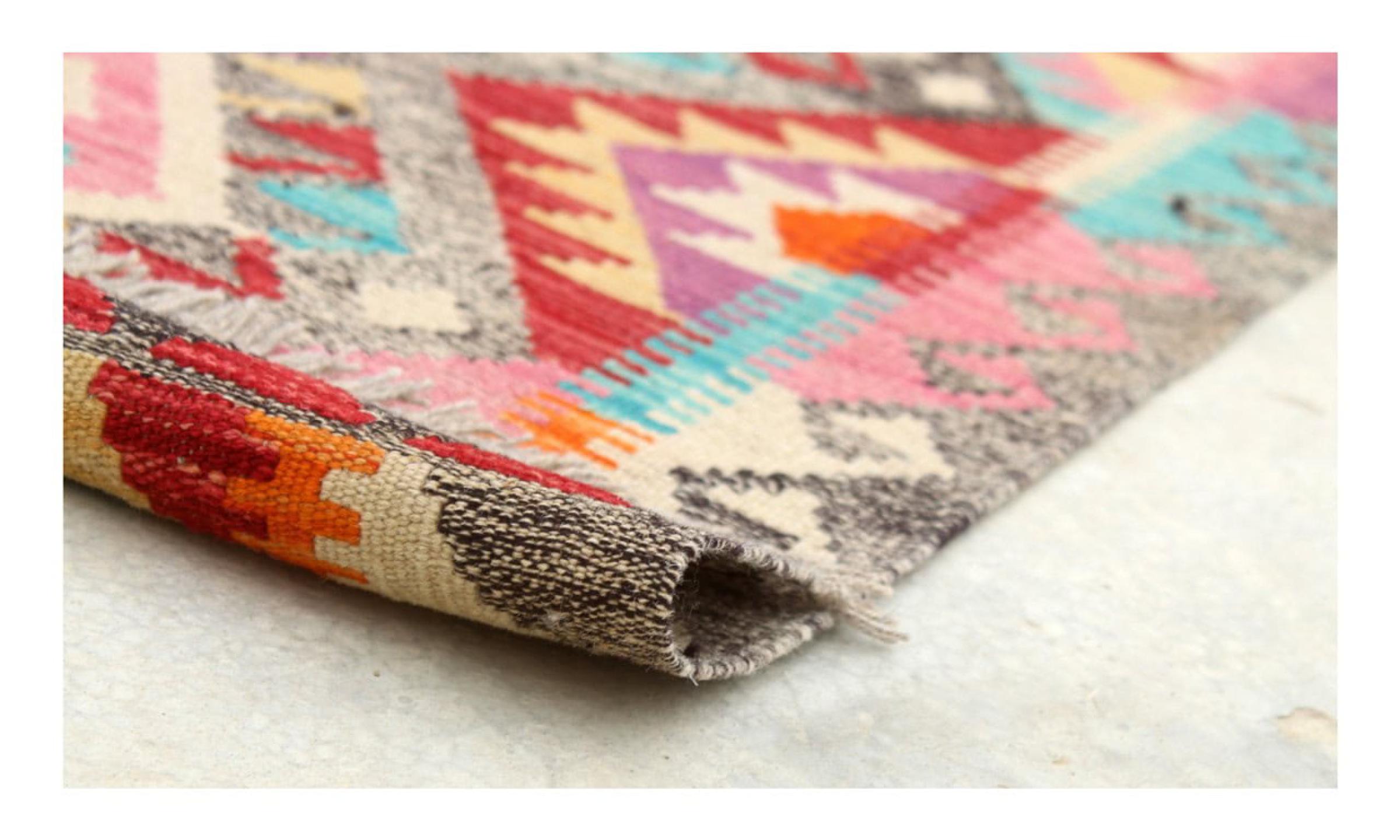 This rug was made as a flat weave by hand on a loom. Flatweave is the term used to describe rugs that have no pile. As the name promises, these rugs are woven and not knotted. This results in a flat rug with a structured surface. Flatweaves are not as soft and usually thinner than knotted rugs. At the same time they are much less complex to manufacture and can usually be laid out from both sides (front and back). Their patterns are usually geometric, which is determined by the fabric.