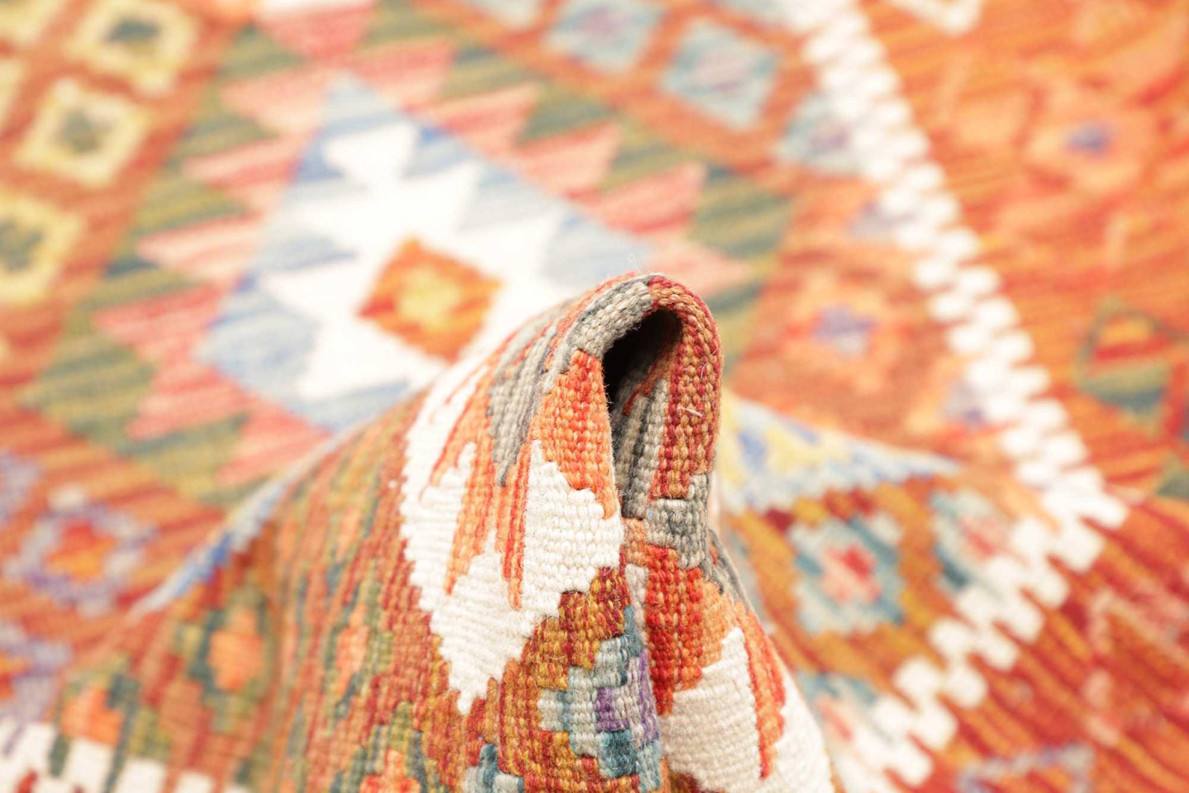 This rug was made as a flat weave by hand on a loom. Flatweave is the term used to describe rugs that have no pile. As the name promises, these rugs are woven and not knotted. This results in a flat rug with a structured surface. Flatweaves are not as soft and usually thinner than knotted rugs. At the same time they are much less complex to manufacture and can usually be laid out from both sides (front and back). Their patterns are usually geometric, which is determined by the fabric.