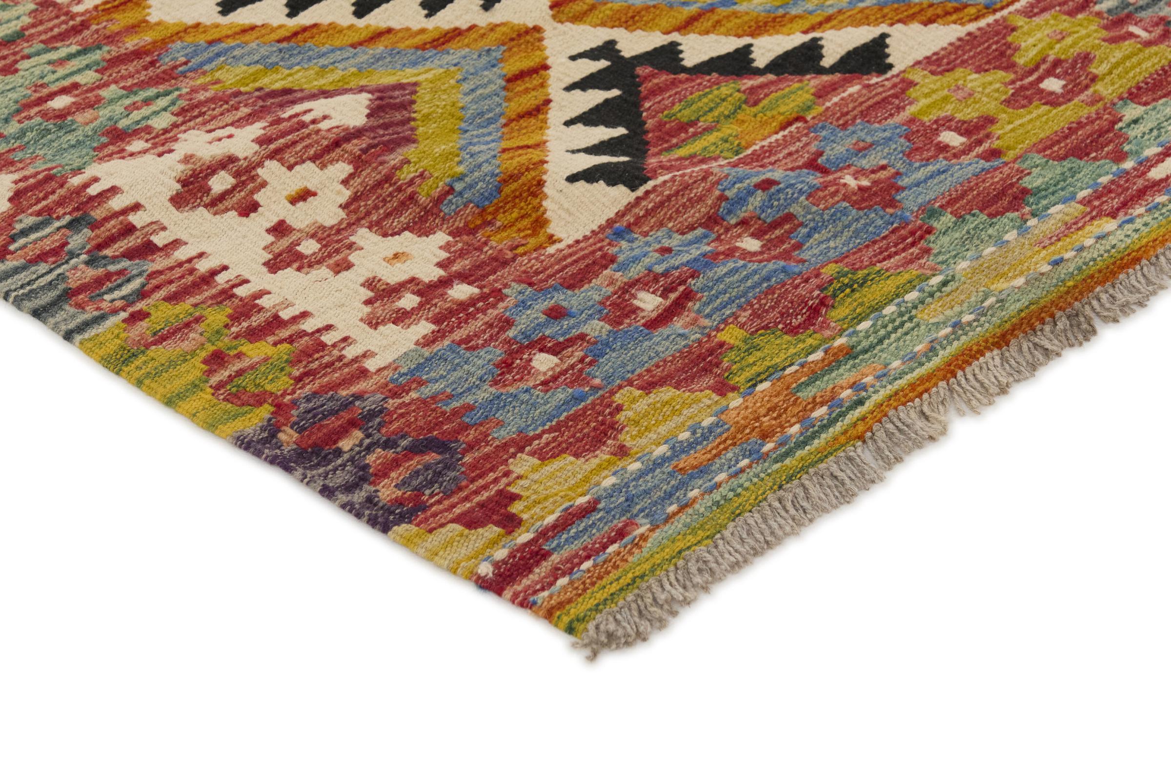 This rug was made as a flat weave by hand on a loom. Flatweave is the term used to describe rugs that have no pile. As the name promises, these rugs are woven and not knotted. This results in a flat rug with a structured surface. Flatweaves are not as soft and usually thinner than knotted rugs. At the same time they are much less complex to manufacture and can usually be laid out from both sides (front and back). Their patterns are usually geometric, which is determined by the fabric.