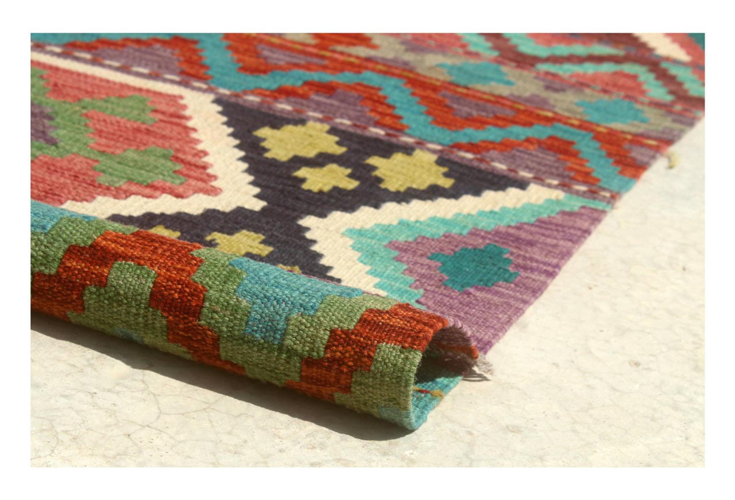 This rug was made as a flat weave by hand on a loom. Flatweave is the term used to describe rugs that have no pile. As the name promises, these rugs are woven and not knotted. This results in a flat rug with a structured surface. Flatweaves are not as soft and usually thinner than knotted rugs. At the same time they are much less complex to manufacture and can usually be laid out from both sides (front and back). Their patterns are usually geometric, which is determined by the fabric.