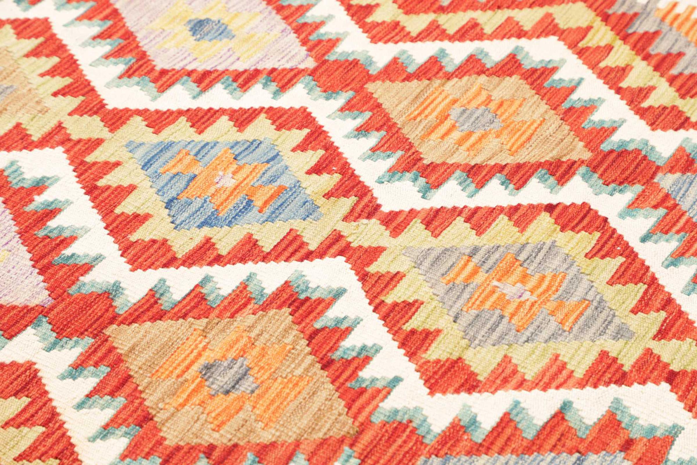 This rug was made as a flat weave by hand on a loom. Flatweave is the term used to describe rugs that have no pile. As the name promises, these rugs are woven and not knotted. This results in a flat rug with a structured surface. Flatweaves are not as soft and usually thinner than knotted rugs. At the same time they are much less complex to manufacture and can usually be laid out from both sides (front and back). Their patterns are usually geometric, which is determined by the fabric.