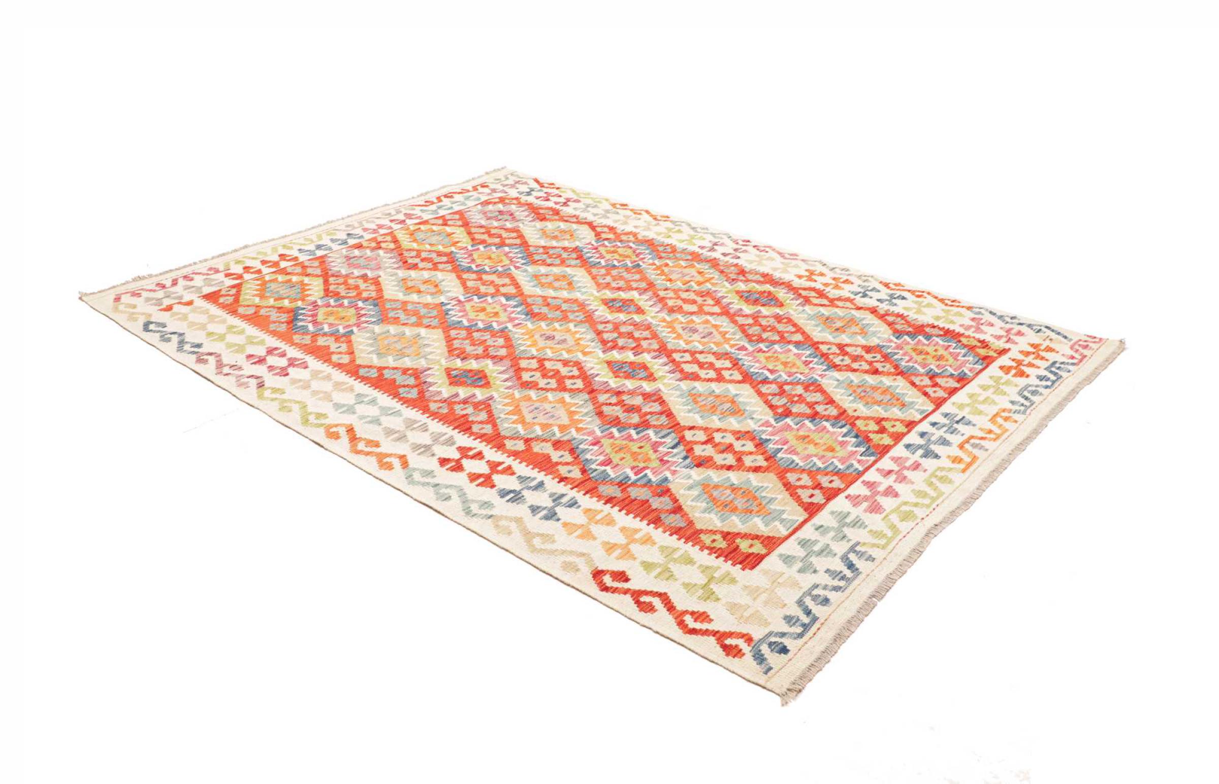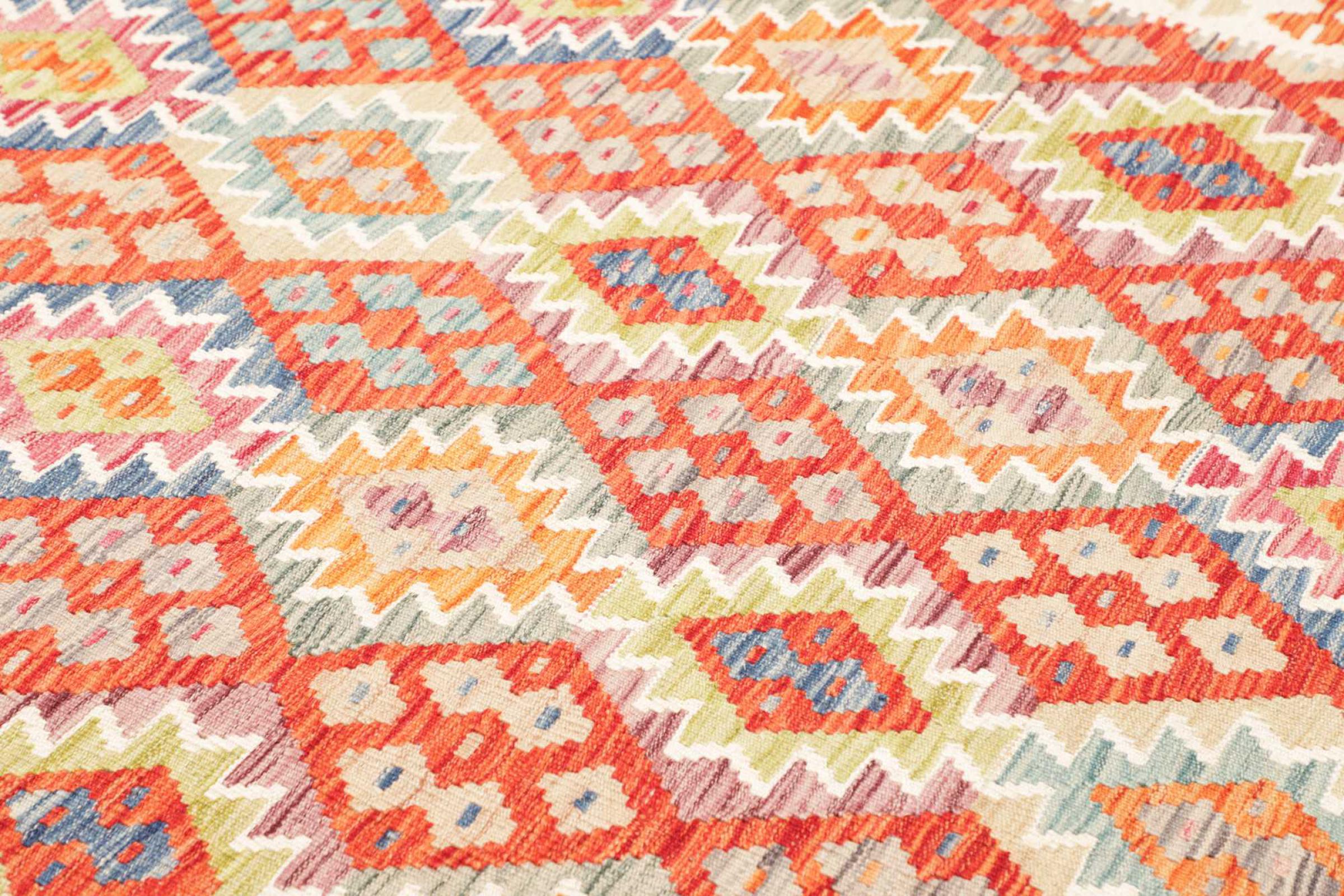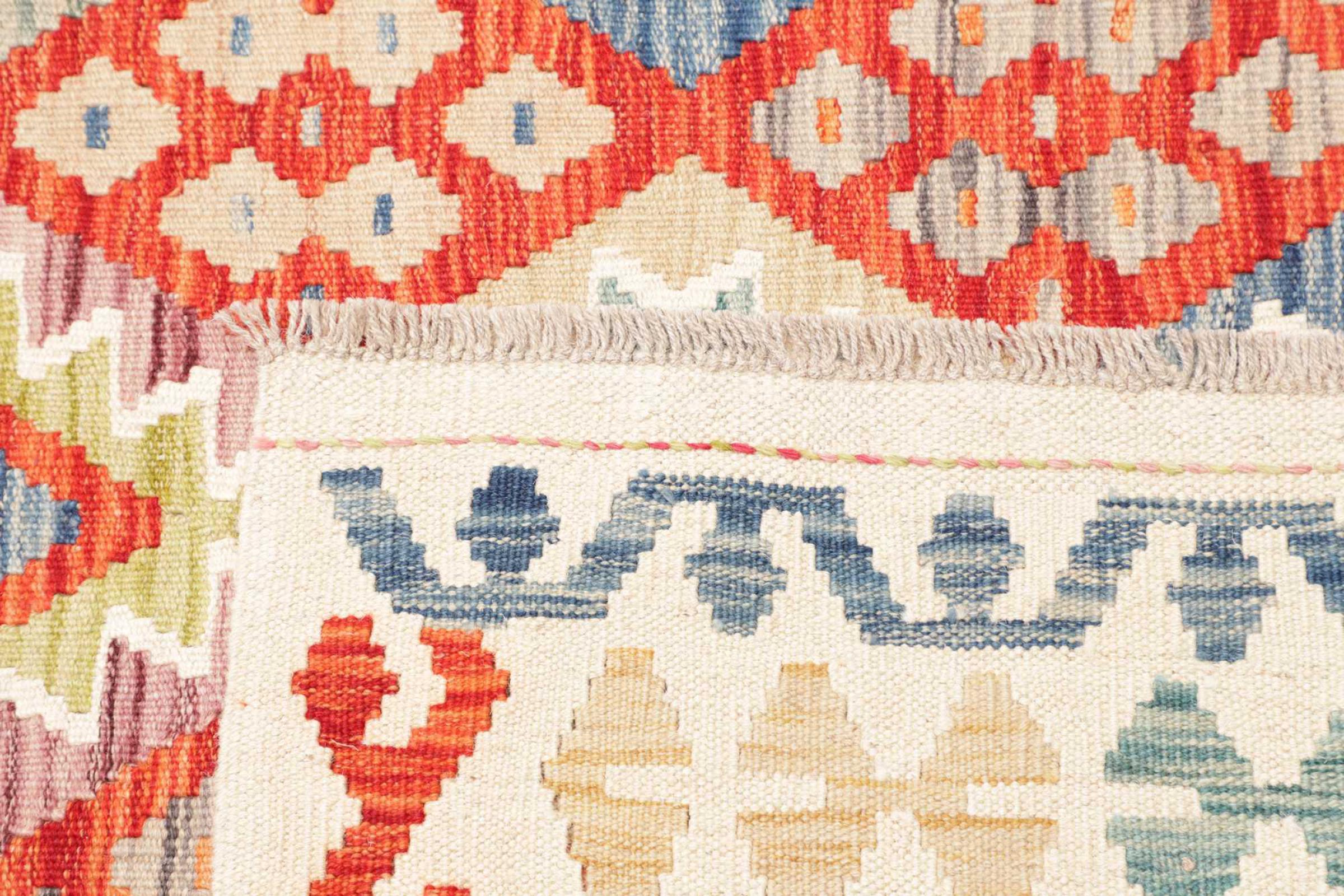 This rug was made as a flat weave by hand on a loom. Flatweave is the term used to describe rugs that have no pile. As the name promises, these rugs are woven and not knotted. This results in a flat rug with a structured surface. Flatweaves are not as soft and usually thinner than knotted rugs. At the same time they are much less complex to manufacture and can usually be laid out from both sides (front and back). Their patterns are usually geometric, which is determined by the fabric.