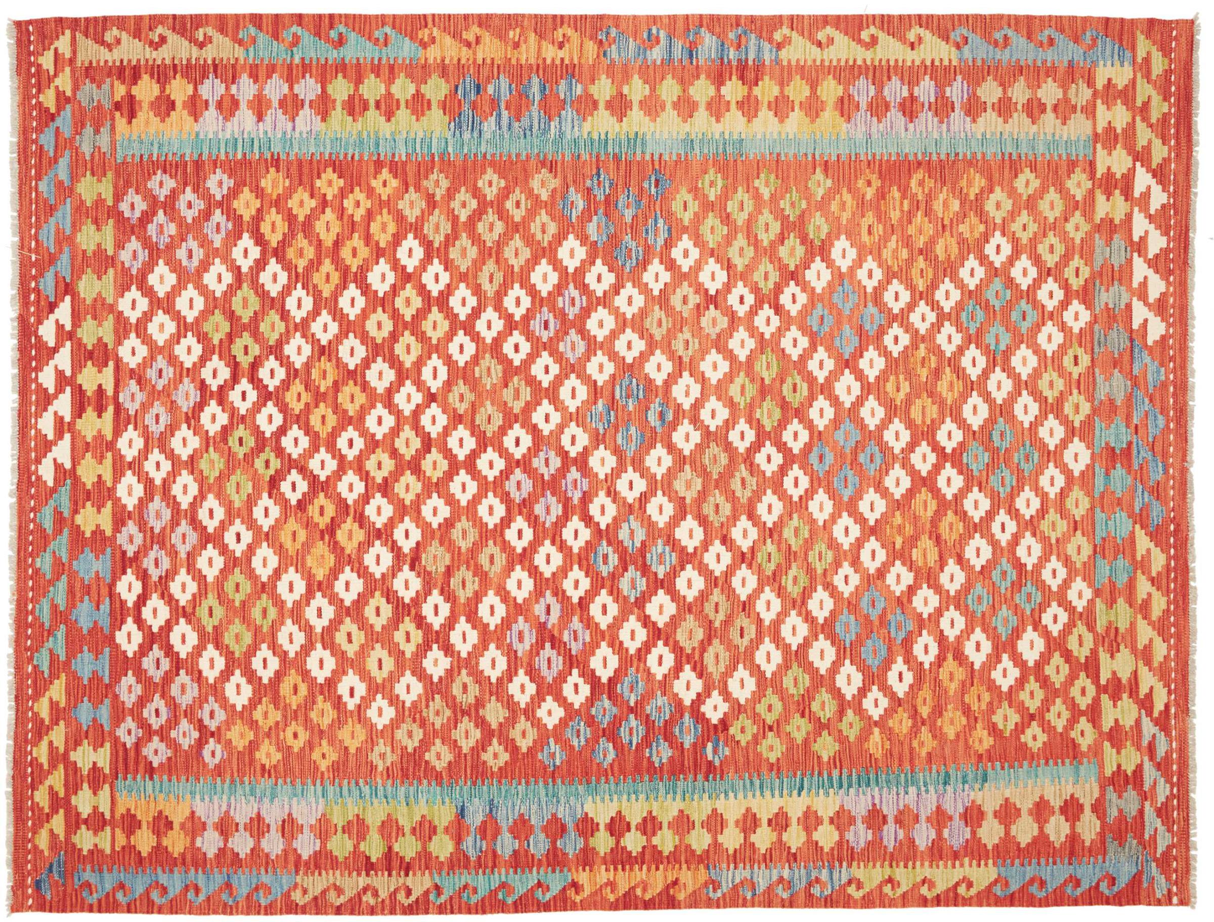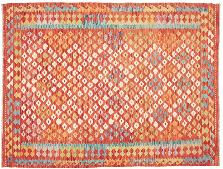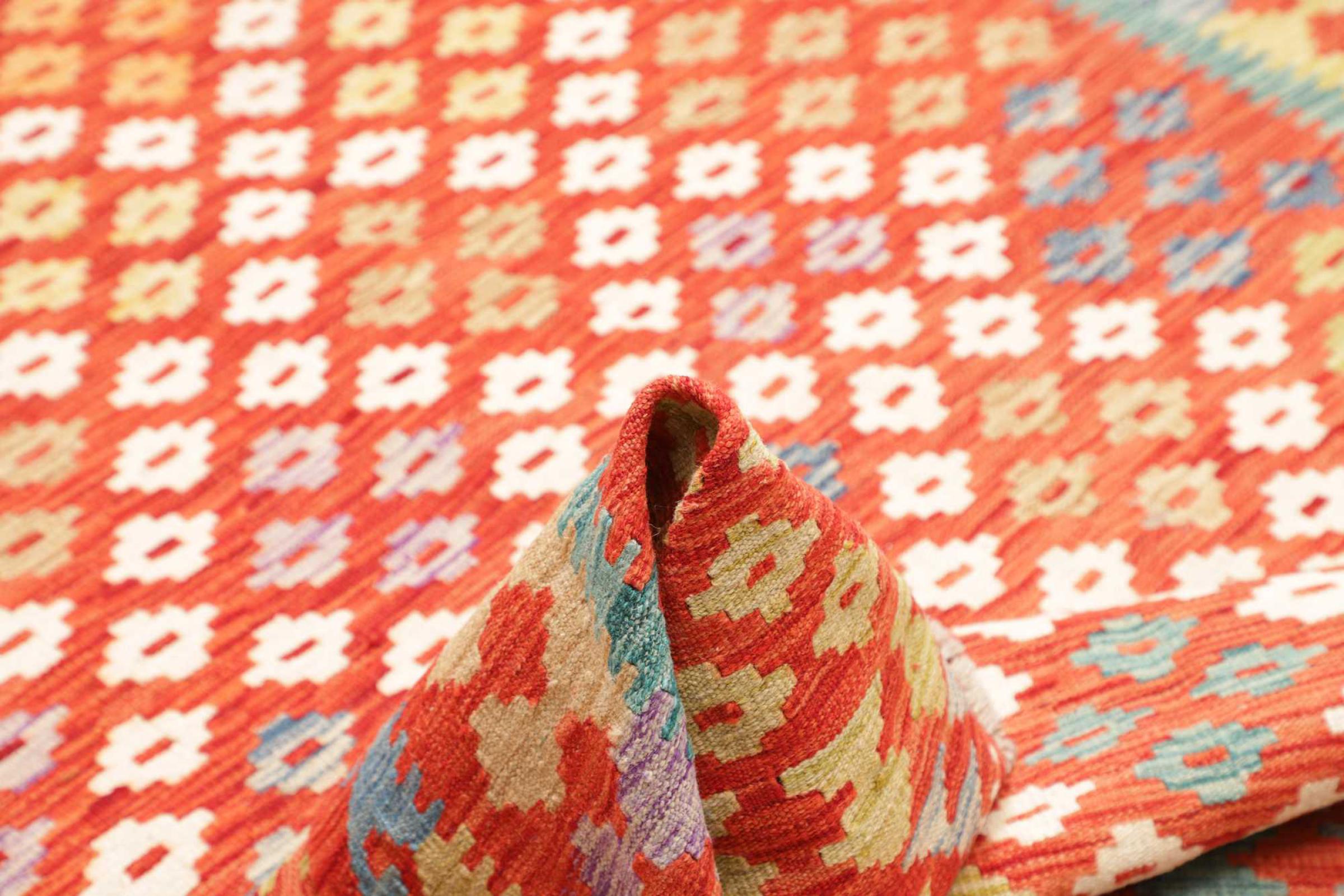 This rug was made as a flat weave by hand on a loom. Flatweave is the term used to describe rugs that have no pile. As the name promises, these rugs are woven and not knotted. This results in a flat rug with a structured surface. Flatweaves are not as soft and usually thinner than knotted rugs. At the same time they are much less complex to manufacture and can usually be laid out from both sides (front and back). Their patterns are usually geometric, which is determined by the fabric.