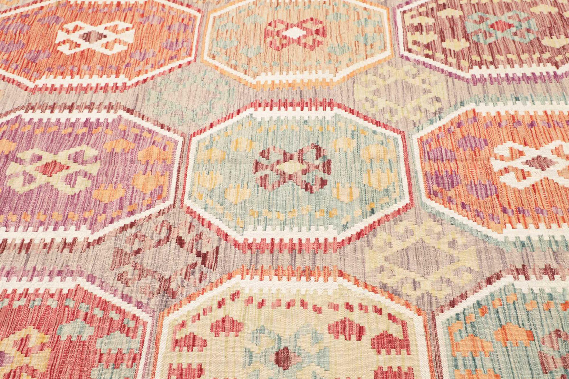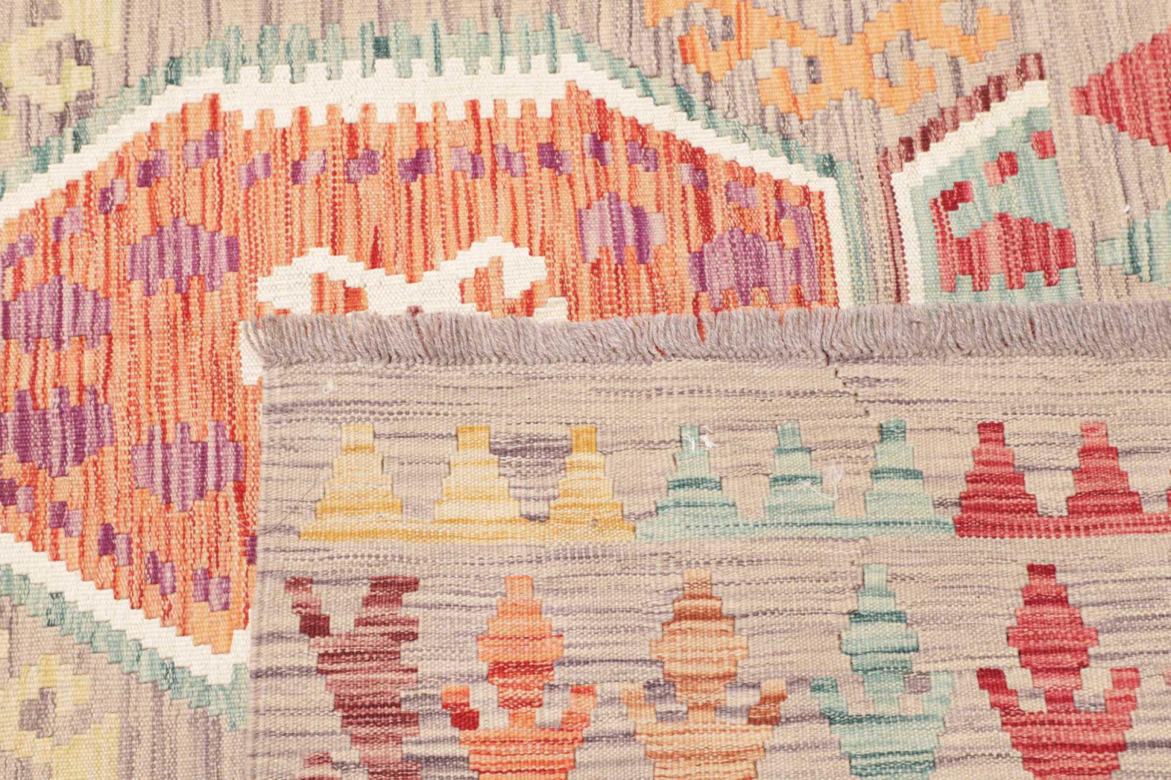 This rug was made as a flat weave by hand on a loom. Flatweave is the term used to describe rugs that have no pile. As the name promises, these rugs are woven and not knotted. This results in a flat rug with a structured surface. Flatweaves are not as soft and usually thinner than knotted rugs. At the same time they are much less complex to manufacture and can usually be laid out from both sides (front and back). Their patterns are usually geometric, which is determined by the fabric.