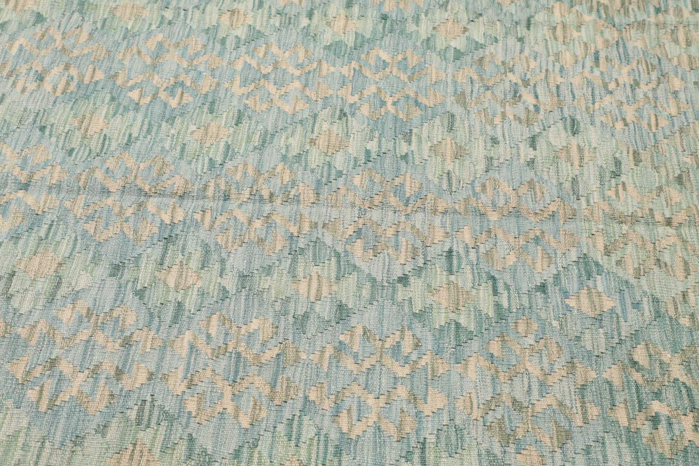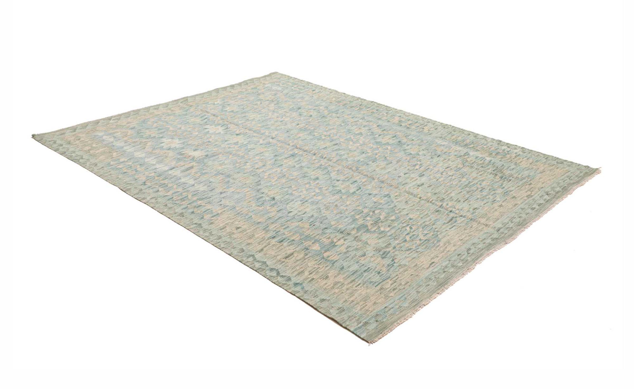 This rug was made as a flat weave by hand on a loom. Flatweave is the term used to describe rugs that have no pile. As the name promises, these rugs are woven and not knotted. This results in a flat rug with a structured surface. Flatweaves are not as soft and usually thinner than knotted rugs. At the same time they are much less complex to manufacture and can usually be laid out from both sides (front and back). Their patterns are usually geometric, which is determined by the fabric.