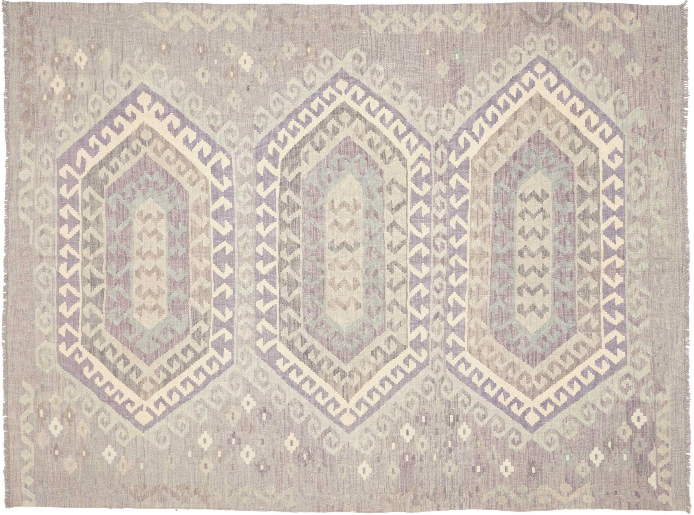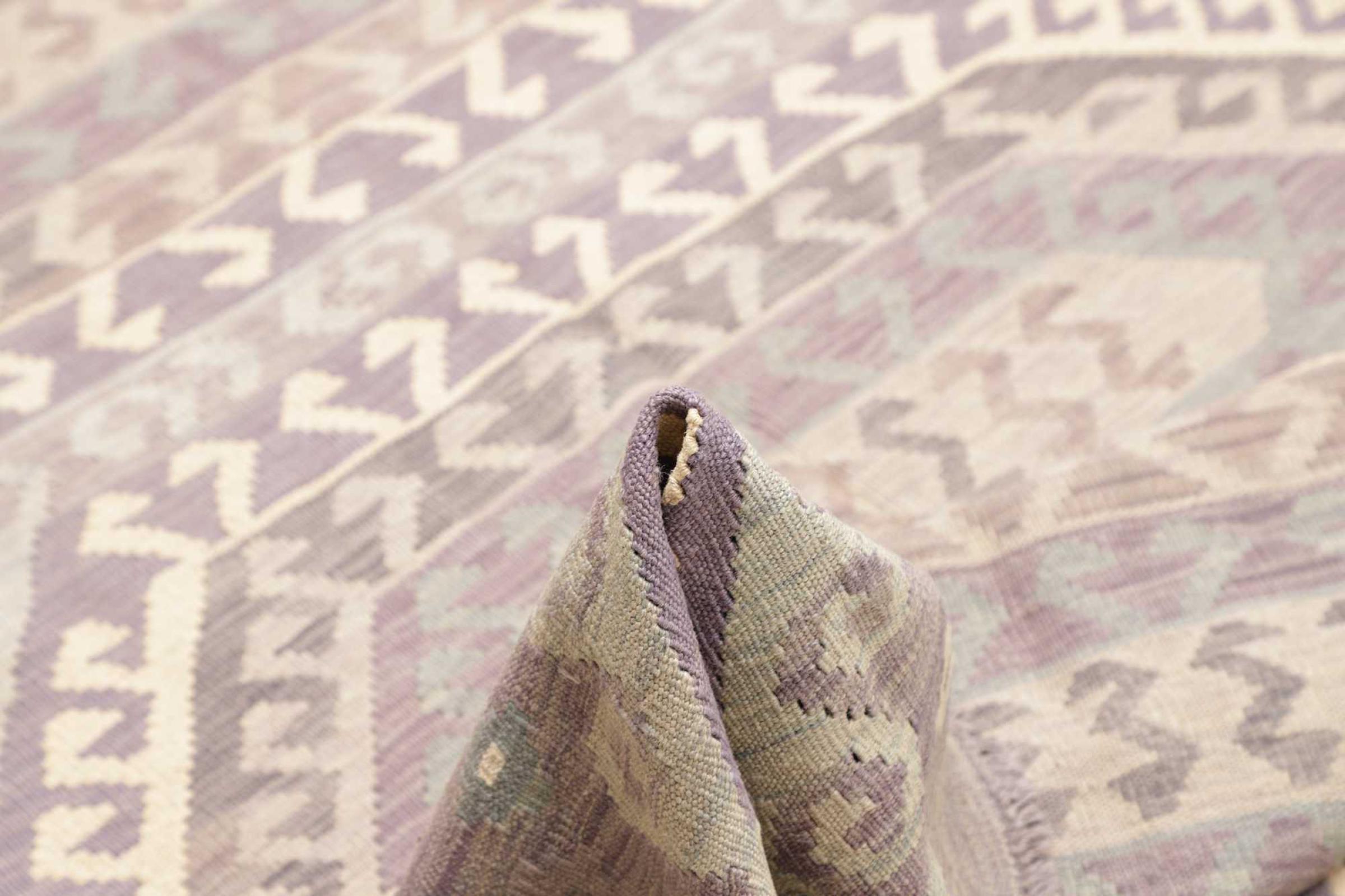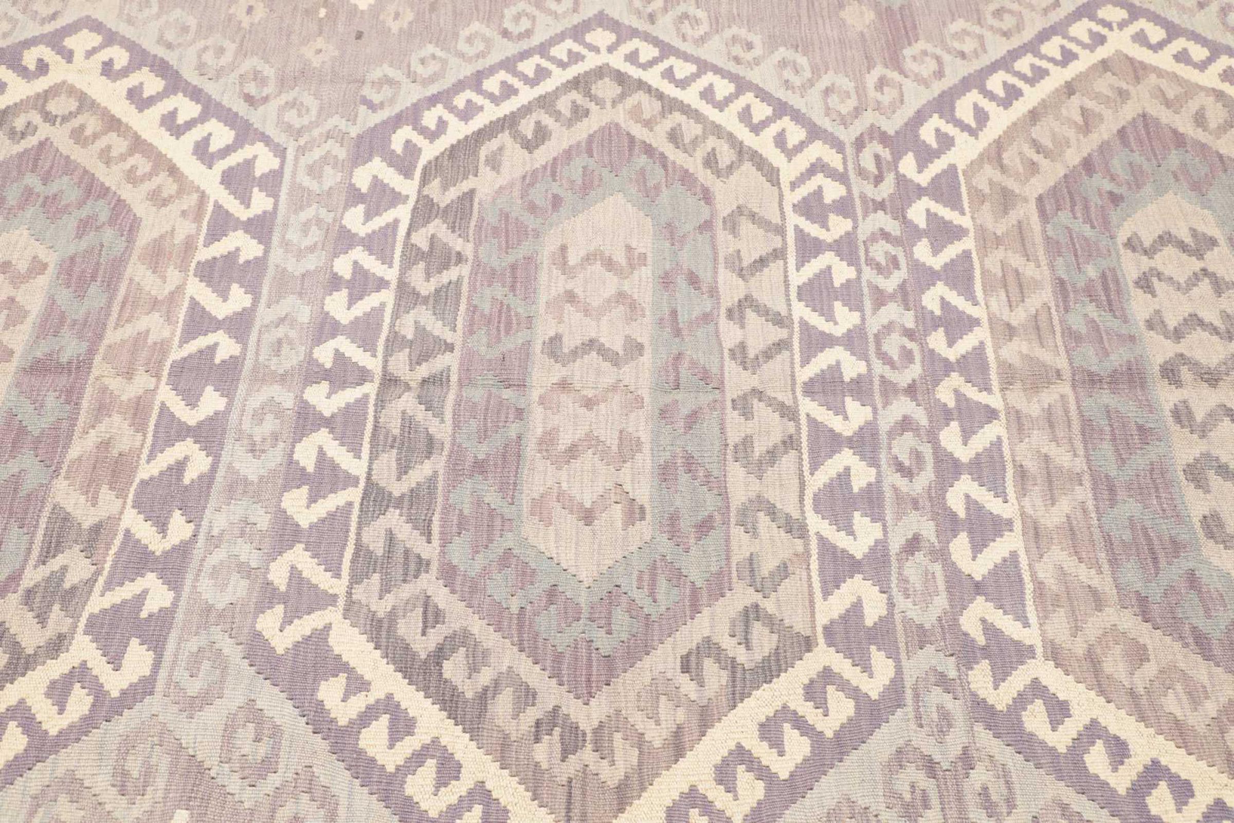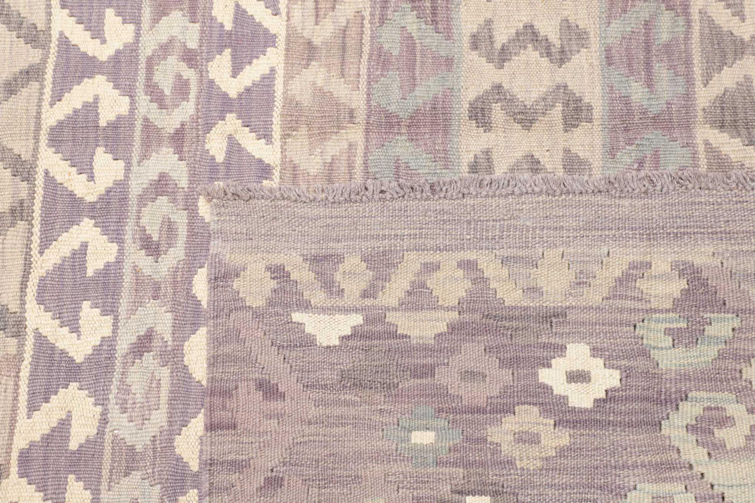 This rug was made as a flat weave by hand on a loom. Flatweave is the term used to describe rugs that have no pile. As the name promises, these rugs are woven and not knotted. This results in a flat rug with a structured surface. Flatweaves are not as soft and usually thinner than knotted rugs. At the same time they are much less complex to manufacture and can usually be laid out from both sides (front and back). Their patterns are usually geometric, which is determined by the fabric.