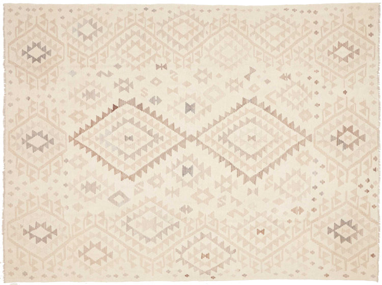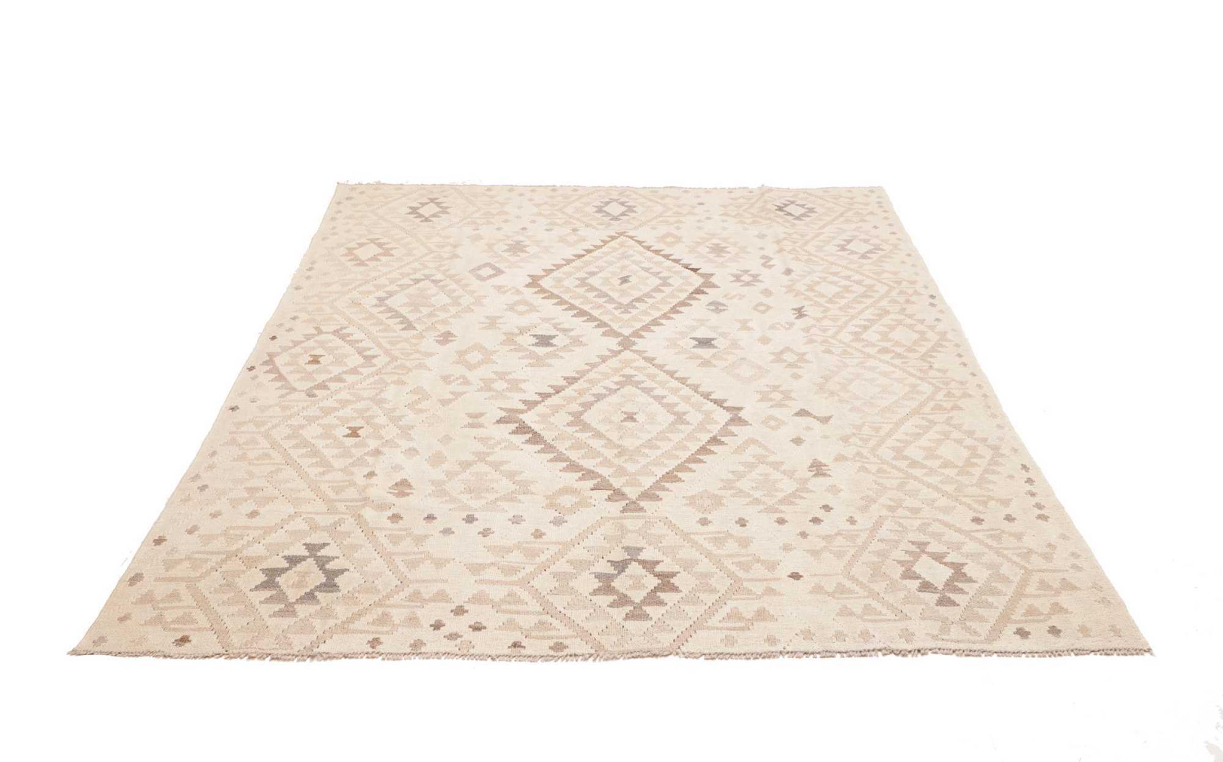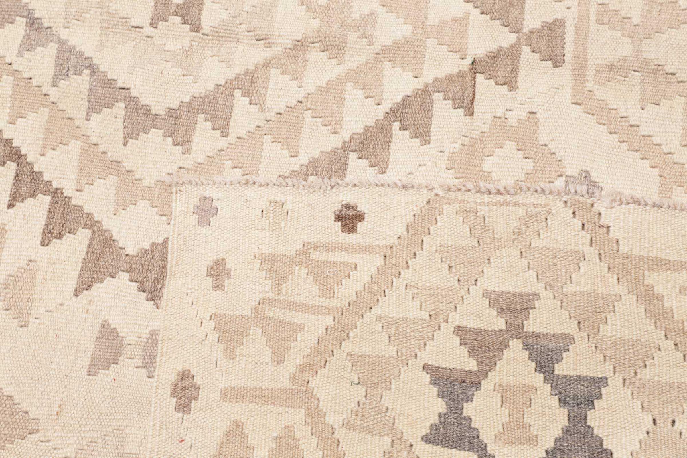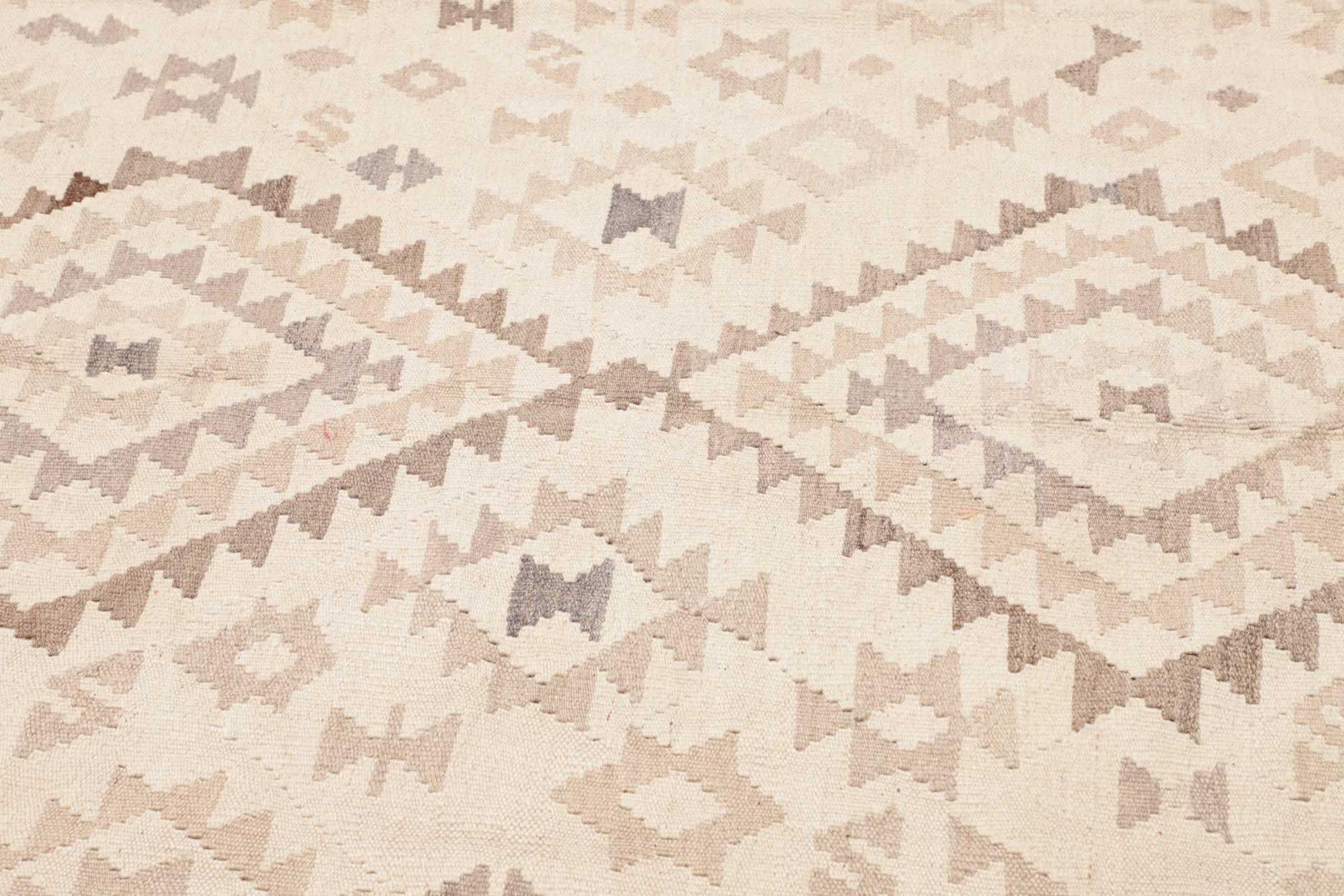 This rug was made as a flat weave by hand on a loom. Flatweave is the term used to describe rugs that have no pile. As the name promises, these rugs are woven and not knotted. This results in a flat rug with a structured surface. Flatweaves are not as soft and usually thinner than knotted rugs. At the same time they are much less complex to manufacture and can usually be laid out from both sides (front and back). Their patterns are usually geometric, which is determined by the fabric.