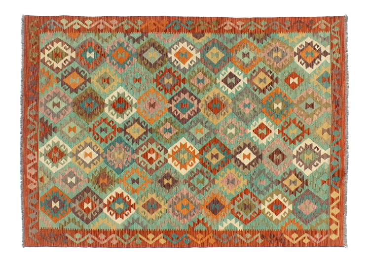 This rug was made as a flat weave by hand on a loom. Flatweave is the term used to describe rugs that have no pile. As the name promises, these rugs are woven and not knotted. This results in a flat rug with a structured surface. Flatweaves are not as soft and usually thinner than knotted rugs. At the same time they are much less complex to manufacture and can usually be laid out from both sides (front and back). Their patterns are usually geometric, which is determined by the fabric.