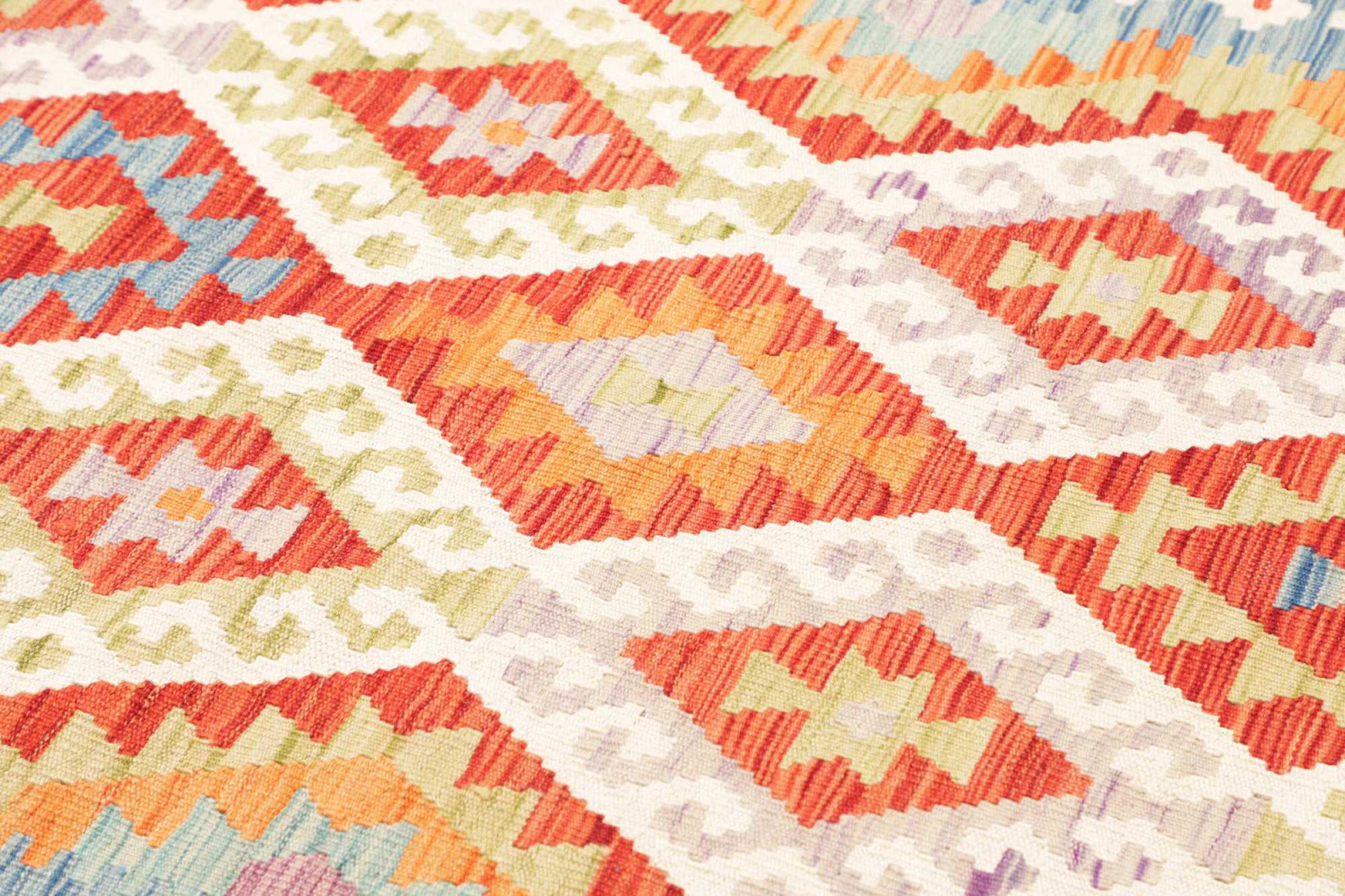 This rug was made as a flat weave by hand on a loom. Flatweave is the term used to describe rugs that have no pile. As the name promises, these rugs are woven and not knotted. This results in a flat rug with a structured surface. Flatweaves are not as soft and usually thinner than knotted rugs. At the same time they are much less complex to manufacture and can usually be laid out from both sides (front and back). Their patterns are usually geometric, which is determined by the fabric.