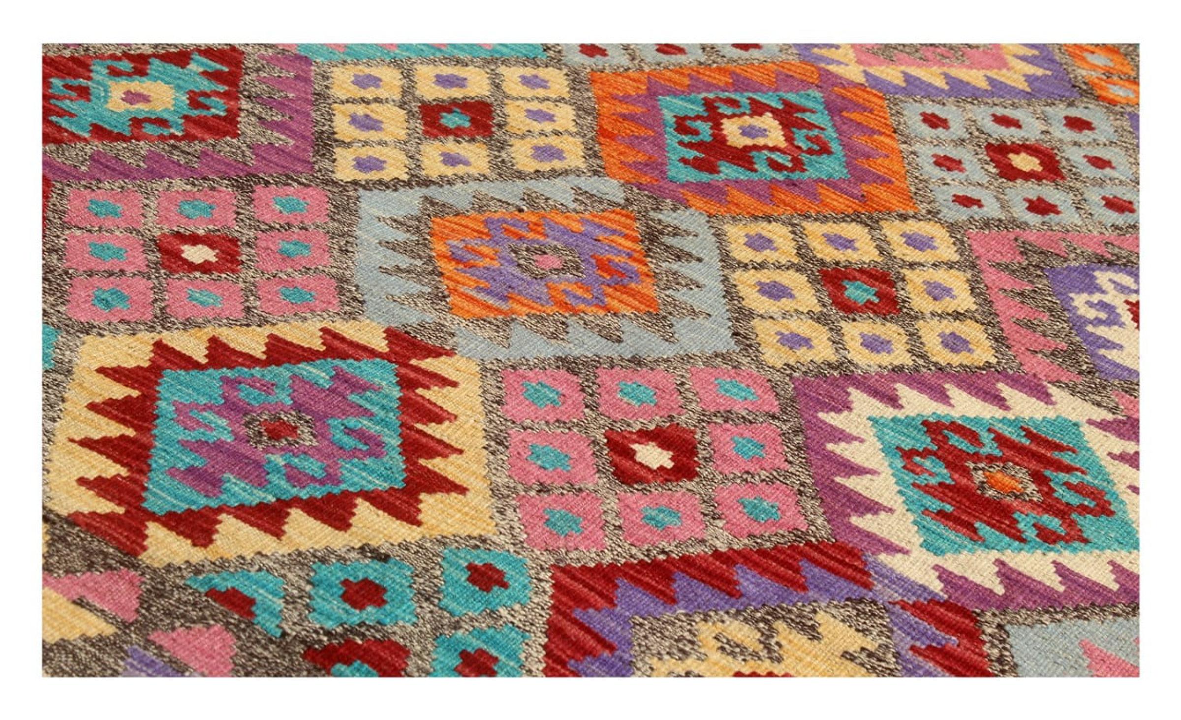 This rug was made as a flat weave by hand on a loom. Flatweave is the term used to describe rugs that have no pile. As the name promises, these rugs are woven and not knotted. This results in a flat rug with a structured surface. Flatweaves are not as soft and usually thinner than knotted rugs. At the same time they are much less complex to manufacture and can usually be laid out from both sides (front and back). Their patterns are usually geometric, which is determined by the fabric.