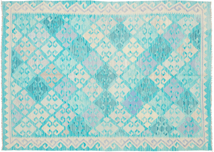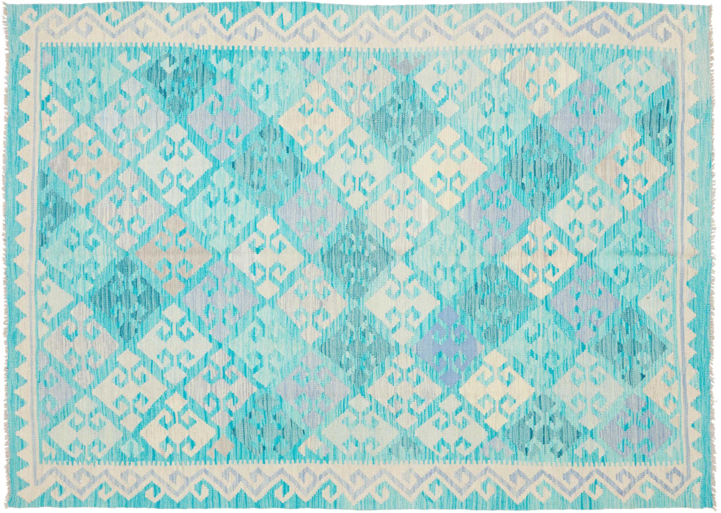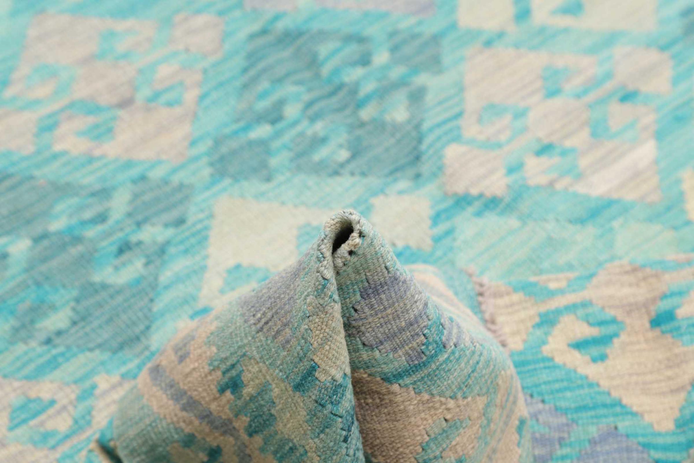 This rug was made as a flat weave by hand on a loom. Flatweave is the term used to describe rugs that have no pile. As the name promises, these rugs are woven and not knotted. This results in a flat rug with a structured surface. Flatweaves are not as soft and usually thinner than knotted rugs. At the same time they are much less complex to manufacture and can usually be laid out from both sides (front and back). Their patterns are usually geometric, which is determined by the fabric.