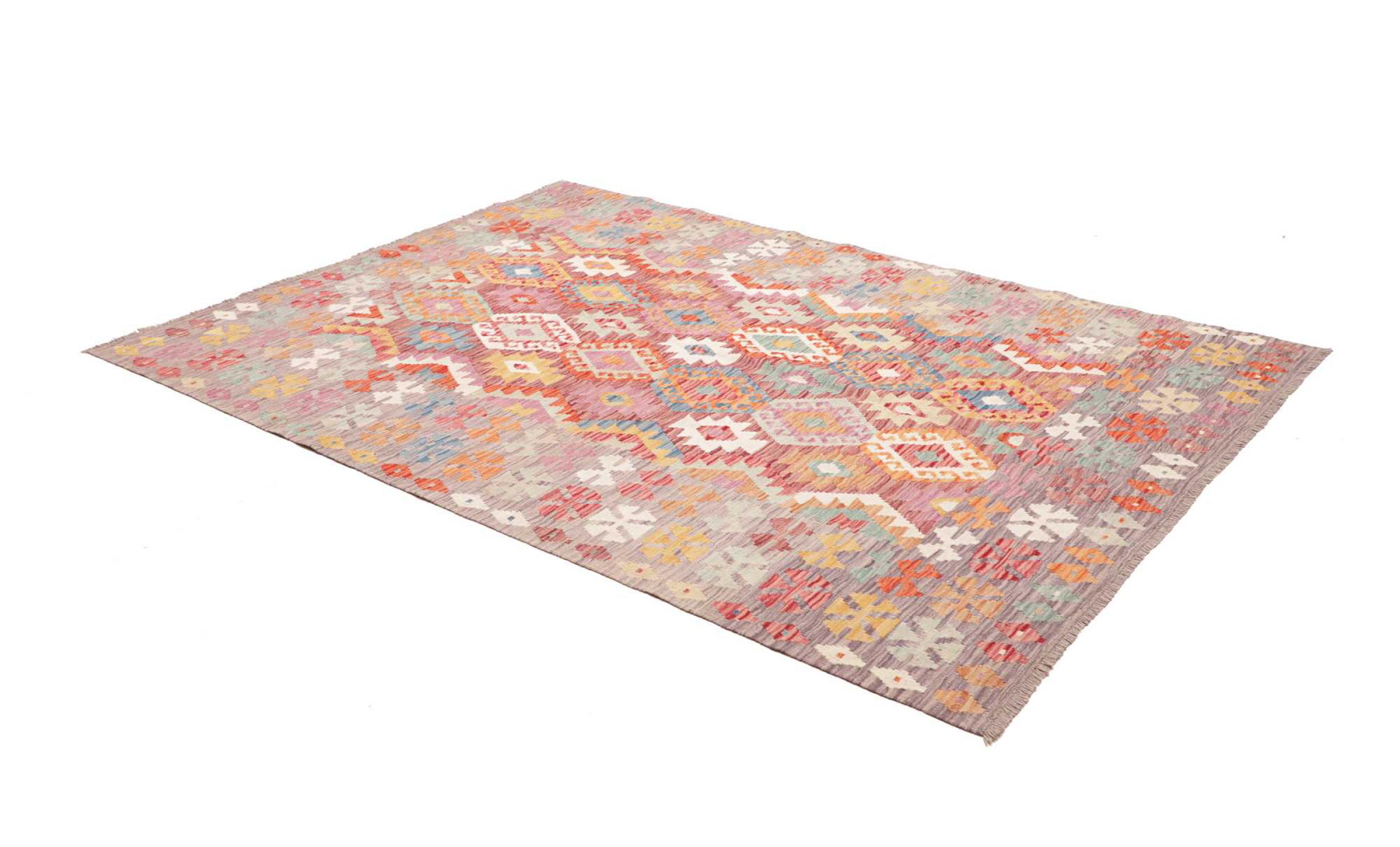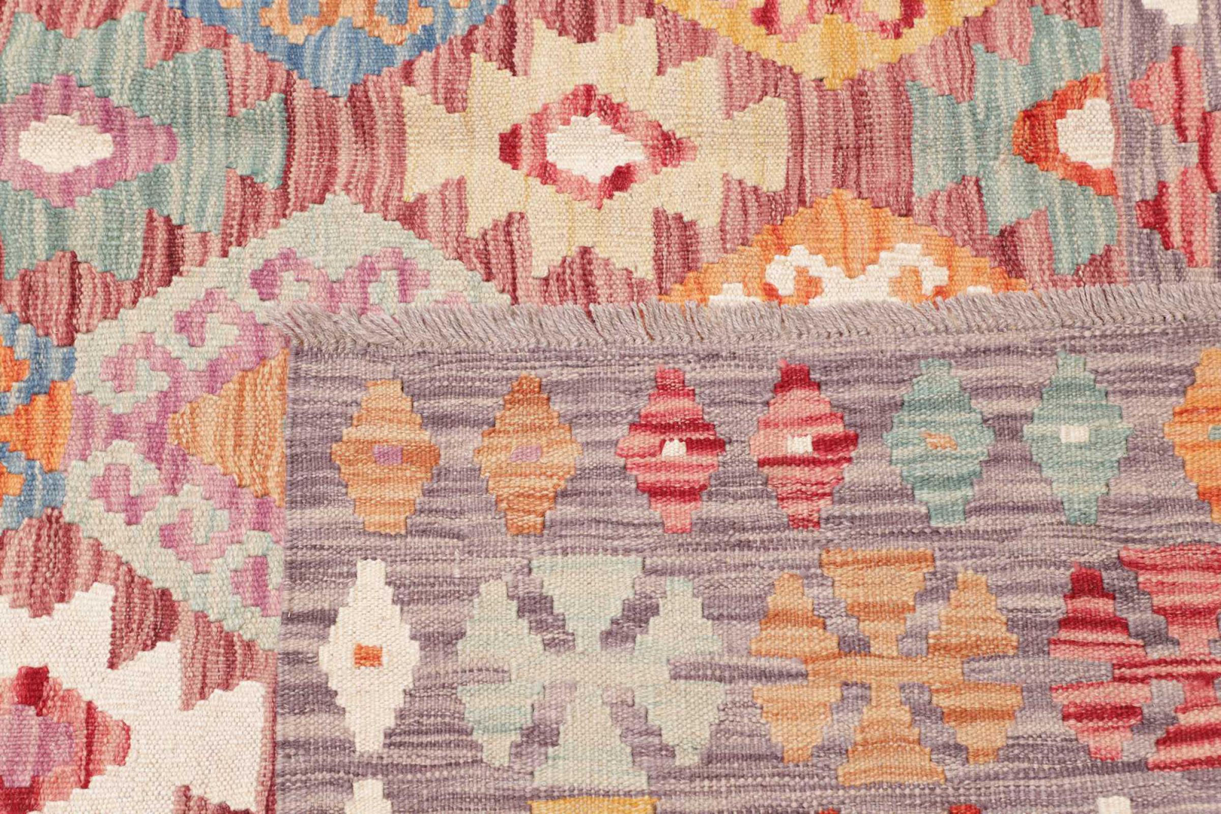 This rug was made as a flat weave by hand on a loom. Flatweave is the term used to describe rugs that have no pile. As the name promises, these rugs are woven and not knotted. This results in a flat rug with a structured surface. Flatweaves are not as soft and usually thinner than knotted rugs. At the same time they are much less complex to manufacture and can usually be laid out from both sides (front and back). Their patterns are usually geometric, which is determined by the fabric.